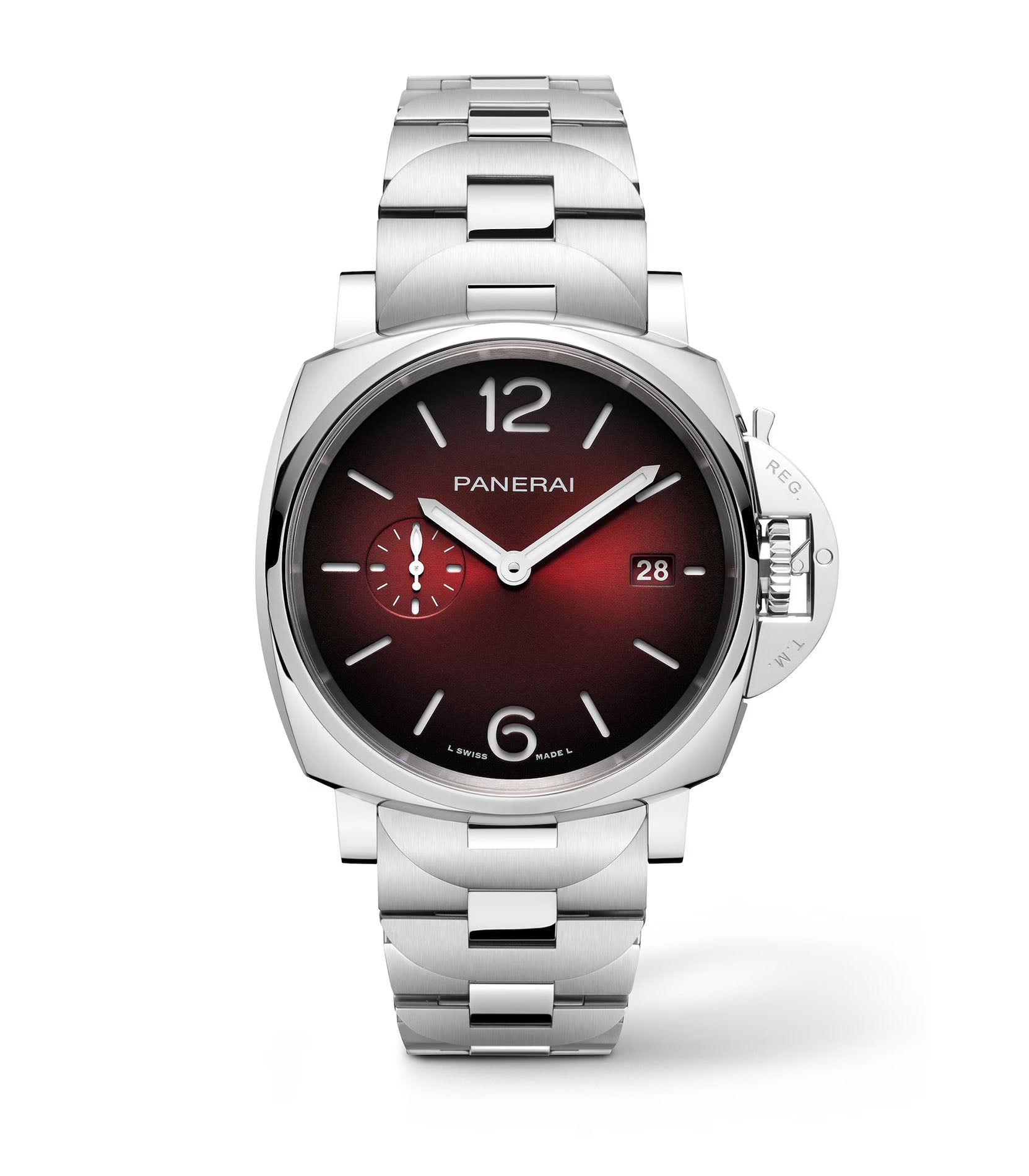 Functions are shown on a burgundy dial with luminous hands and hour markers. These functions include hours, minutes, sub-seconds, and date.