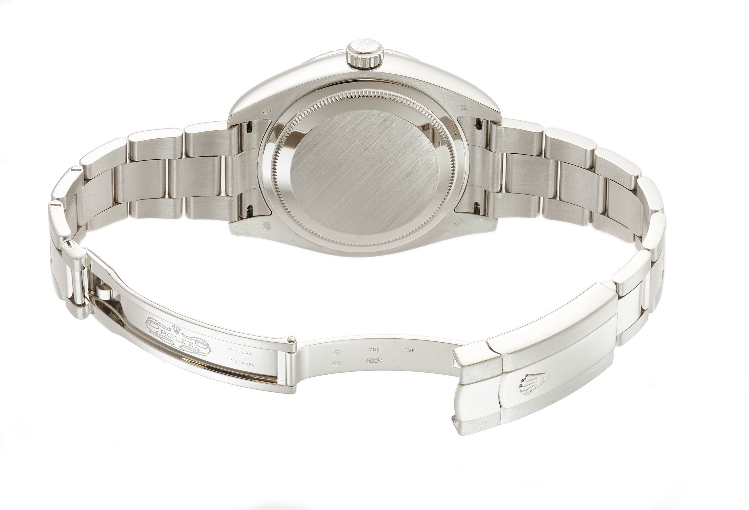 The case is made of high-polish finished 18k white gold. Case back (combination of high-polish and brush finished 18k white gold) and crown (18k white gold) are both screw-down. The fluted 18k white gold rotating bezel is of high-polish finish and is also used to engage different setting modes bidirectionally. The oyster bracelet, which is also of 18k white gold, is comprised of high-polish finished center links and brush-finished outer links, fits about a 7.5 inch wrist.