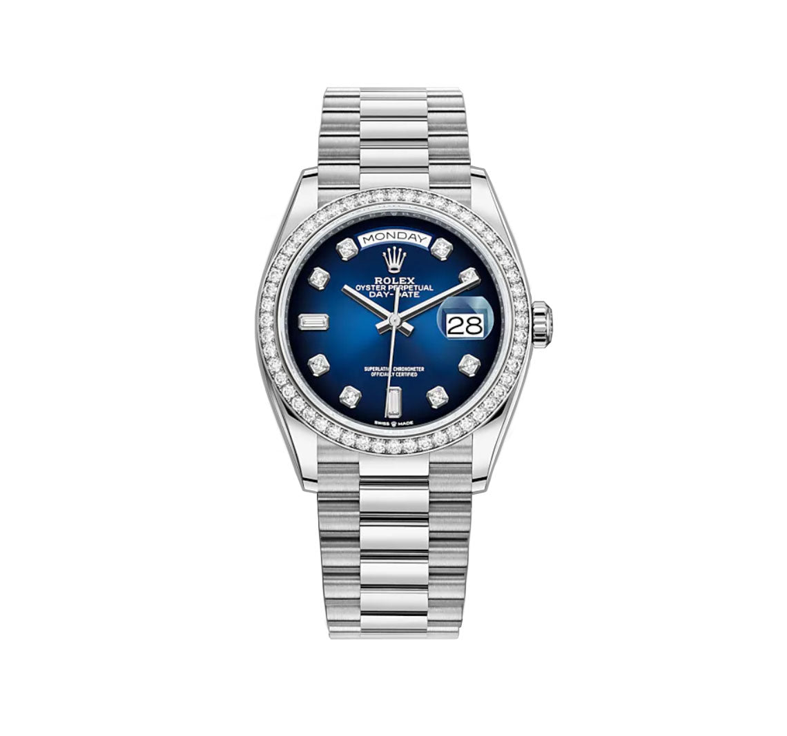 36mm 18k White Gold President Diamond Bezel Blue Ombré Baguette Diamond Dial