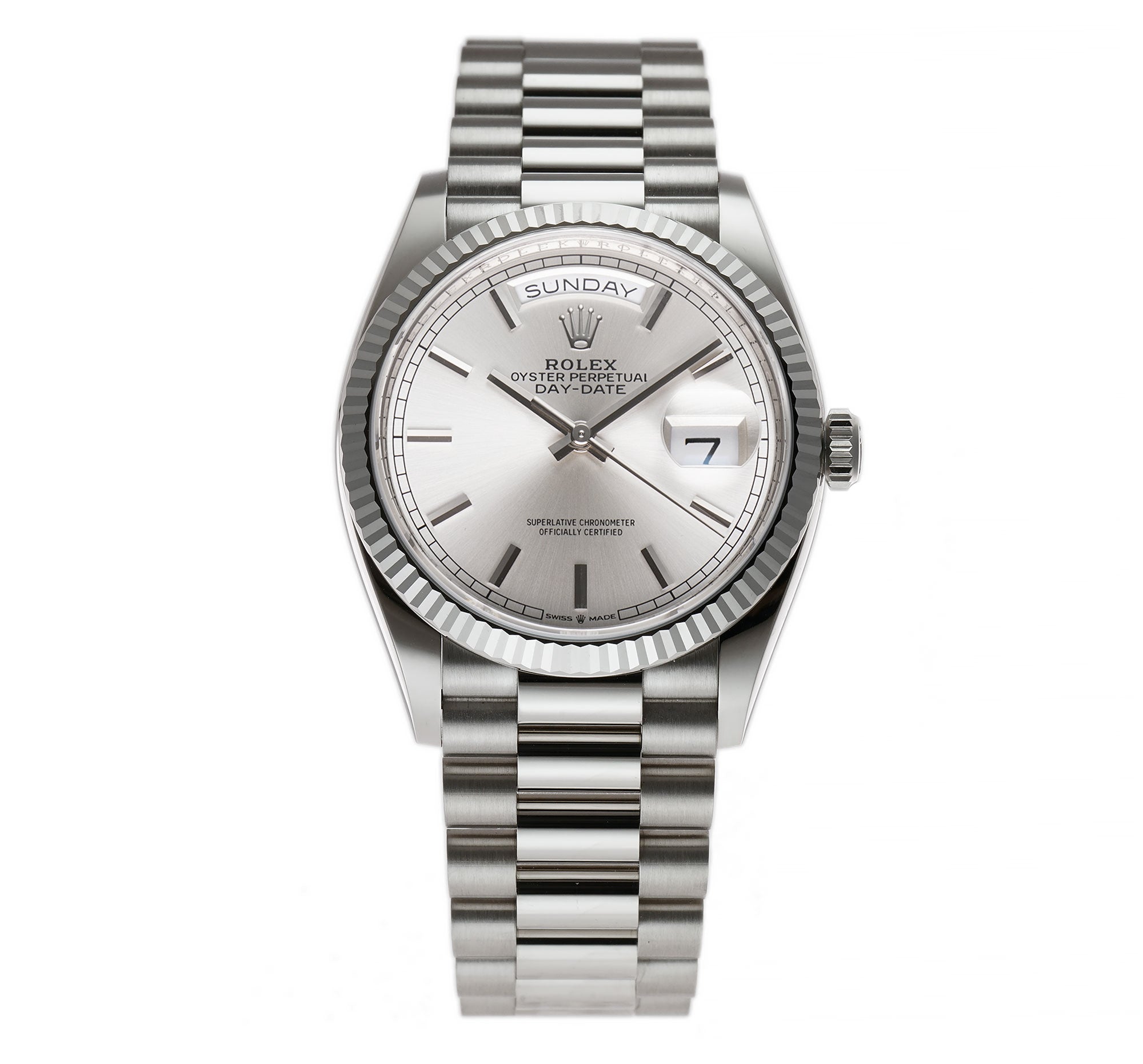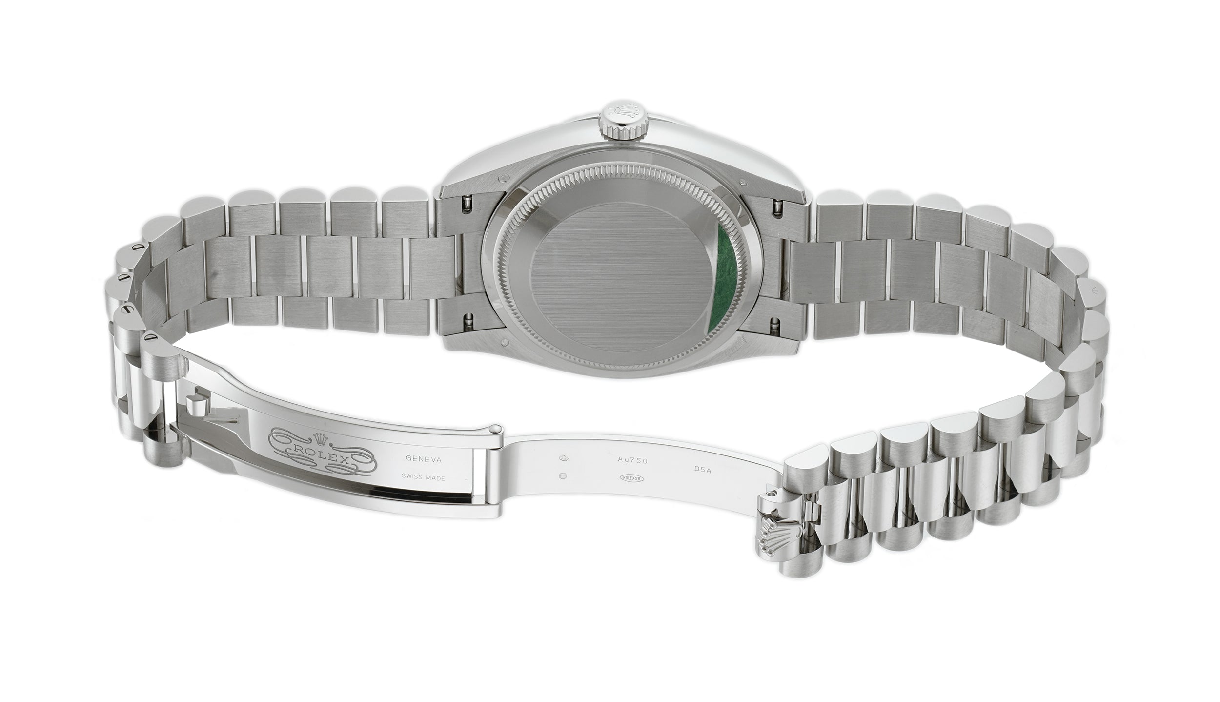 Case is made of high-polish finished 18k white gold and mounted atop the case is a high-polish finished 18k white gold fluted bezel. Screwed in to the case is an 18k white gold crown as well as an 18k white gold solid case back with mixed combination of high and satin polish finishes. The presidential bracelet is of the same material, with high-polish finished center links and brush-finished outer links.