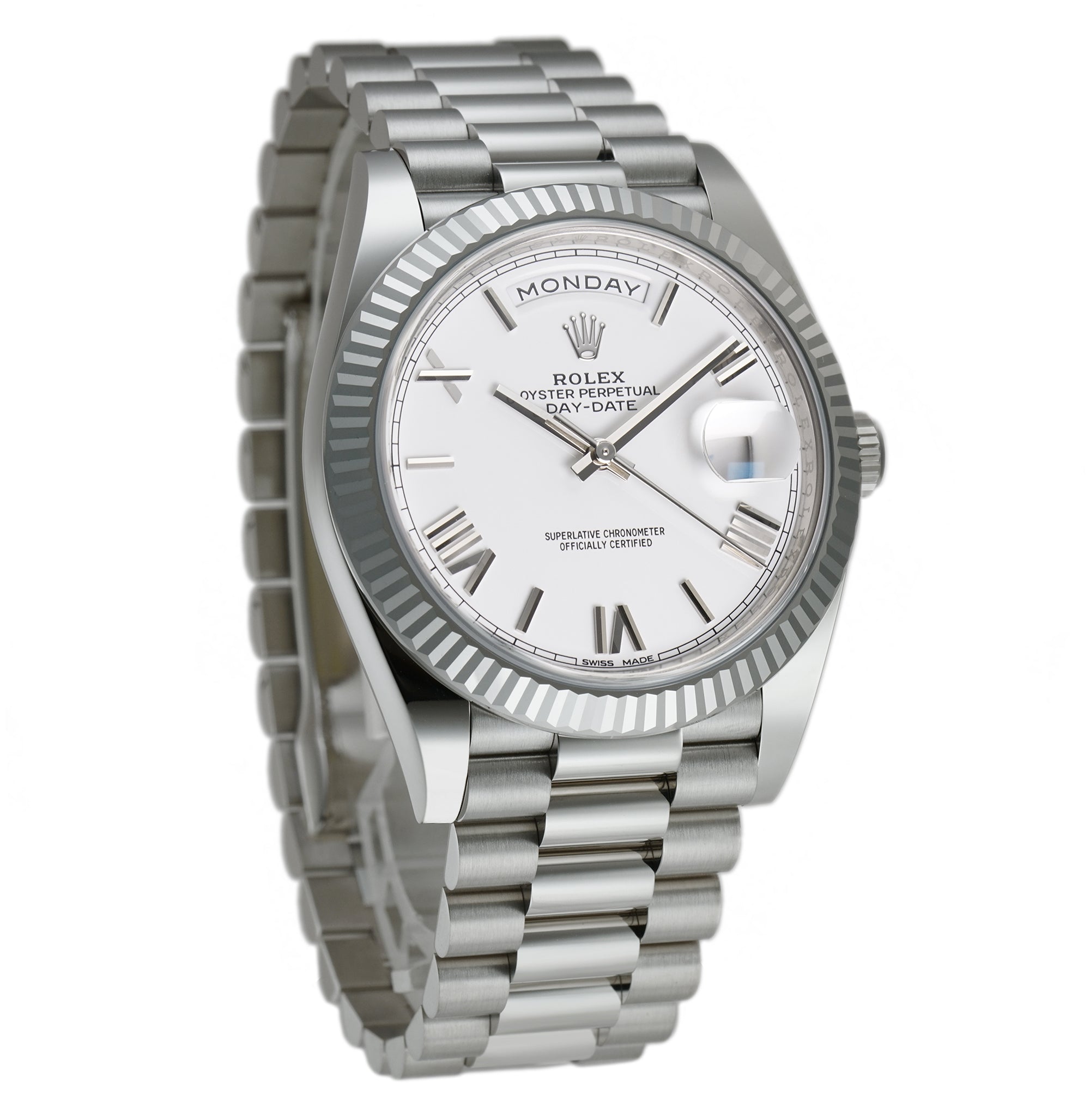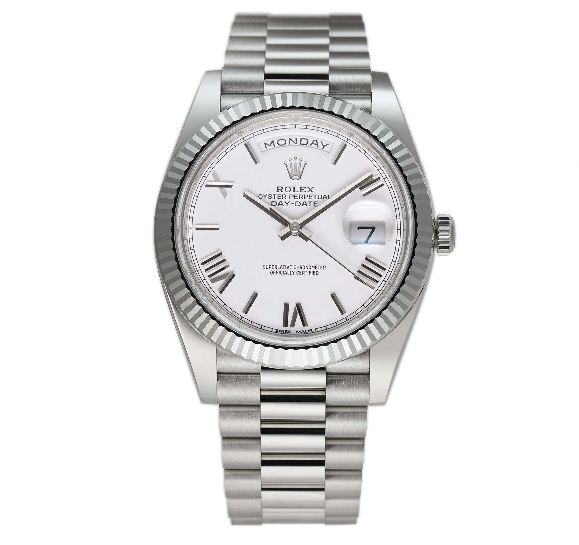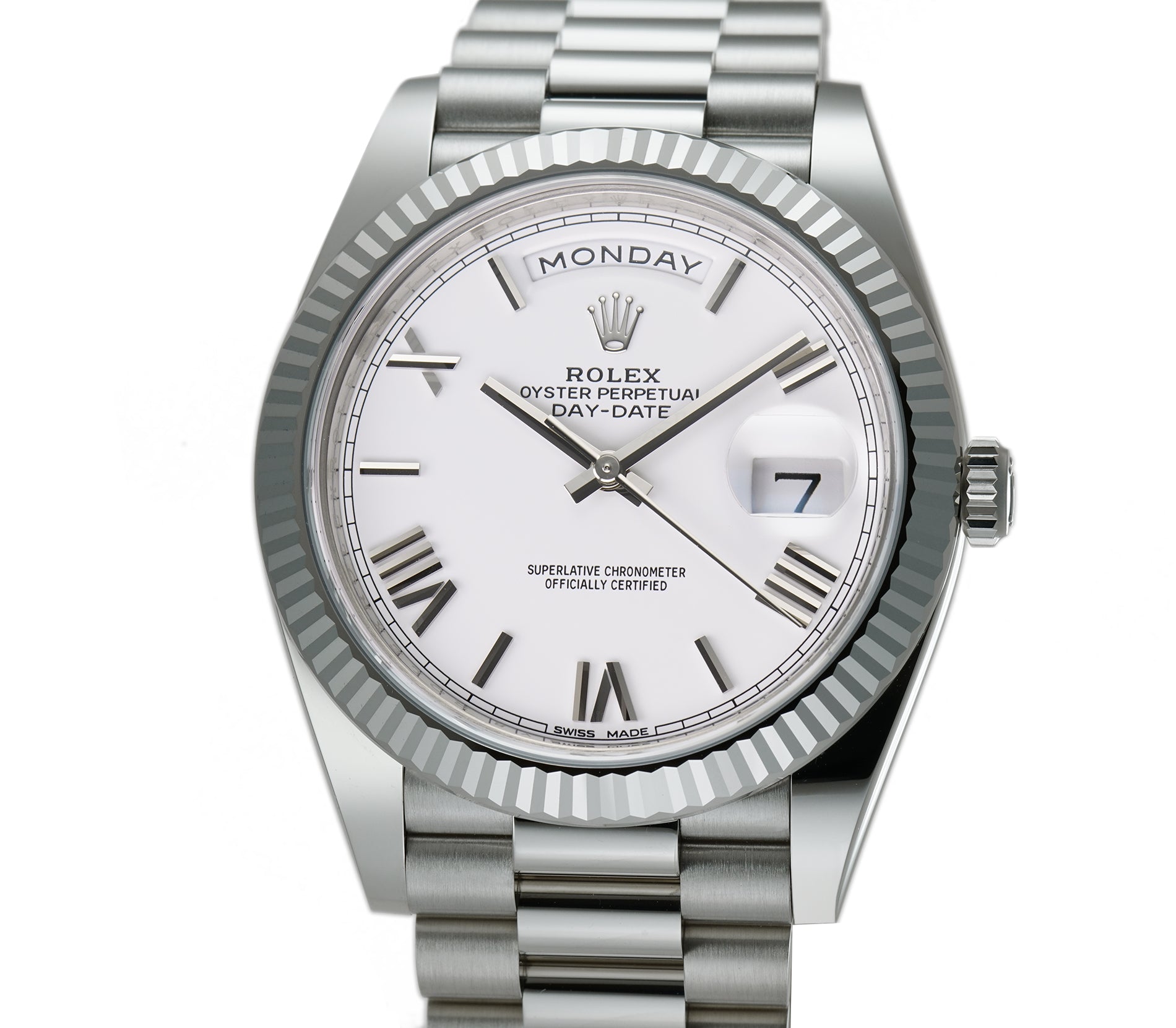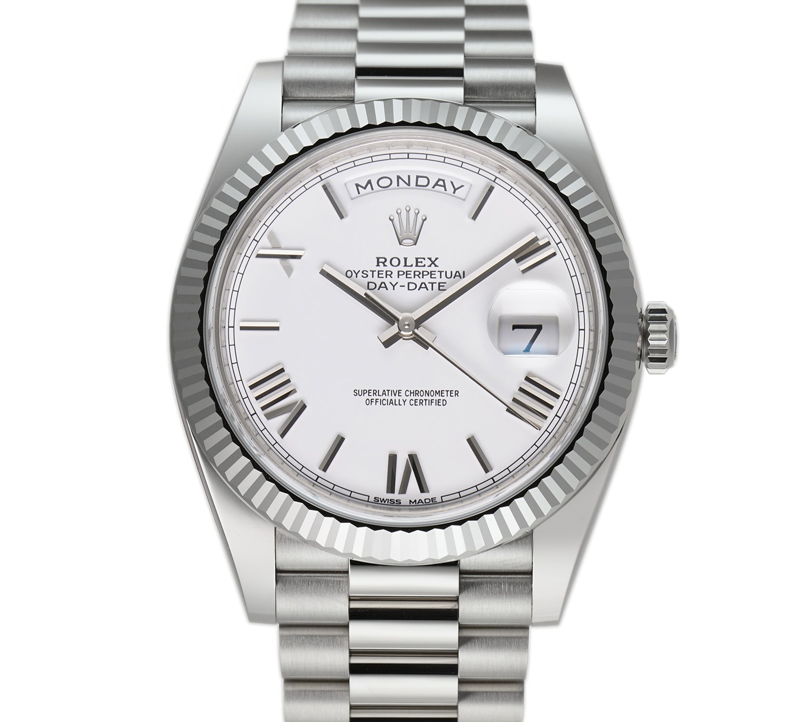 Case is made of high-polish finished 18k white gold as is the fluted bezel that is mounted atop. Screwed into the case is a solid 18k white gold crown and a solid 18k white gold case back. The presidential bracelet is of the same material, with high-polish finished center links and brush-finished outer links.