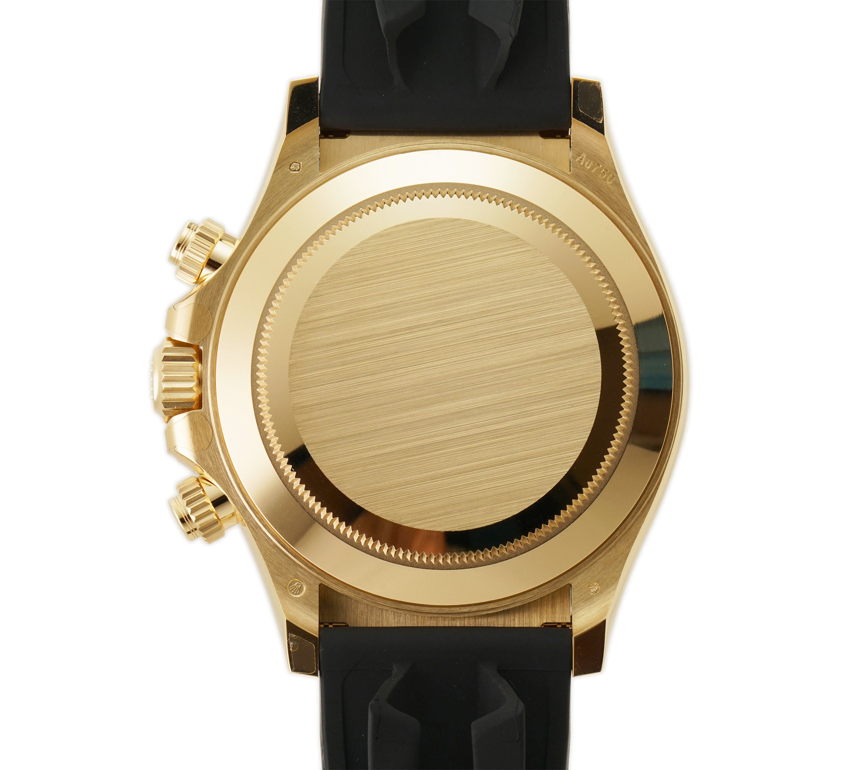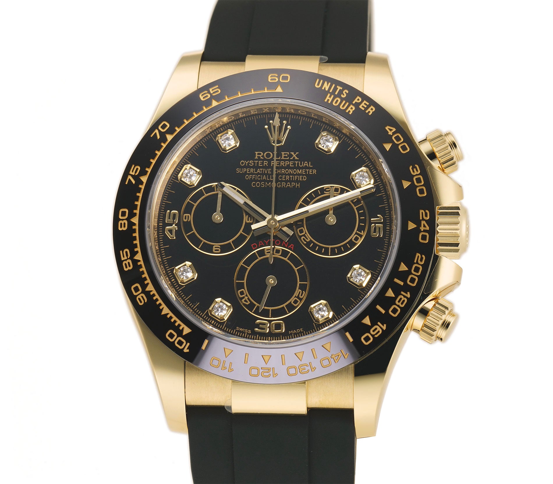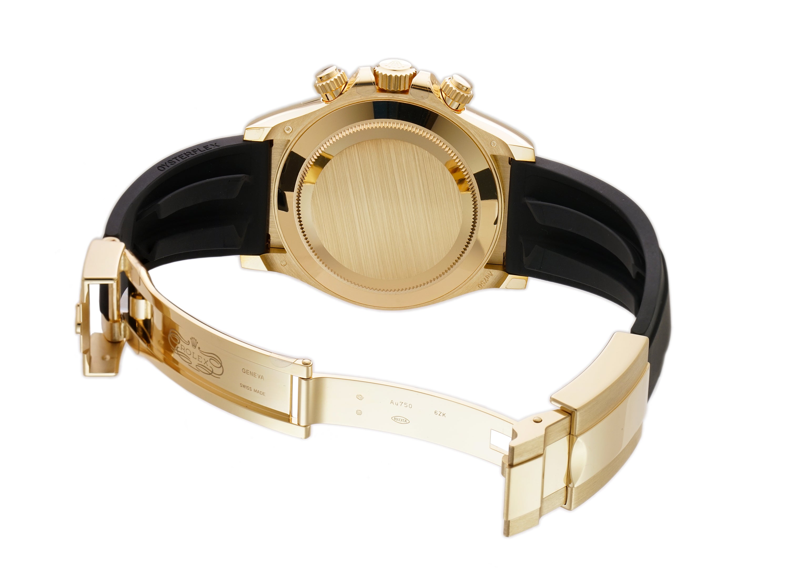 Case is made of high-polish finished 18k yellow gold as are the push-buttons and crown, but the tachymeter-scaled bezel is made of black ceramic. As for the strap, it comes with a black oysterflex band that is mounted on brush-finished 18k yellow gold end-pieces.