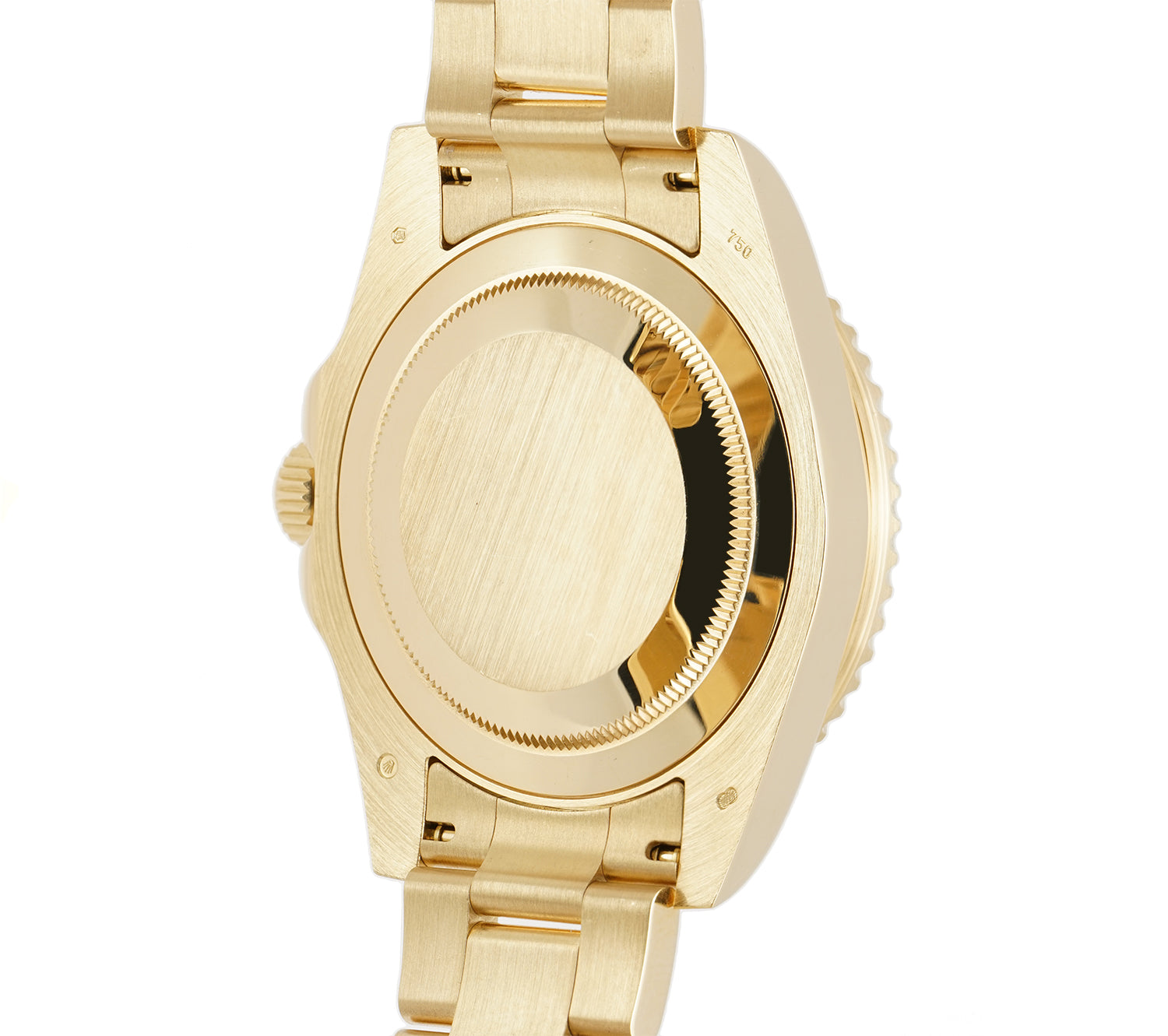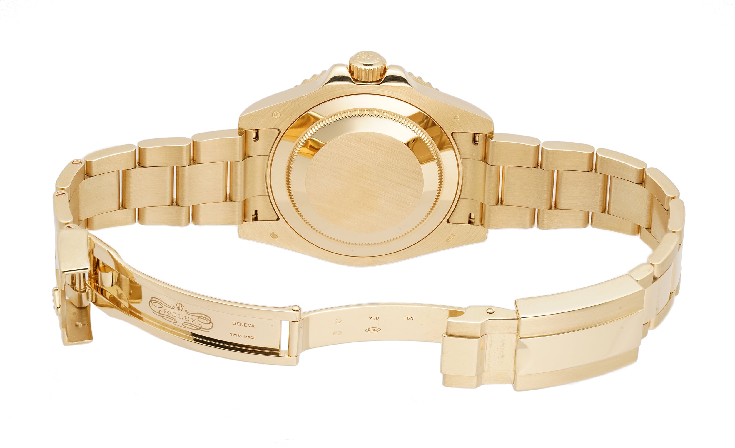 Case is made of 18k yellow gold with brush-finished on the lugs, on the back of the lugs and center of the case back. The rest of the case is high-polish finished. Both crown and case back are screw-down. Mounted atop the case is an 18k yellow gold rotatable bezel equipped with a 24-hour black ceramic bezel insert. As for the oyster bracelet, it is also of 18k yellow gold with brush-finished outer links and high-polish finished center links.