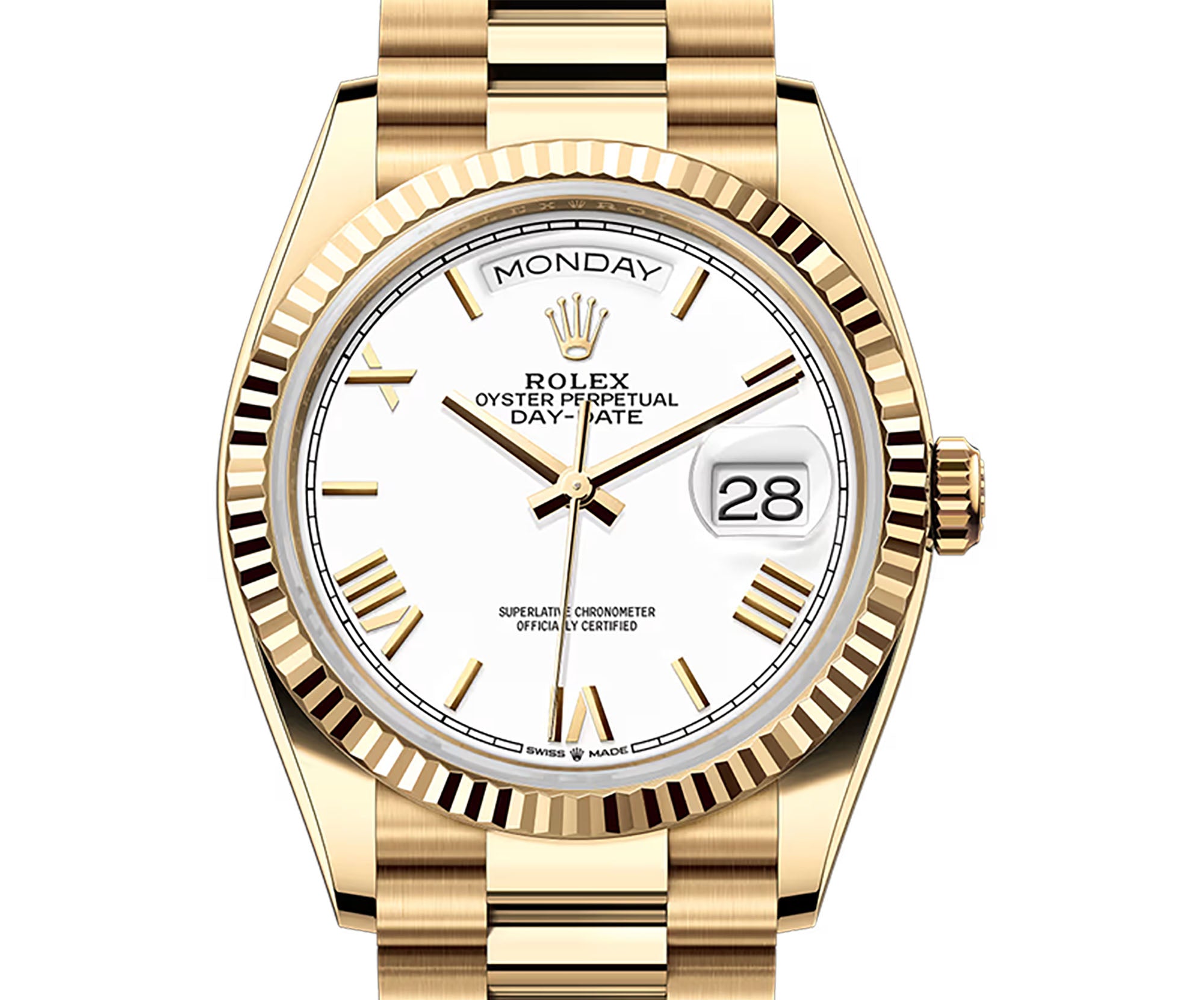 Case is made of high-polish finished 18k yellow gold and mounted atop the case is a high-polish finished fluted 18k yellow gold bezel. Screwed in to the case is an 18k yellow gold crown as well as an 18k yellow gold solid case back with mixed combination of high and satin polish finishes. The presidential bracelet is of the same material, with high-polish finished center links and brush-finished outer links.
