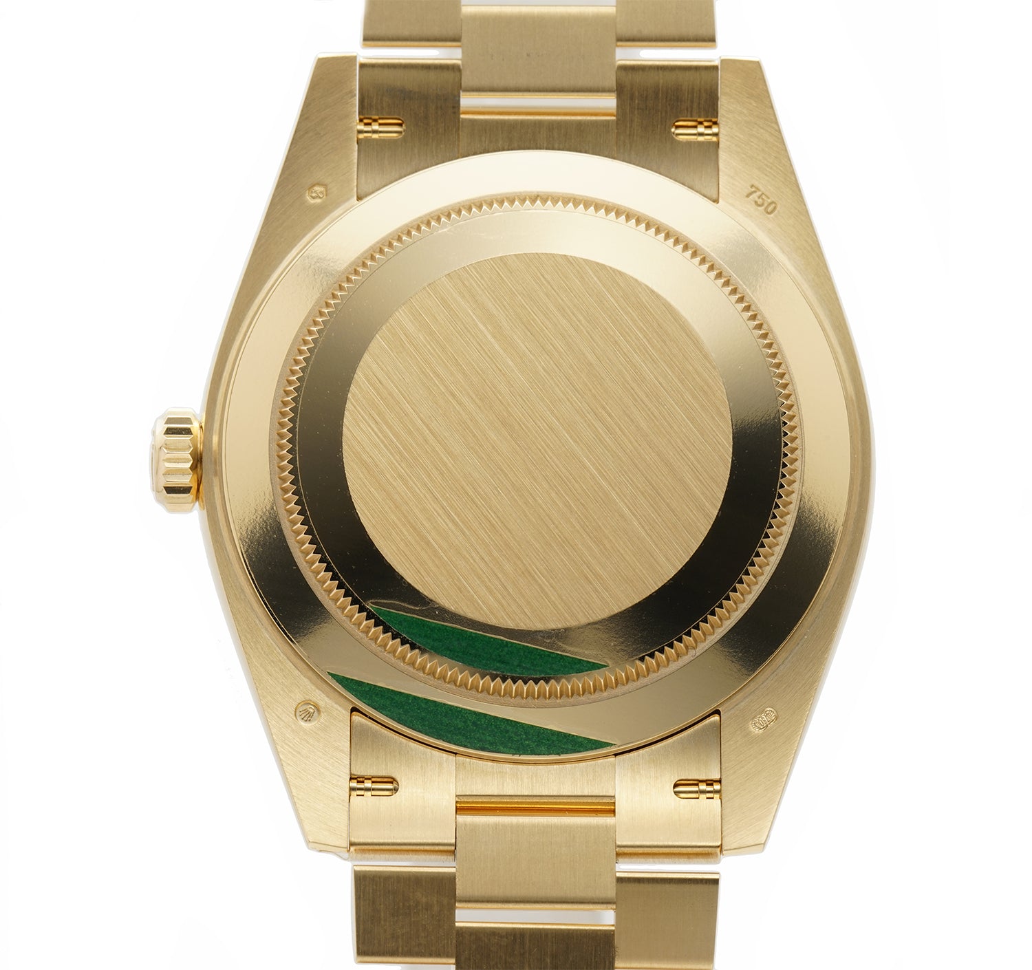 Case is made of high-polish finished 18k yellow gold and mounted atop the case is a high-polish finished 18k yellow diamond-set bezel. Screwed into the case is an 18k yellow gold crown as well as an 18k yellow gold solid case back. The president bracelet is comprised of 18k yellow gold, high-polish finished center links and brush-finished outer links.