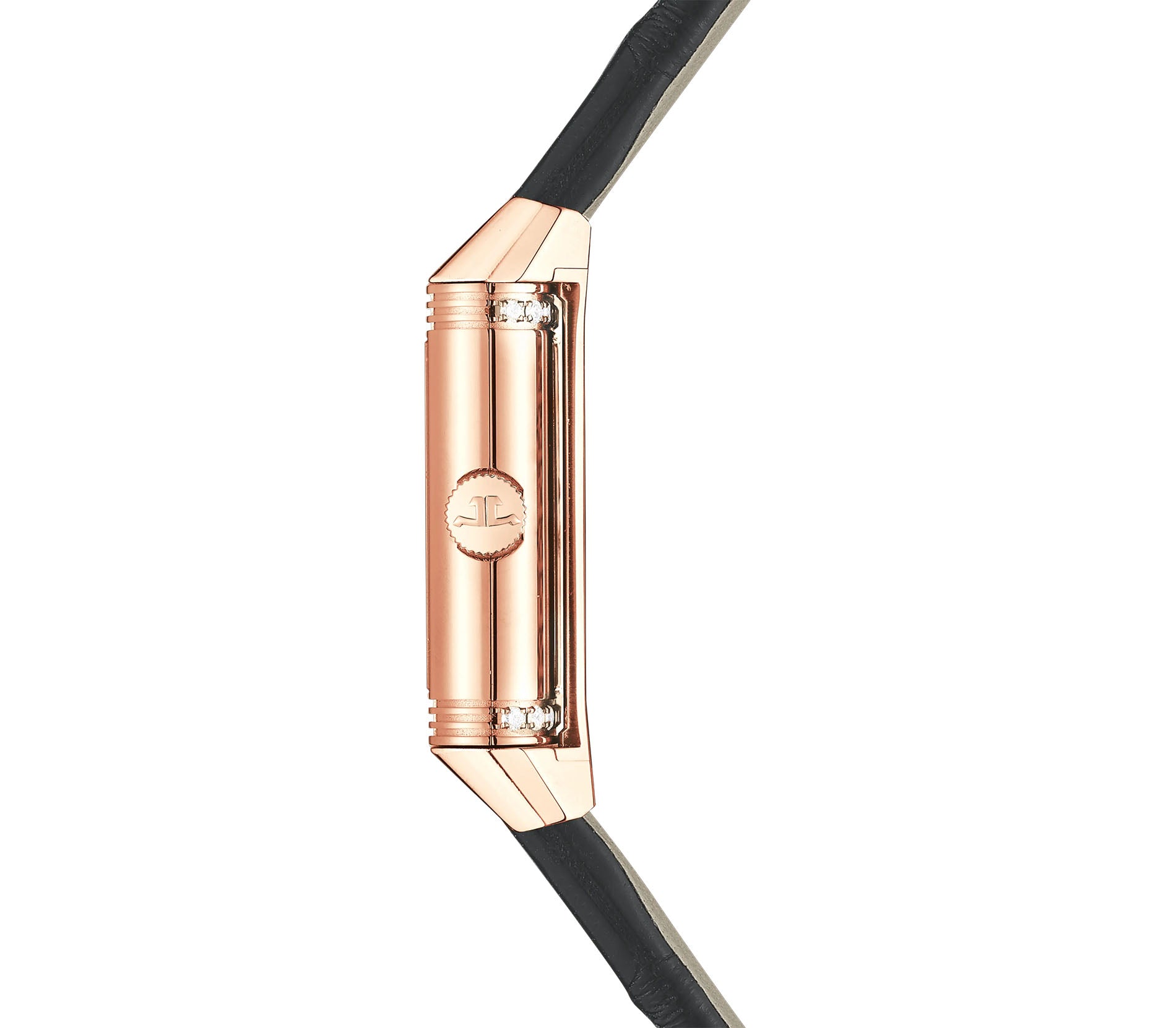 The case is made of a mirror finish 18k rose gold including the crown. On the reverse side there are diamonds above and below the dial. Paired with the watch is a black leather strap and an 18k rose gold pin buckle.