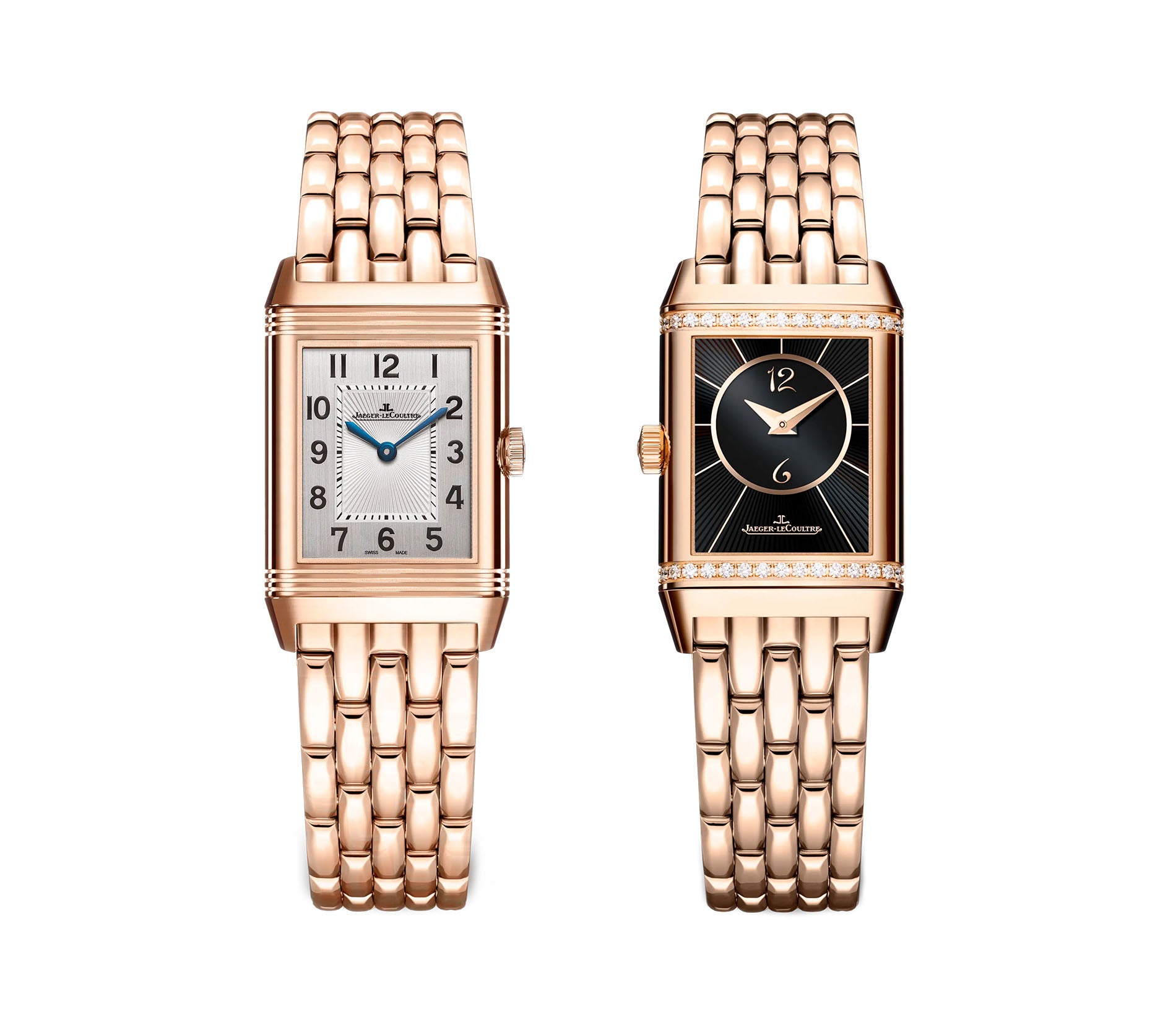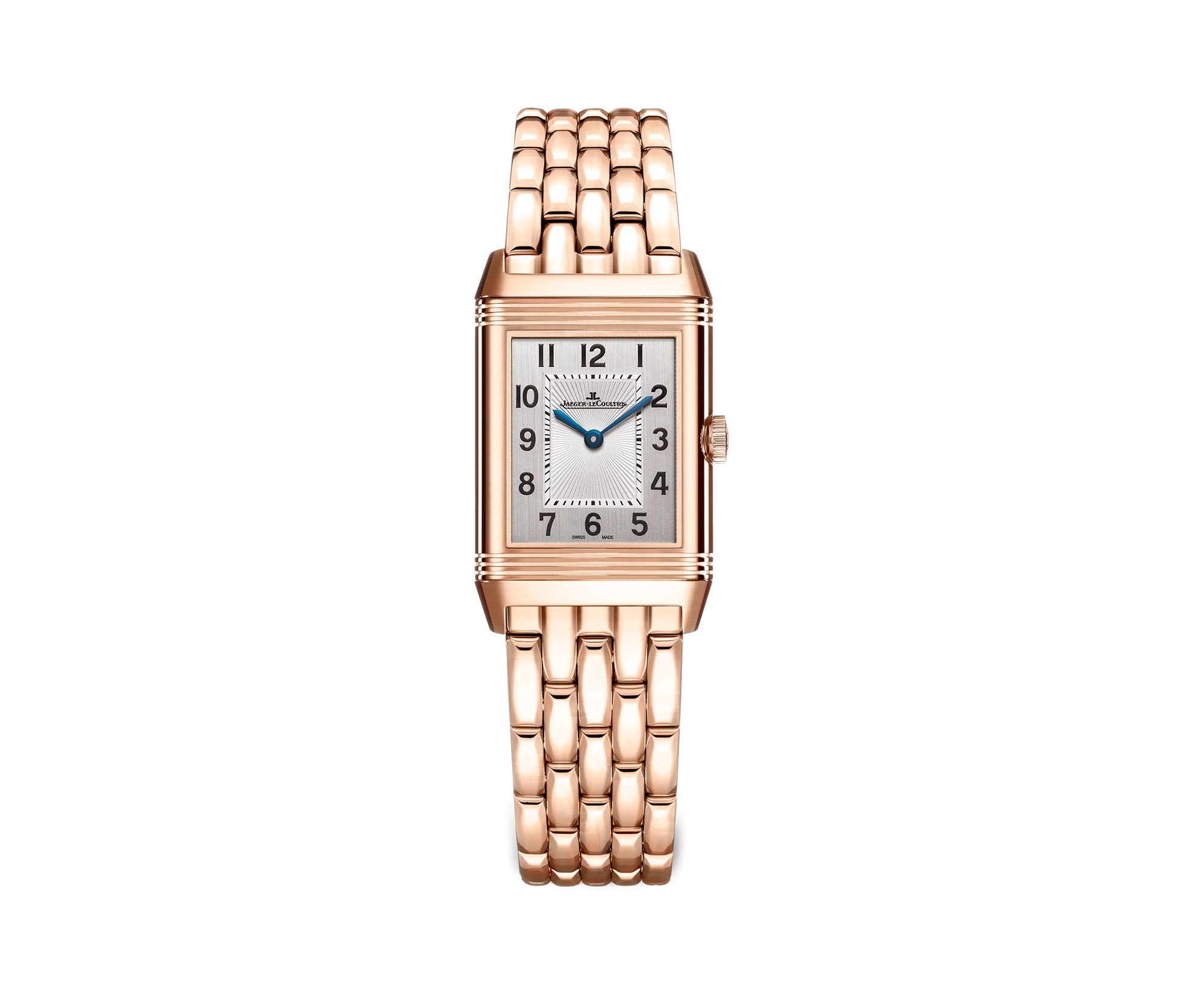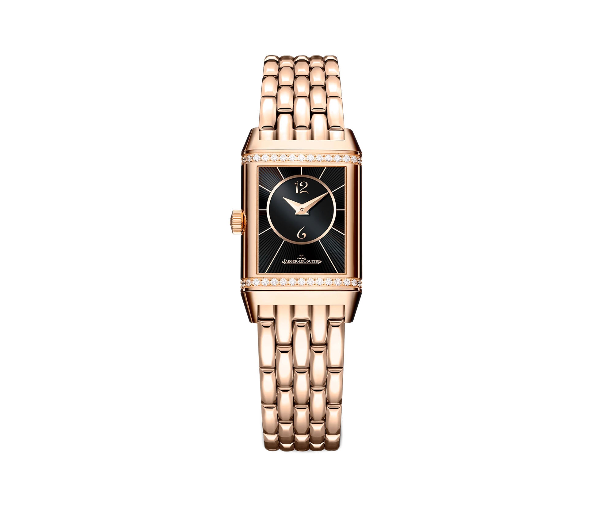 The case is made of a mirror finish 18k rose gold including the crown. Factory diamond set is placed on the reverse side. The watch is paired with an 18k rose gold bracelet with a mirror finish.