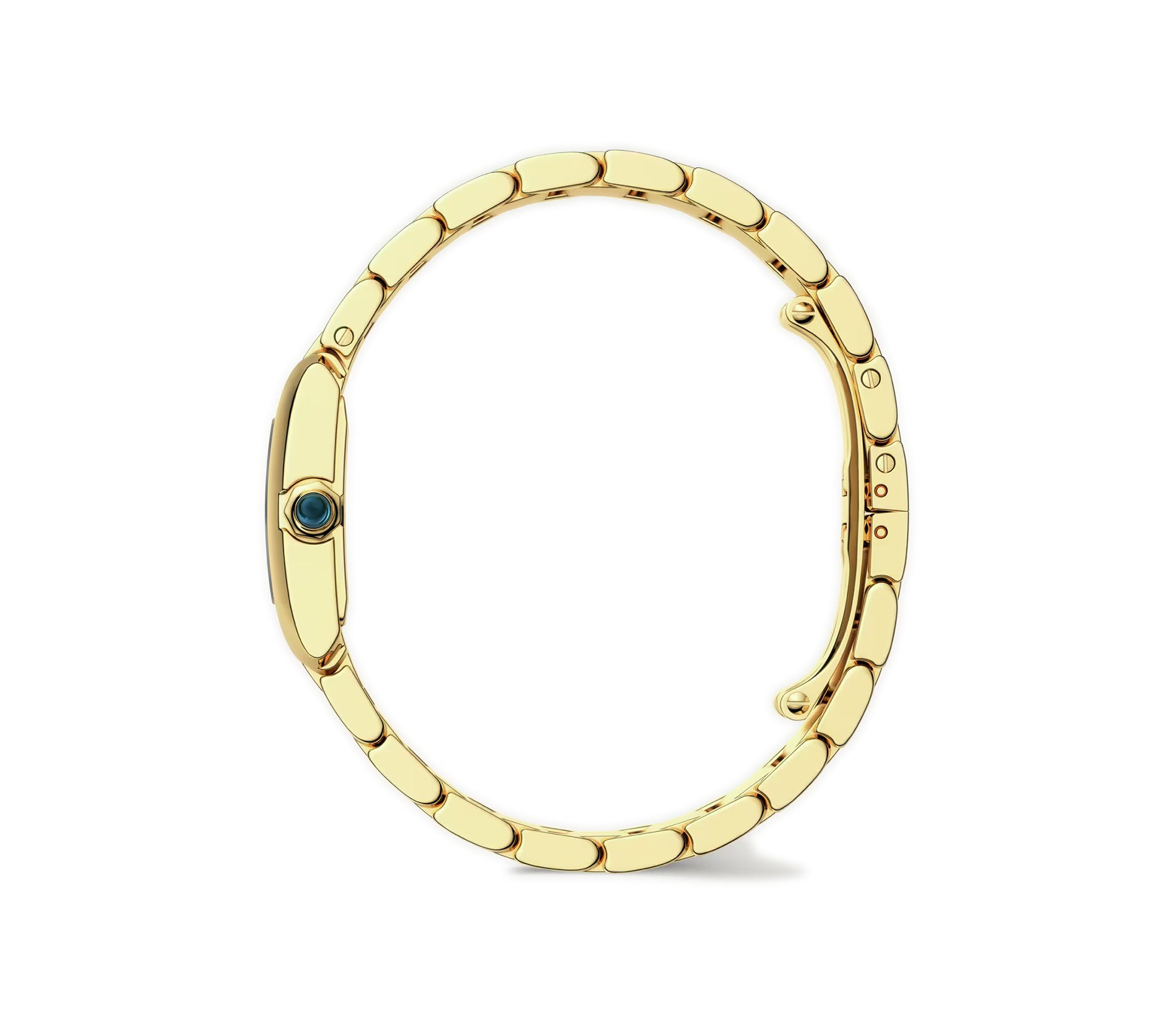 Case is made of a high polished finish 18k yellow gold including the crown with the blue sapphire cabochon. This watch is paired with a high polished finish 18k yellow gold bracelet and an 18k yellow gold bracelet.