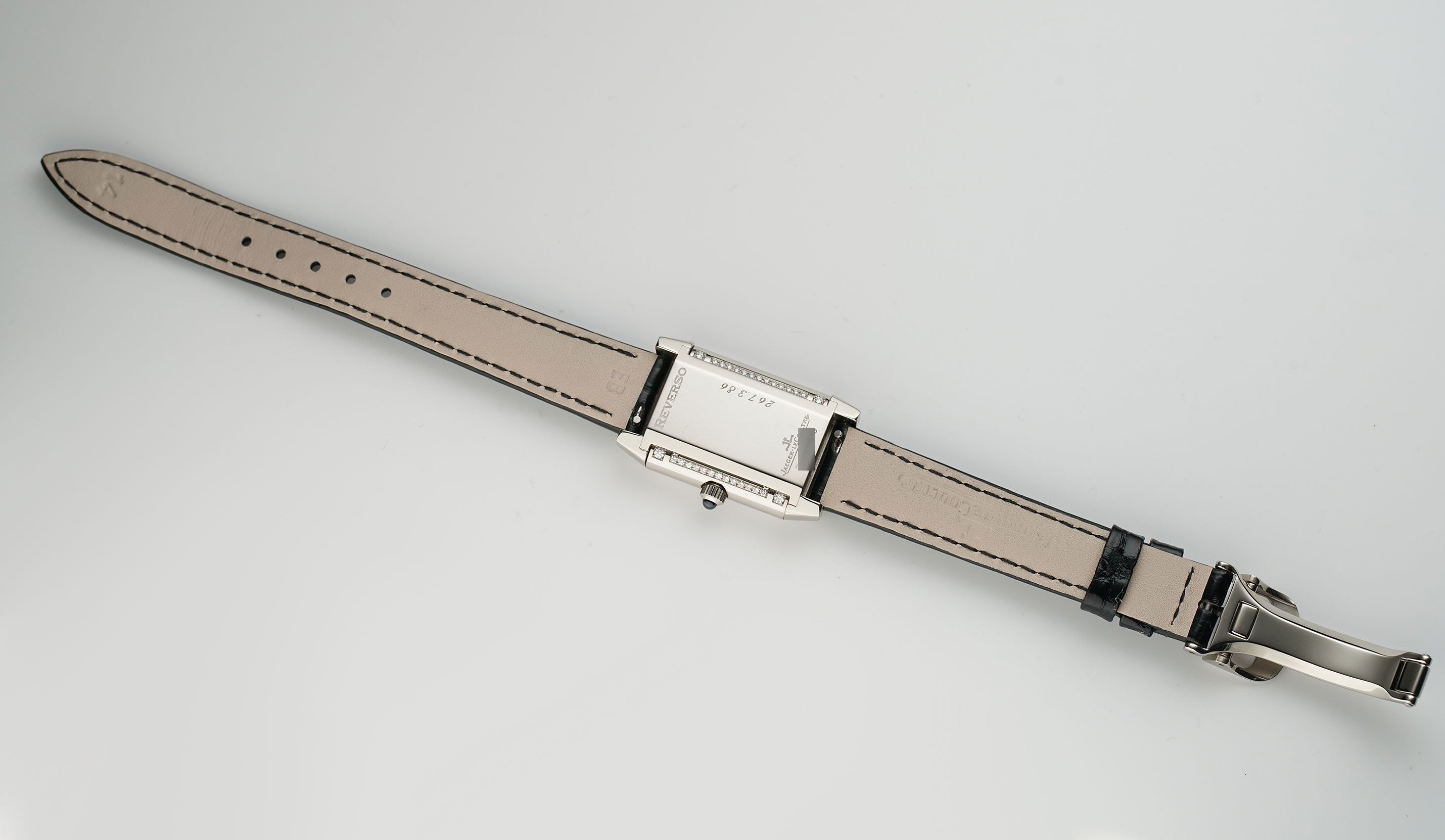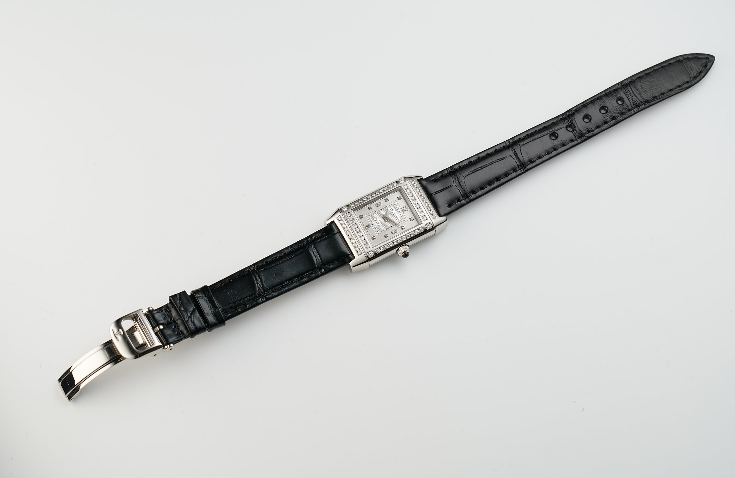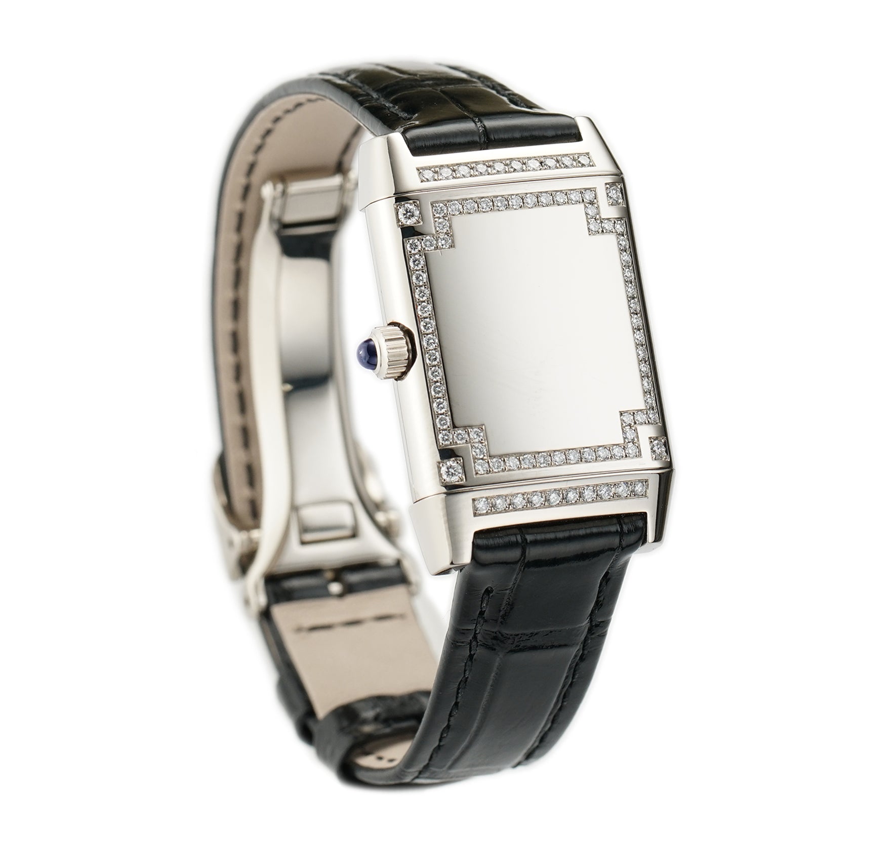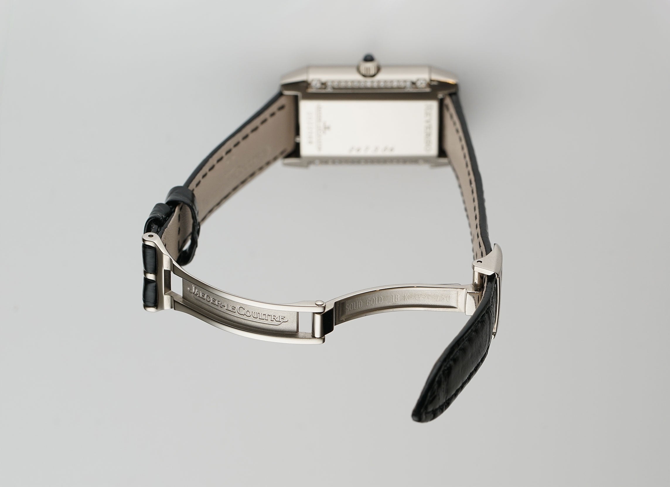 The case is of 18k white gold, displaying a mostly mirror finish with the exception of the inner carriage which has a spun finish. Both sides are JLC factory set with diamonds. The reverso side features a solid slate of 18k white gold and the diamonds act as a frame making it ideal for a personalized engraving. Currently mounted on the watch is an unworn black leather JLC strap that is paired with an 18k white gold deployment buckle.