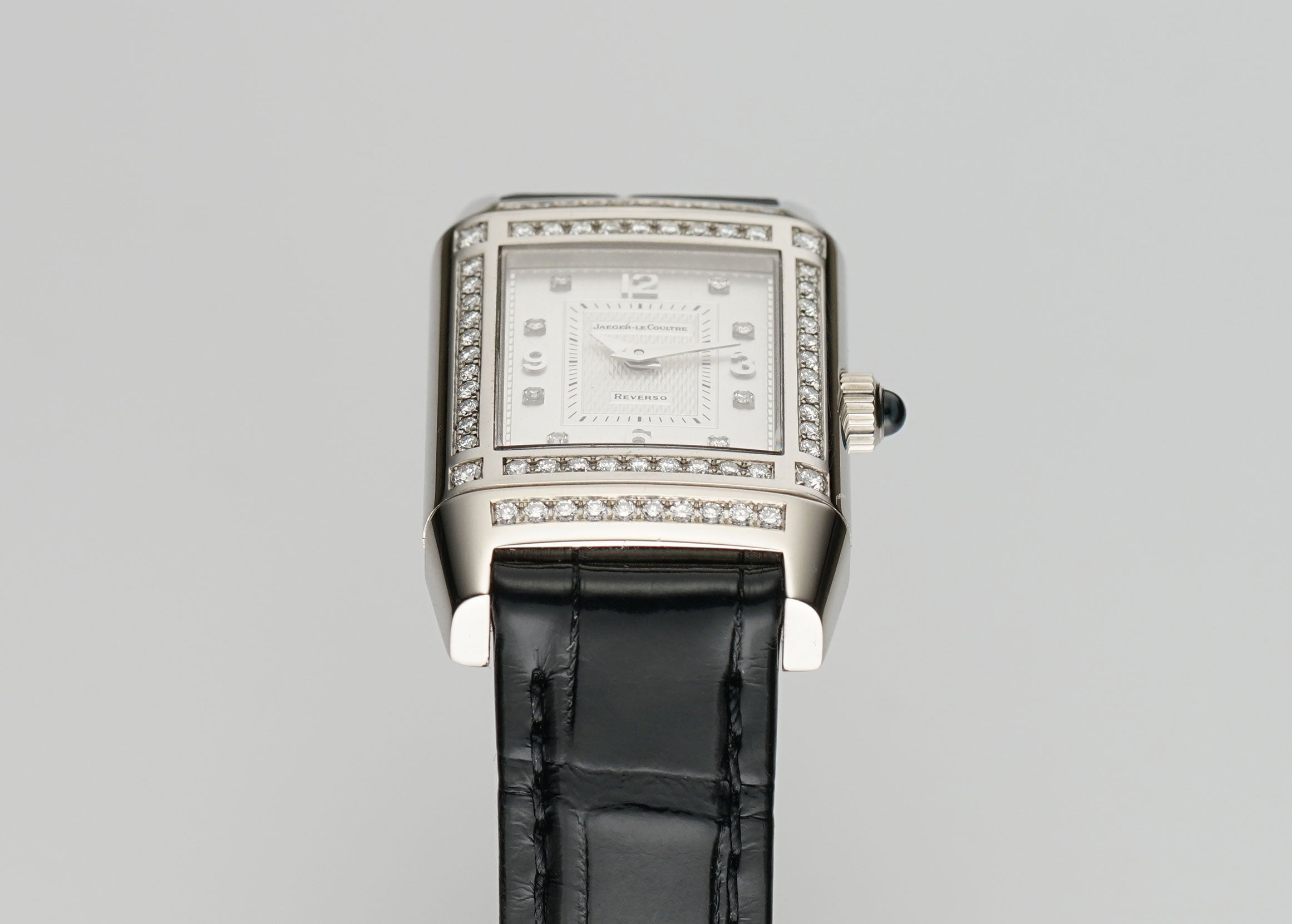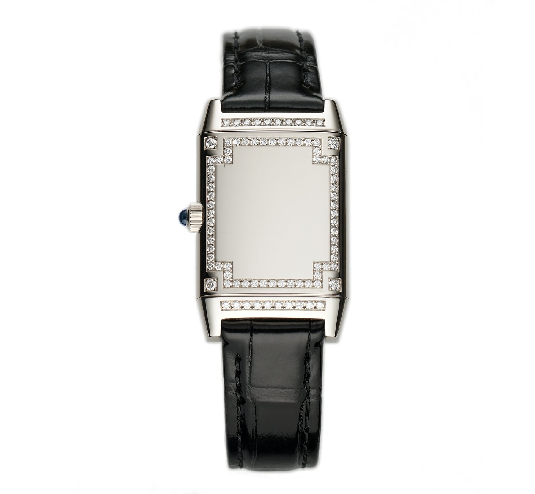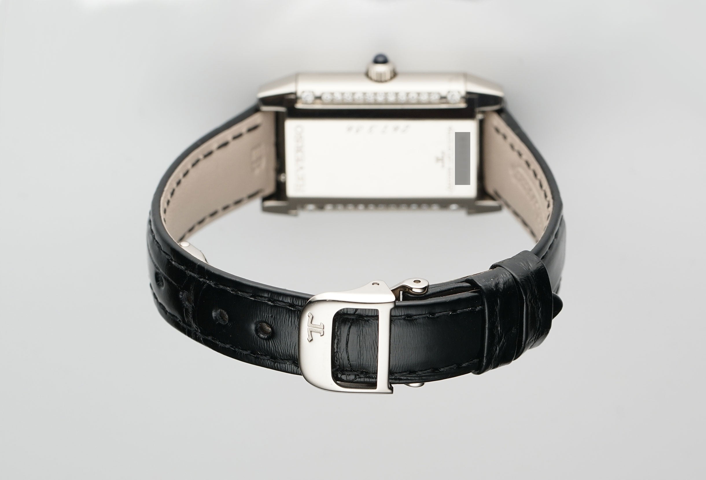 The case is of 18k white gold, displaying a mostly mirror finish with the exception of the inner carriage which has a spun finish. Both sides are JLC factory set with diamonds. The reverso side features a solid slate of 18k white gold and the diamonds act as a frame making it ideal for a personalized engraving. Currently mounted on the watch is an unworn black leather JLC strap that is paired with an 18k white gold deployment buckle.