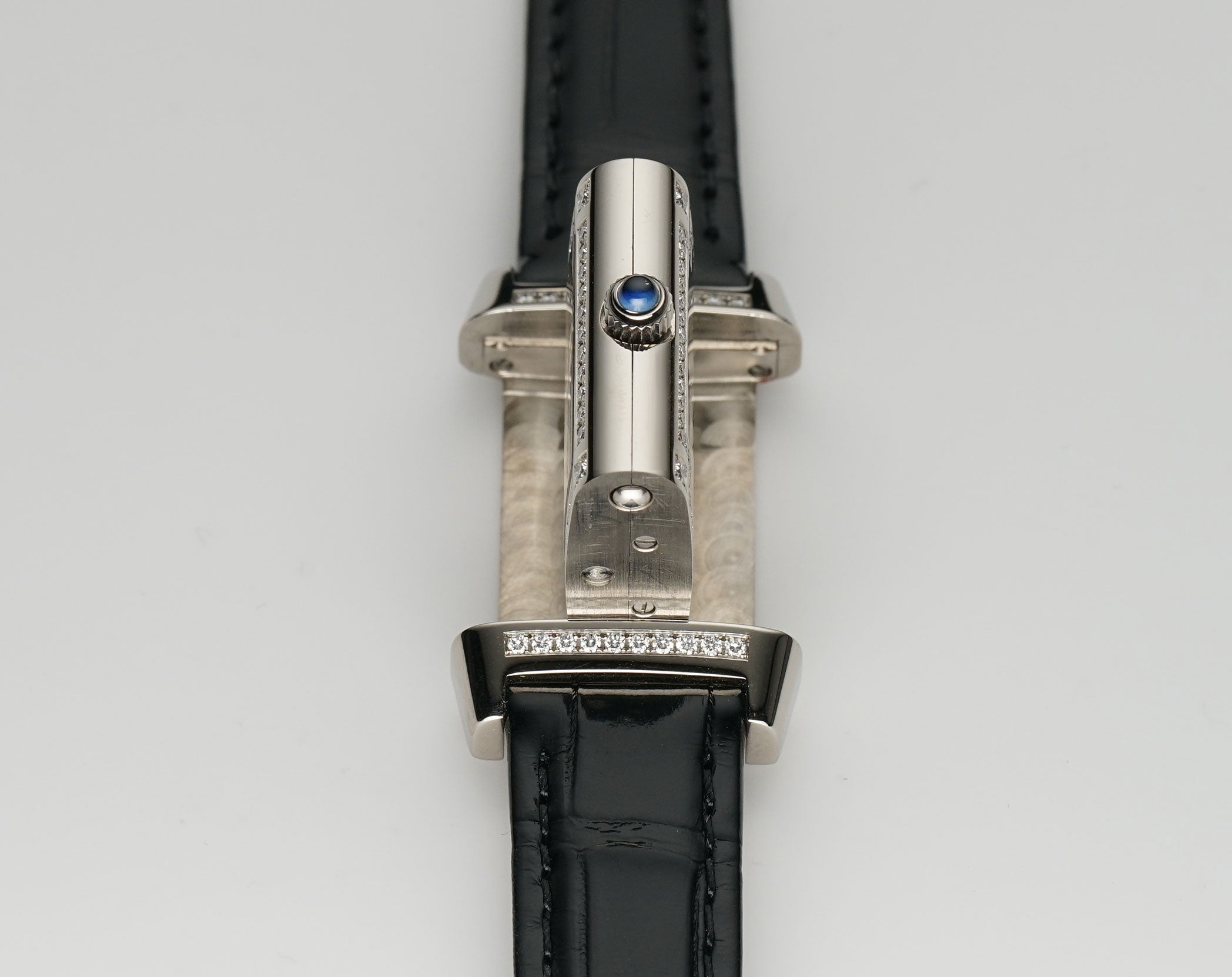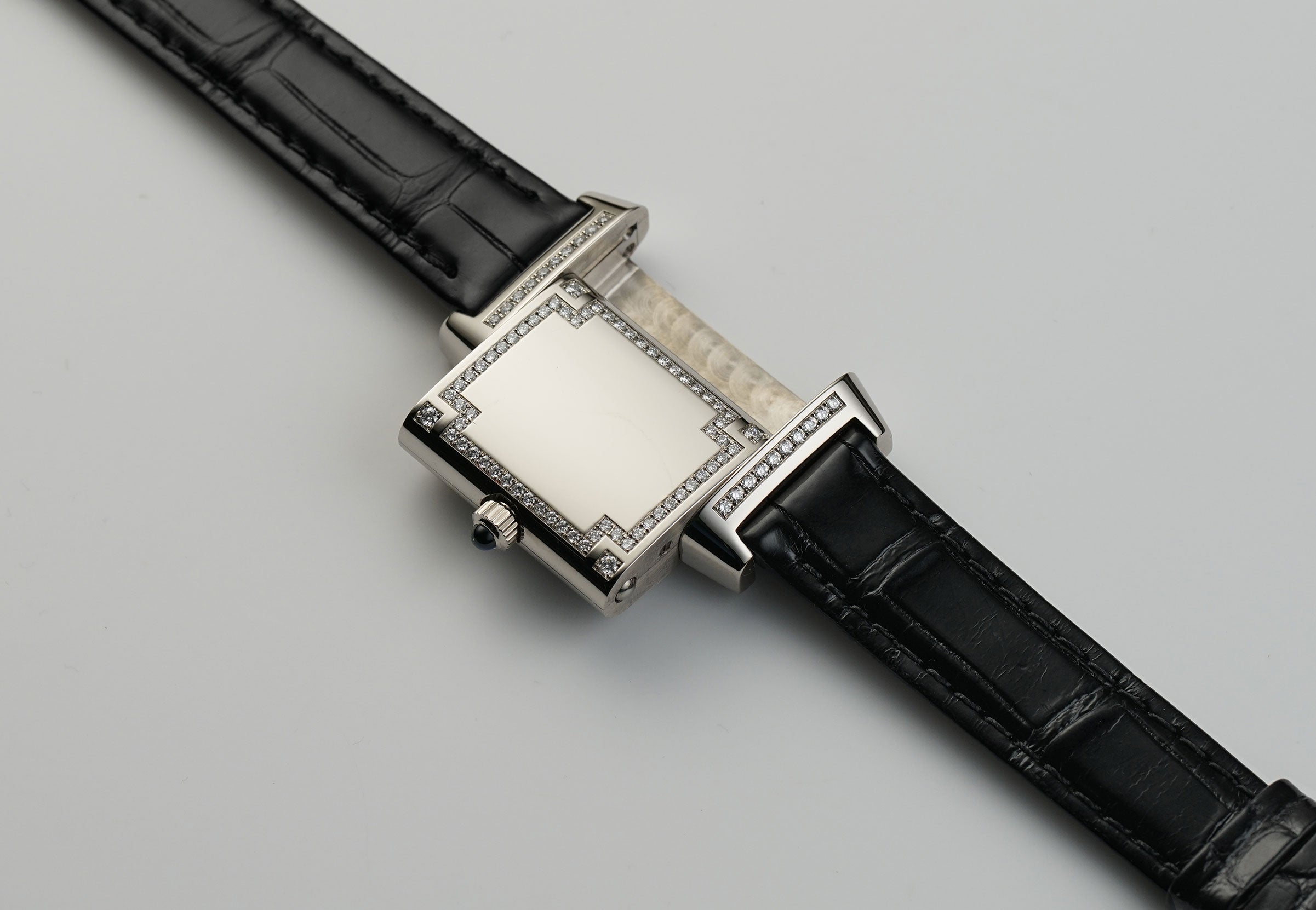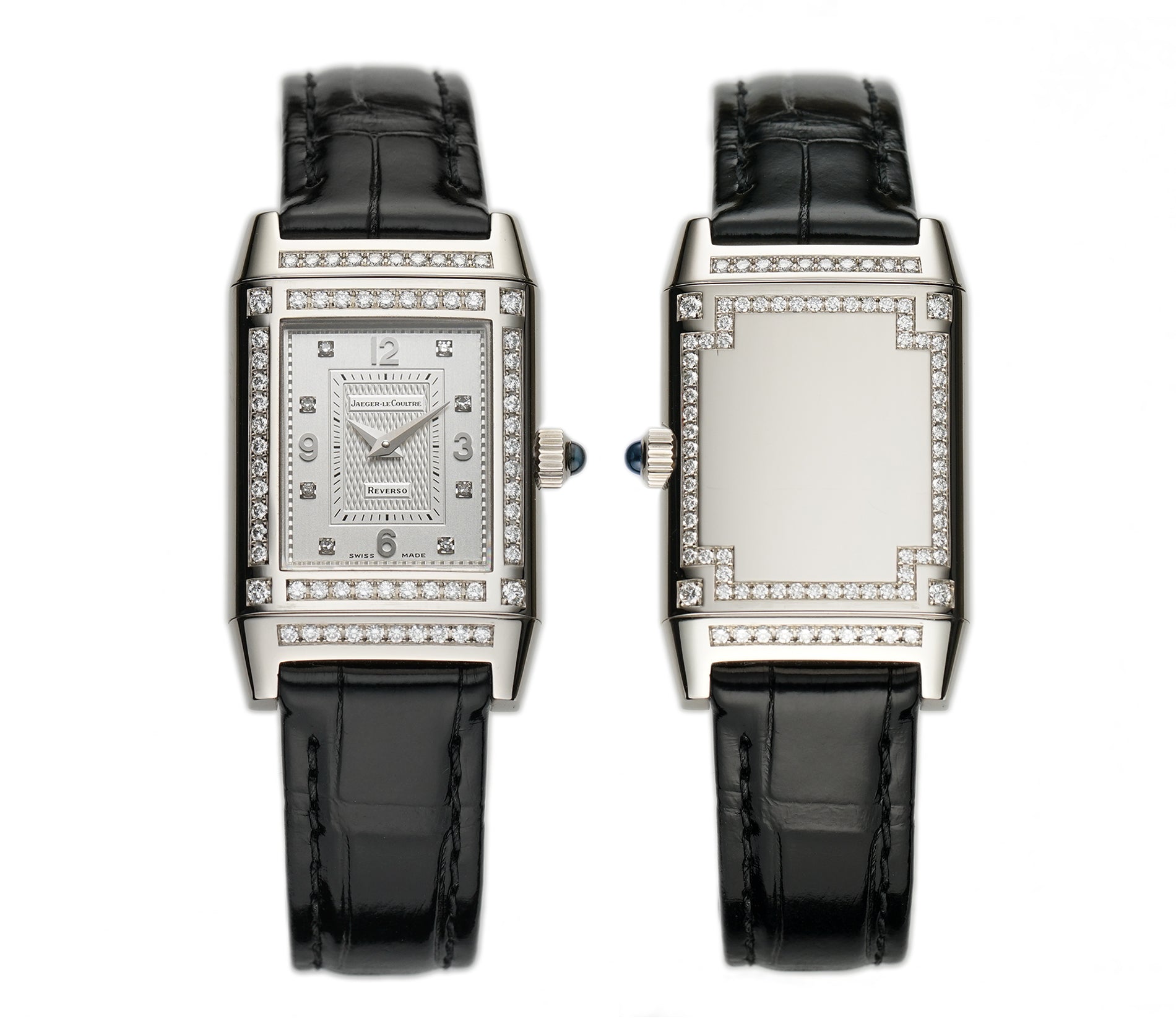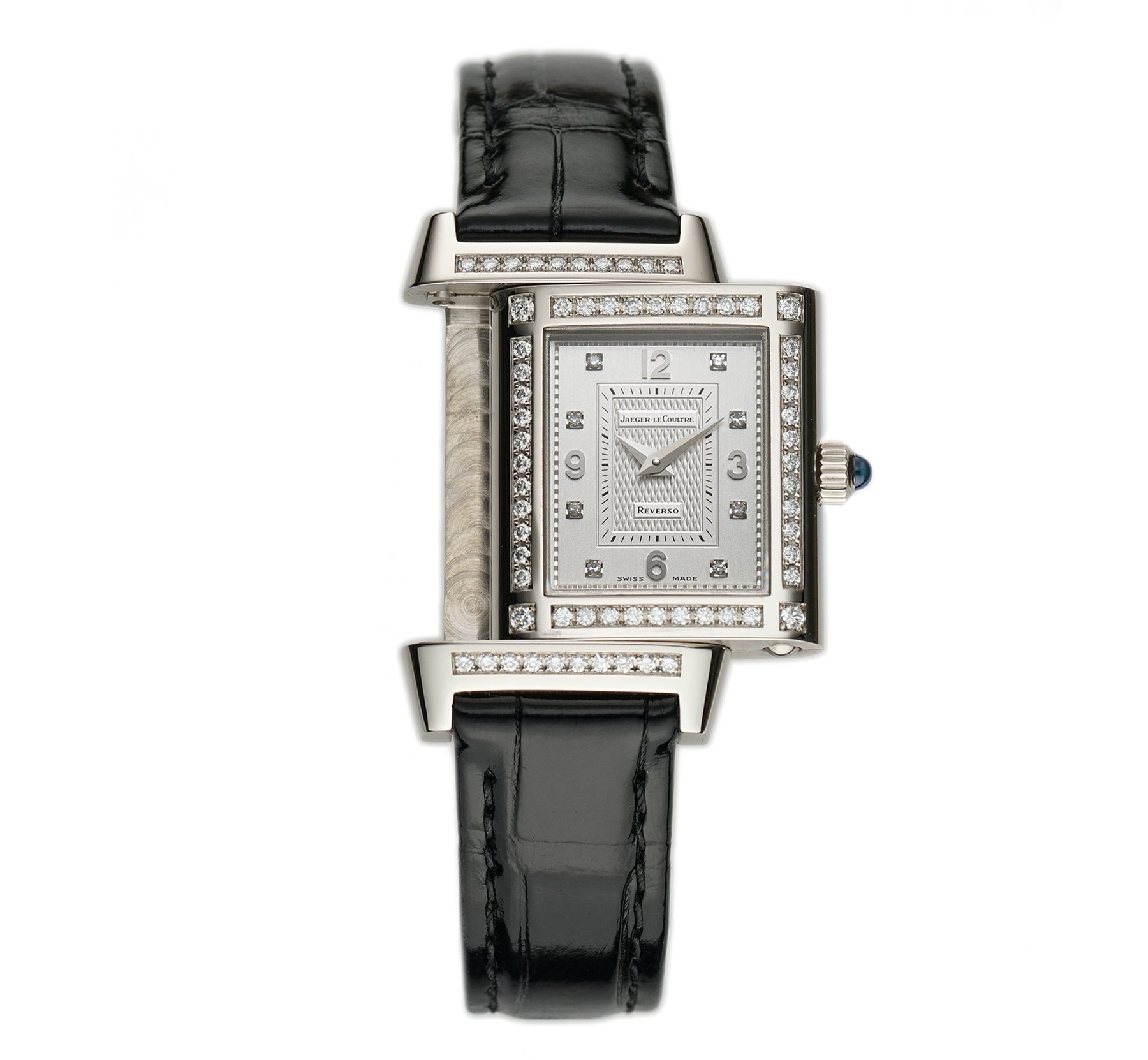 The case is of 18k white gold, displaying a mostly mirror finish with the exception of the inner carriage which has a spun finish. Both sides are JLC factory set with diamonds. The reverso side features a solid slate of 18k white gold and the diamonds act as a frame making it ideal for a personalized engraving. Currently mounted on the watch is an unworn black leather JLC strap that is paired with an 18k white gold deployment buckle.