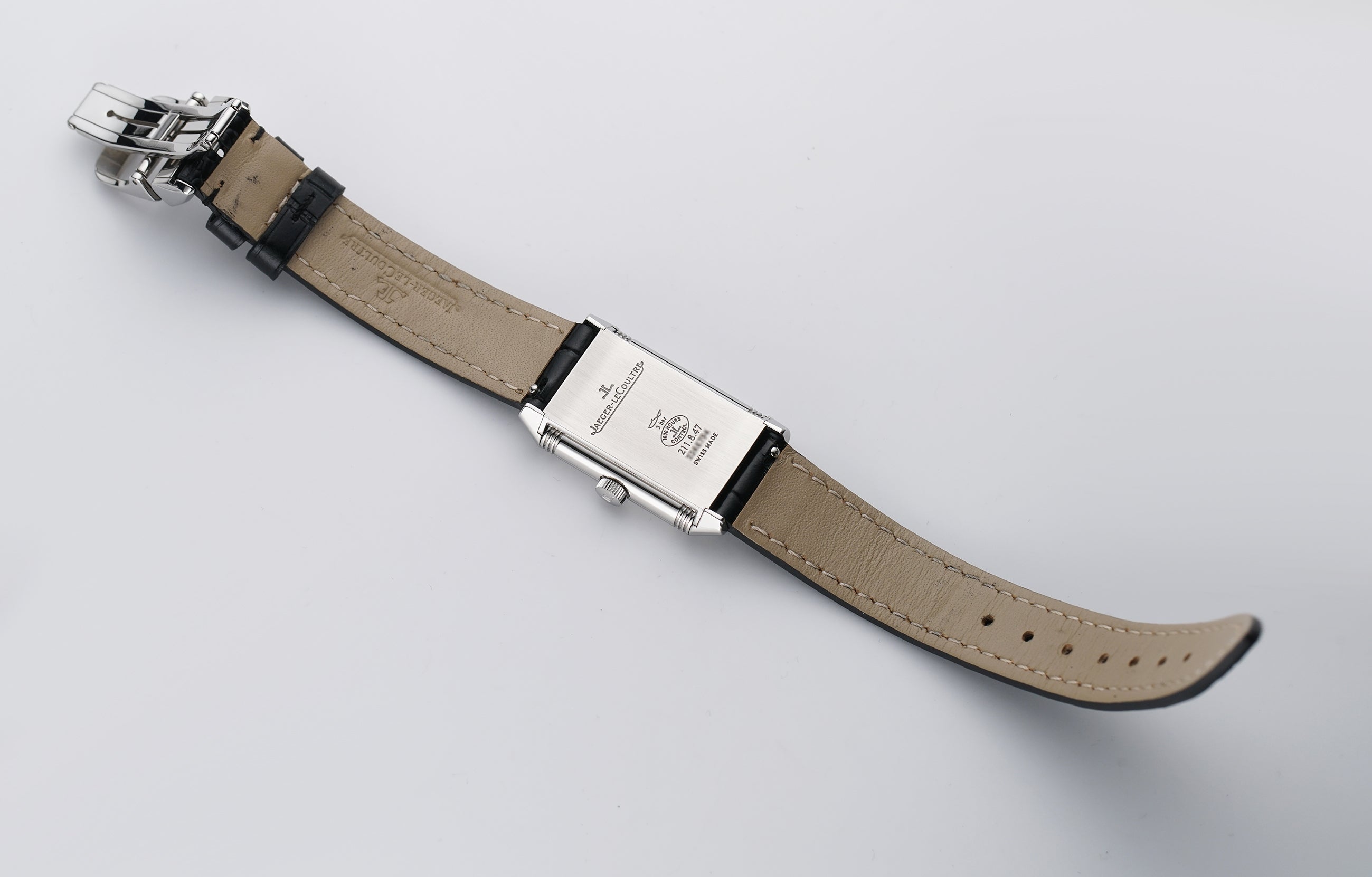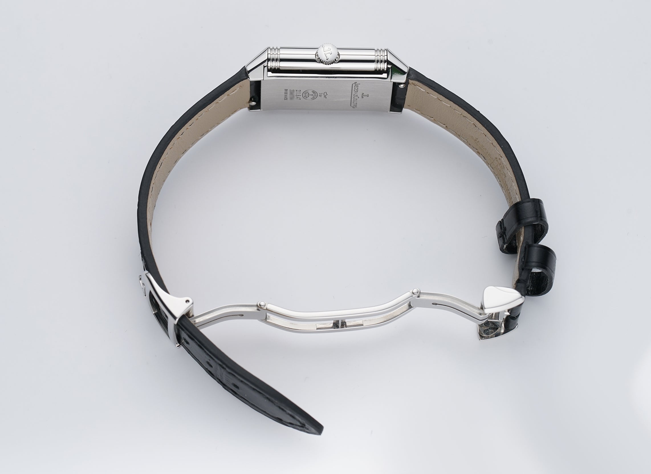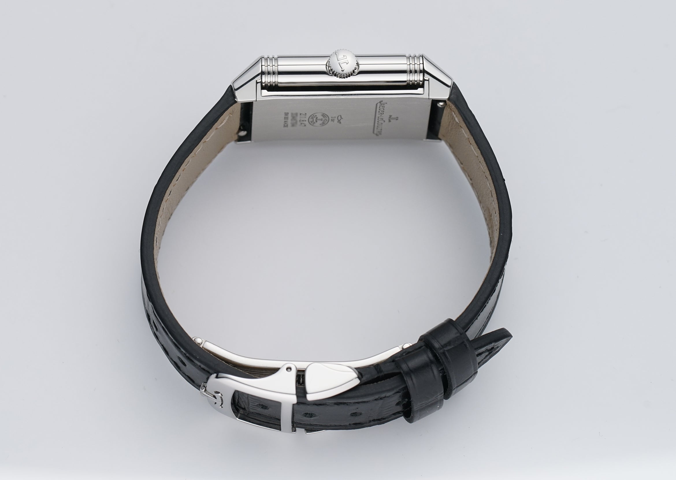 The case is made of stainless steel, most of which displays a mirror finish with the the exception of the case back which has a satin finish to it. Currently mounted on the watch is a black leather JLC strap (approximately 8/10 condition). Everything is tied together with a stainless steel JLC double-folding butterfly deployment clasp.