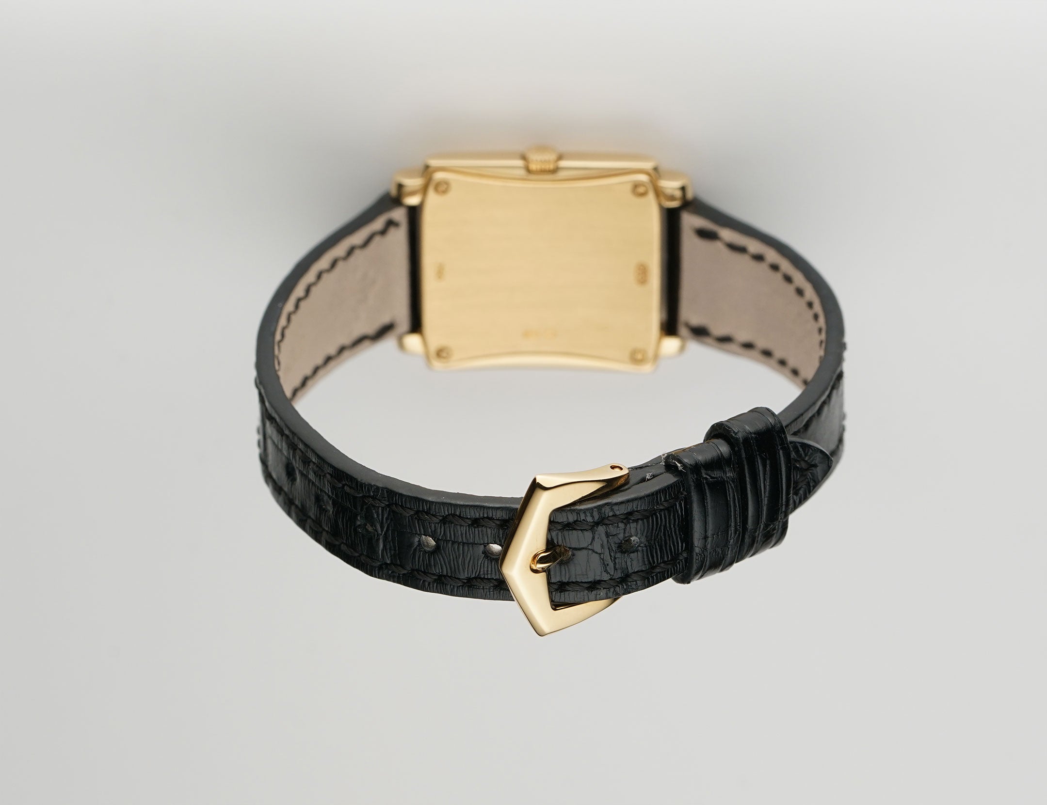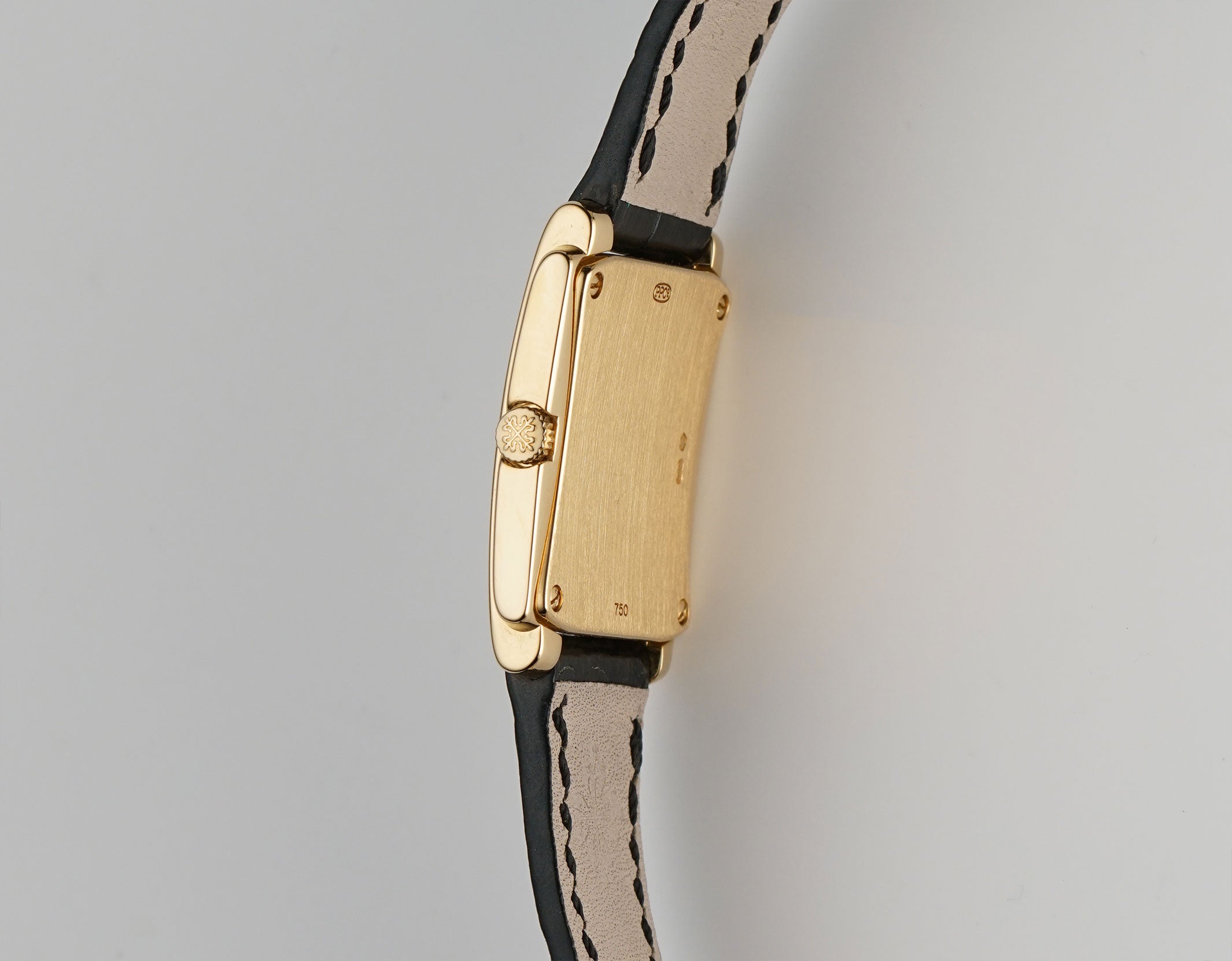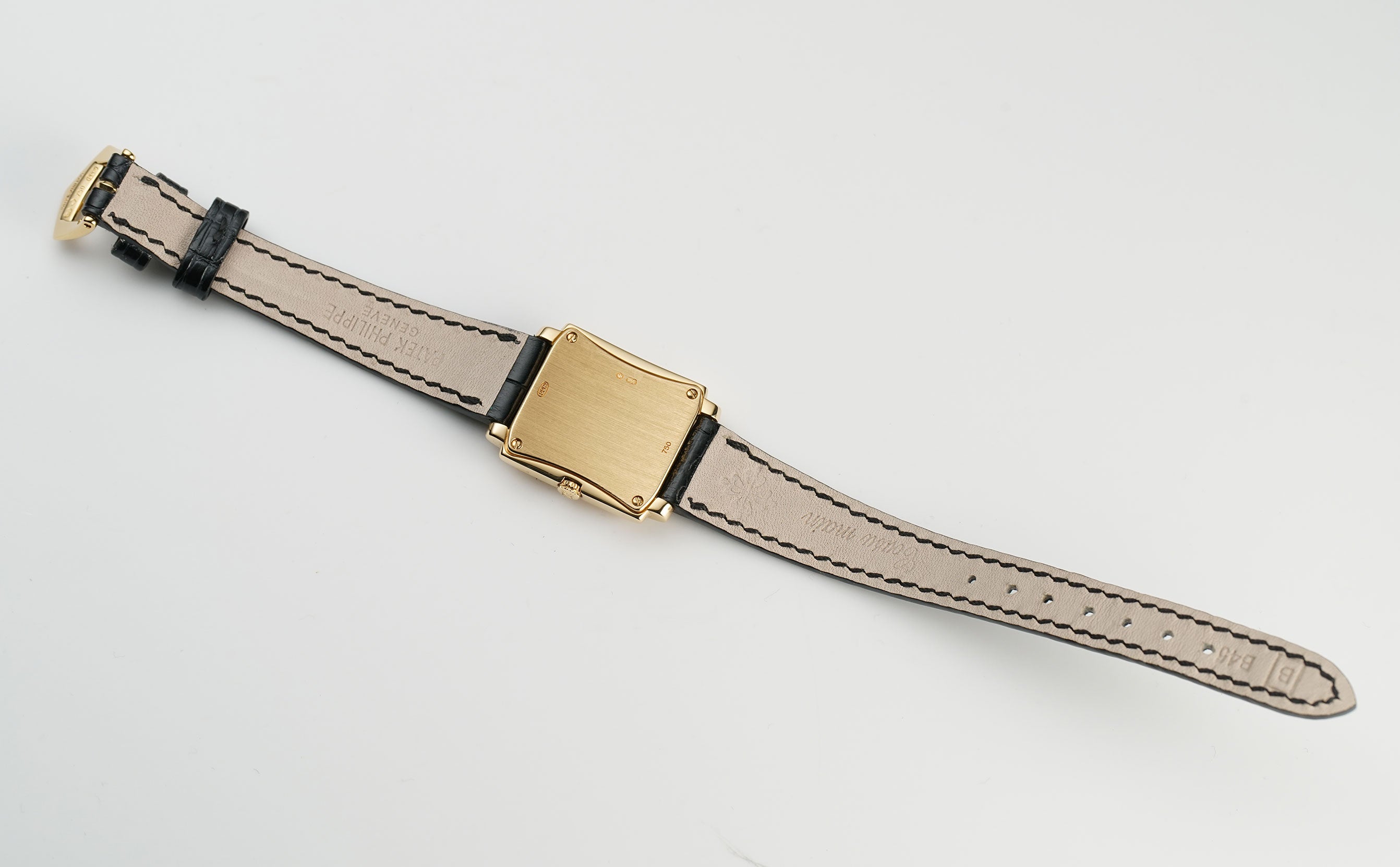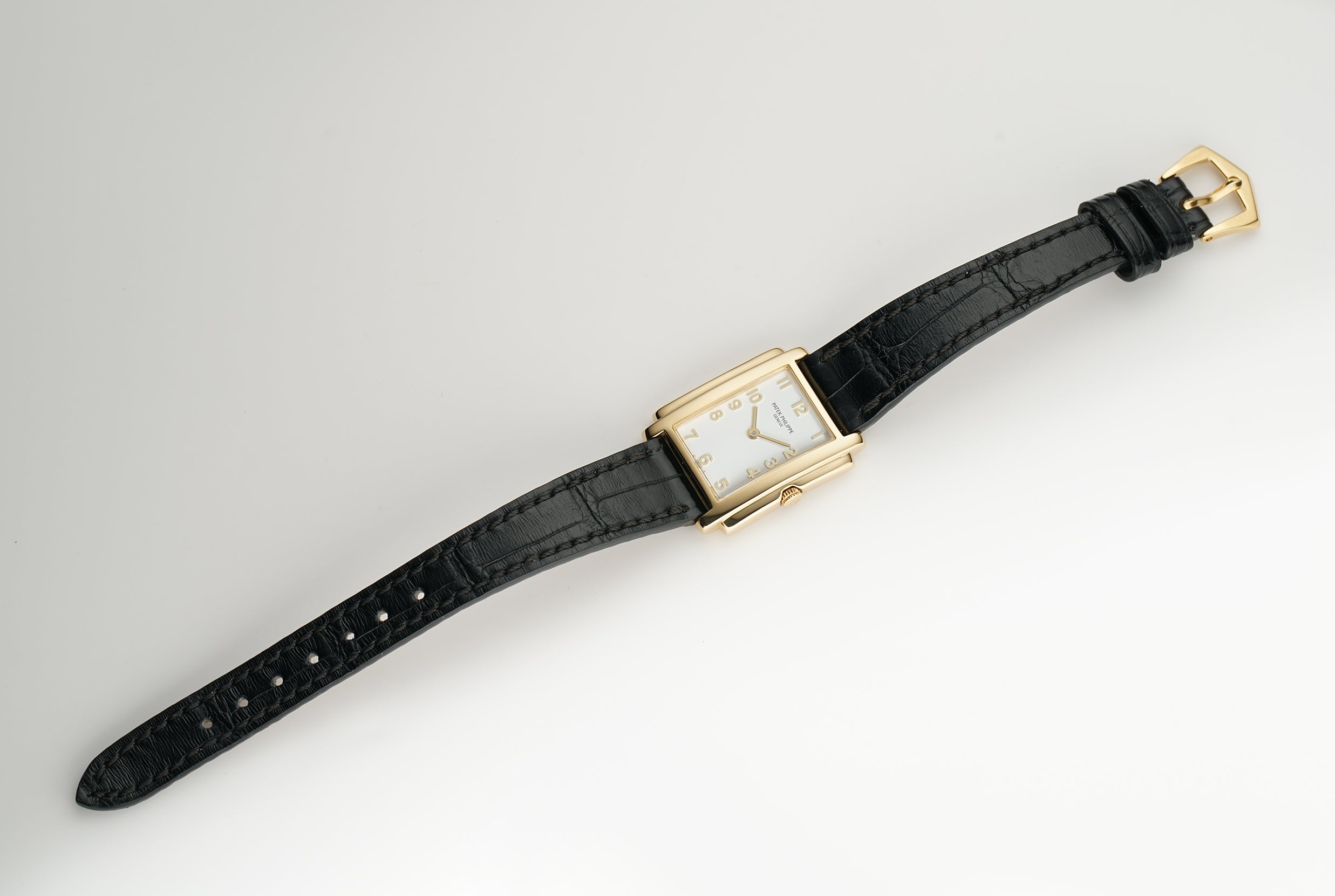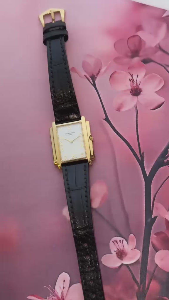 The case is made of 18k yellow gold, displaying mostly a mirror finish with the exception of the case back which has a satin finish. Currently mounted on the watch is a black leather Patek Philippe strap (approximately 80% condition) and that is paired with an 18k yellow gold Patek Philippe tang buckle.