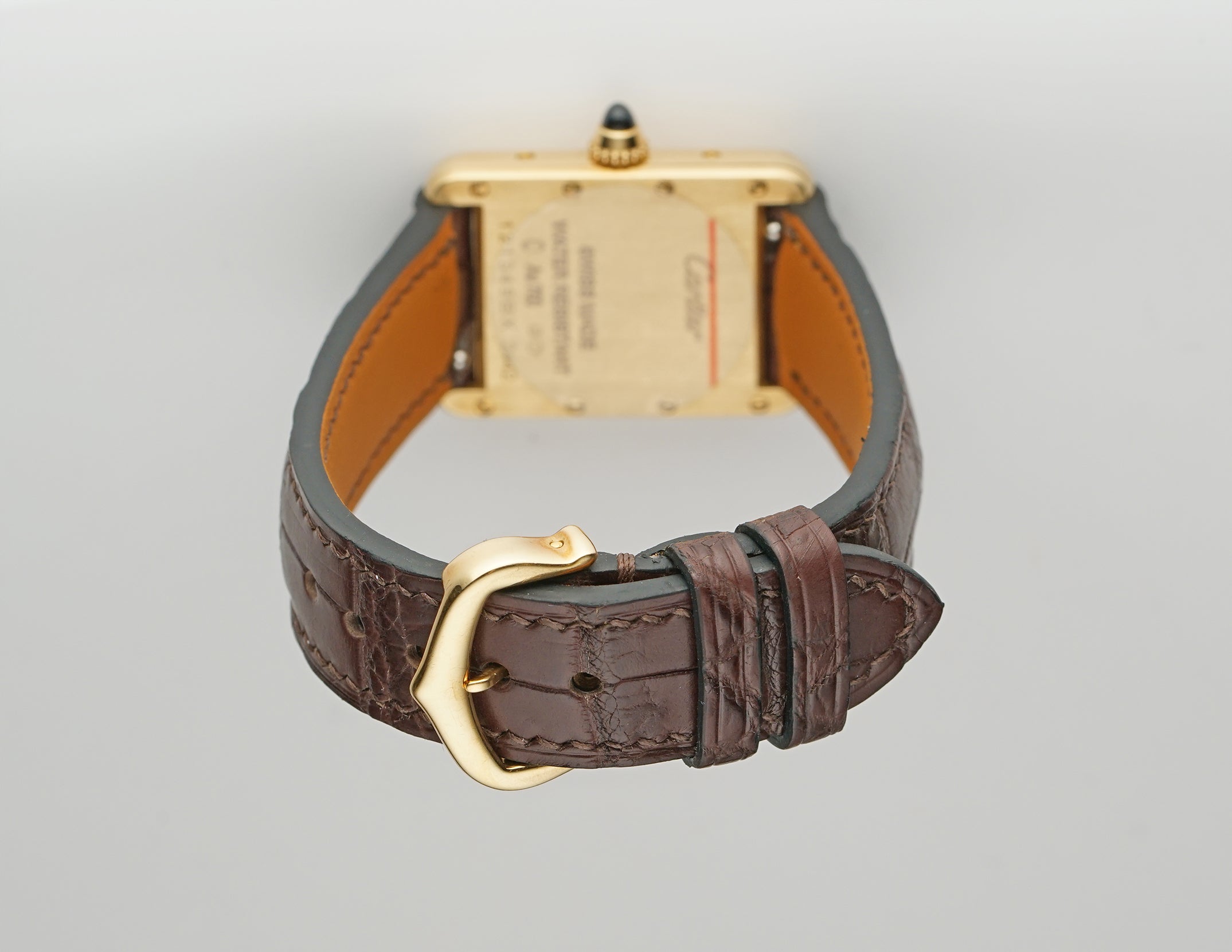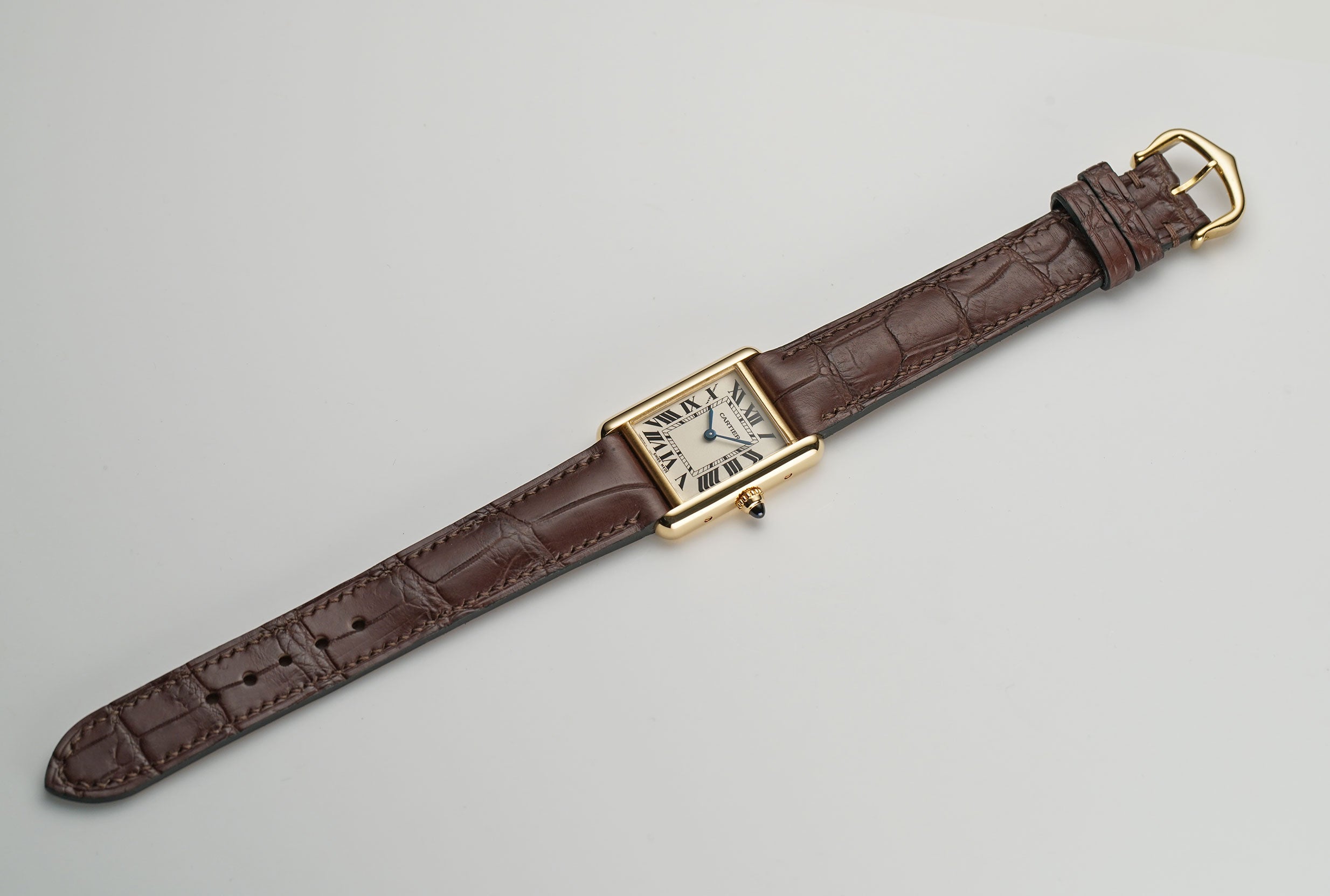 The case is of 18k yellow gold, displaying a contrasting look of both mirror-like and satin finishes. It is currently mounted on a non-Cartier brown leather strap (unworn condition) and that is paired with a Cartier 18k yellow gold tang buckle.