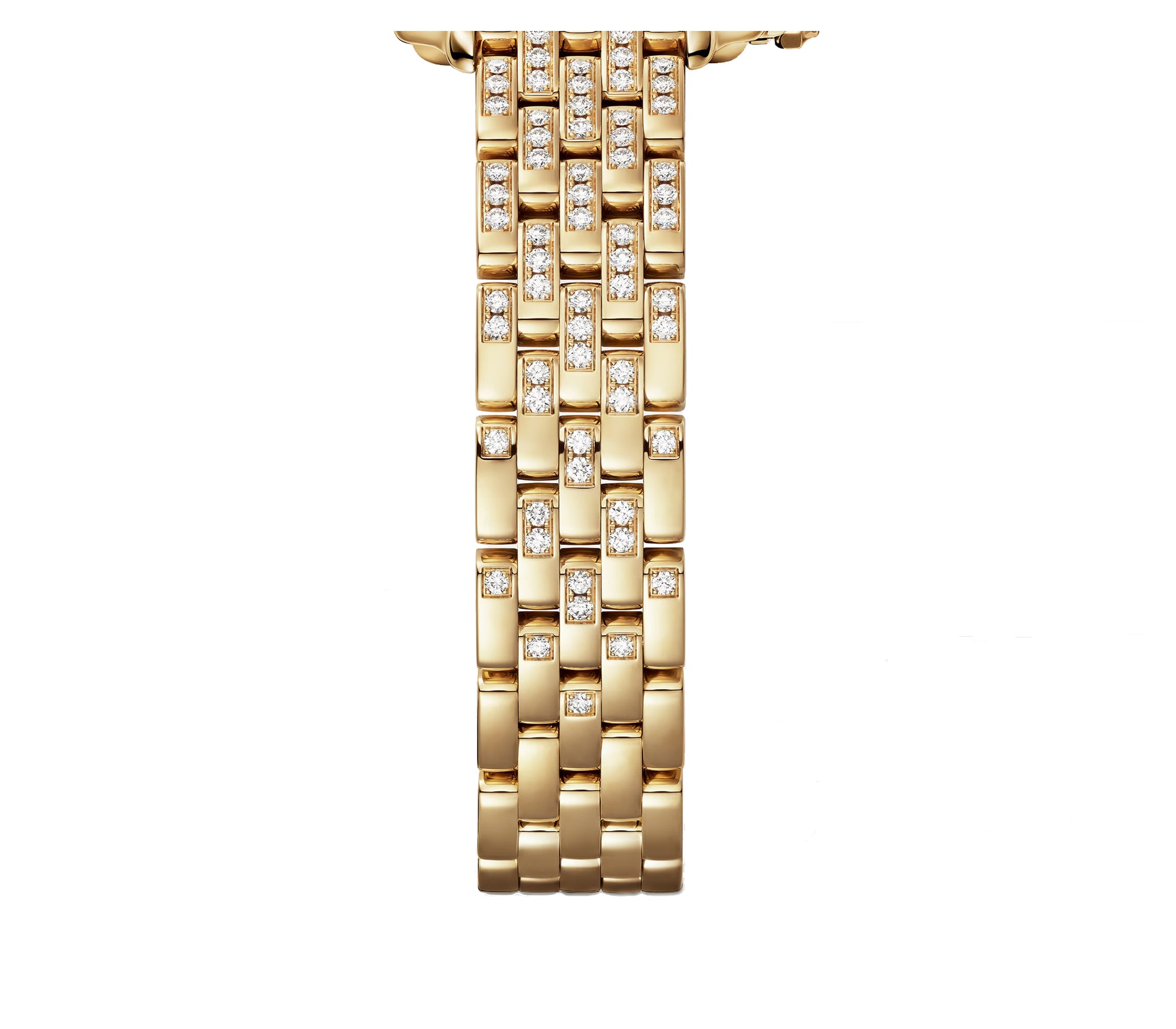 Case us made of a mirror-finished 18k yellow gold including the octagonal crown with brilliant-cut diamond totaling 0.02 carats. Mounted atop the case is a mirror-finished 18k yellow gold fixed diamond bezel with 36 brilliant-cut diamonds totaling 0.25 carats. The watch is paired with a semicut 18k yellow gold and diamond bracelet semi-set with 142 brilliant-cut diamonds totaling 1.29 carats.