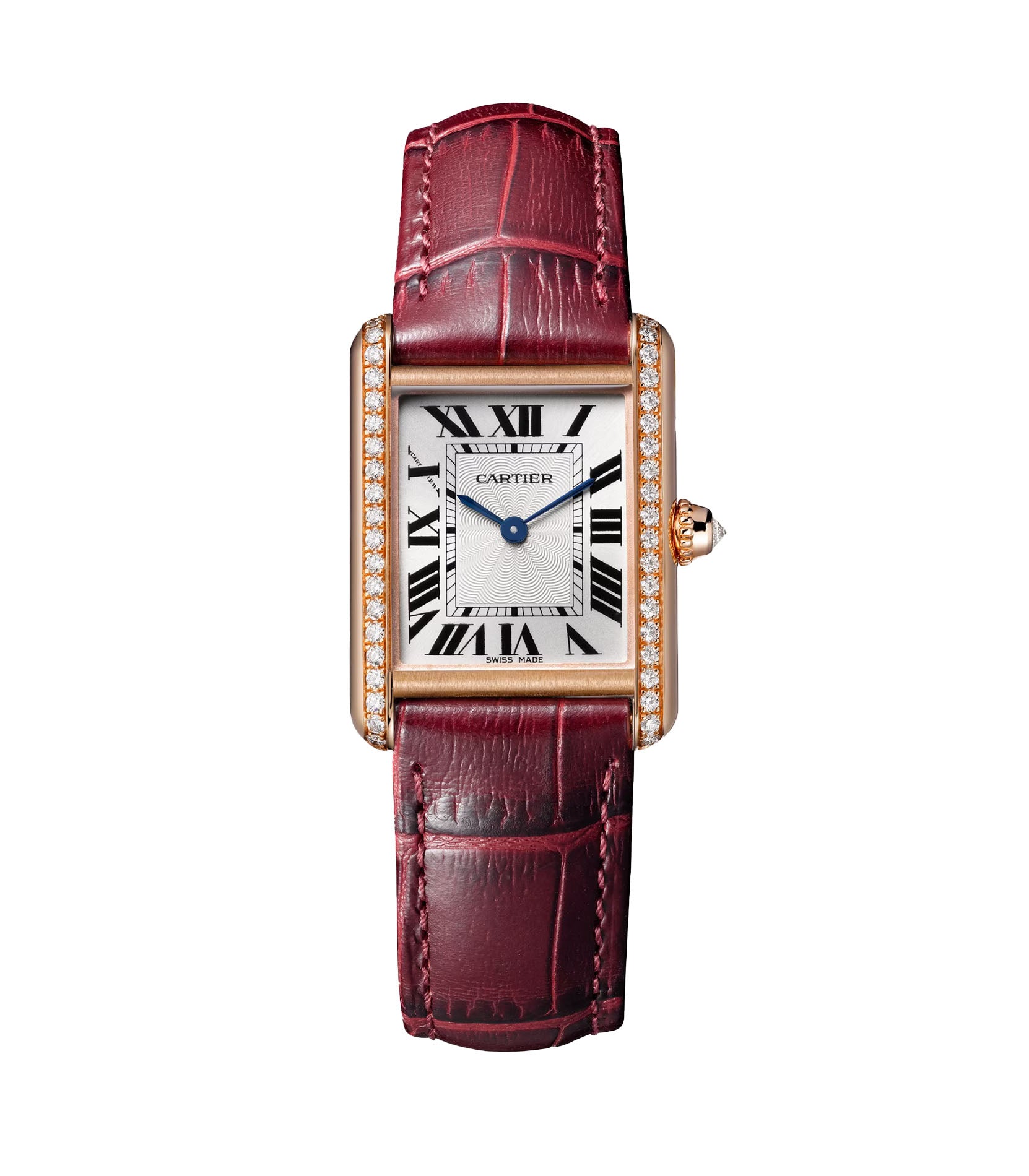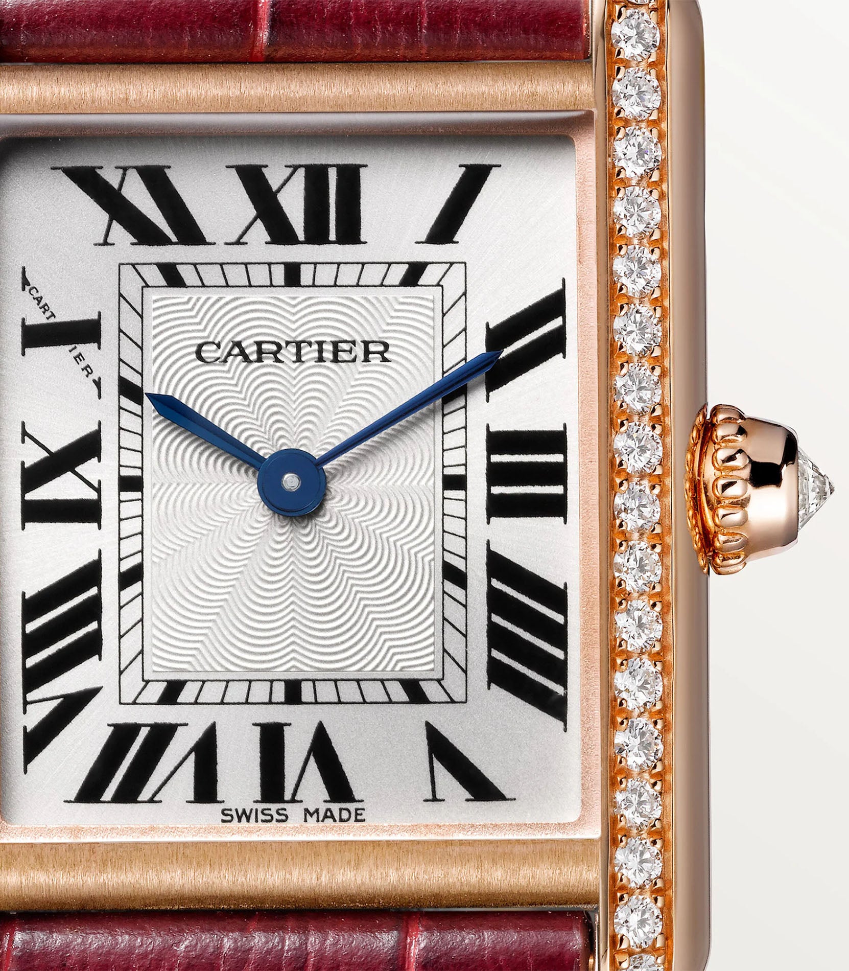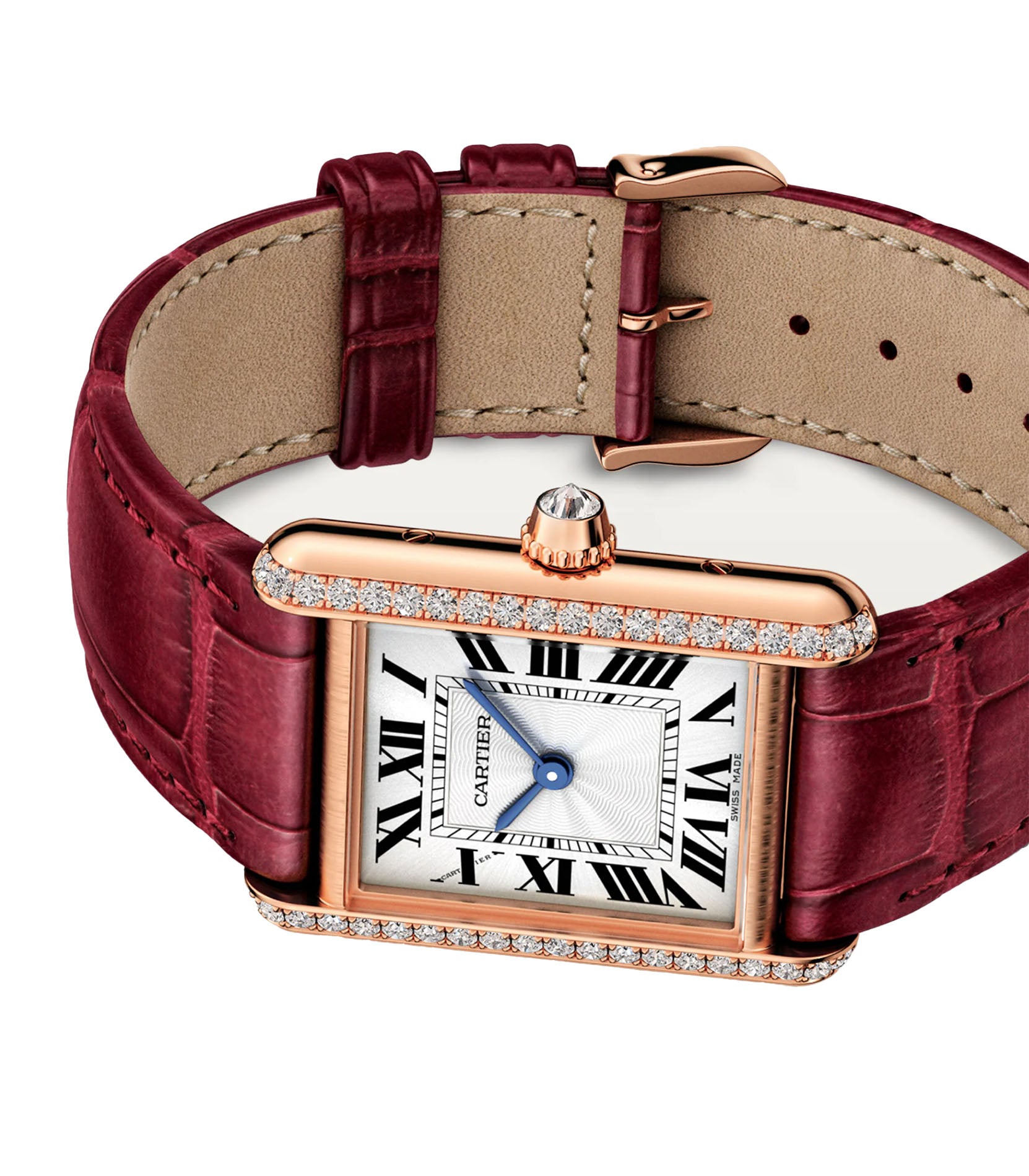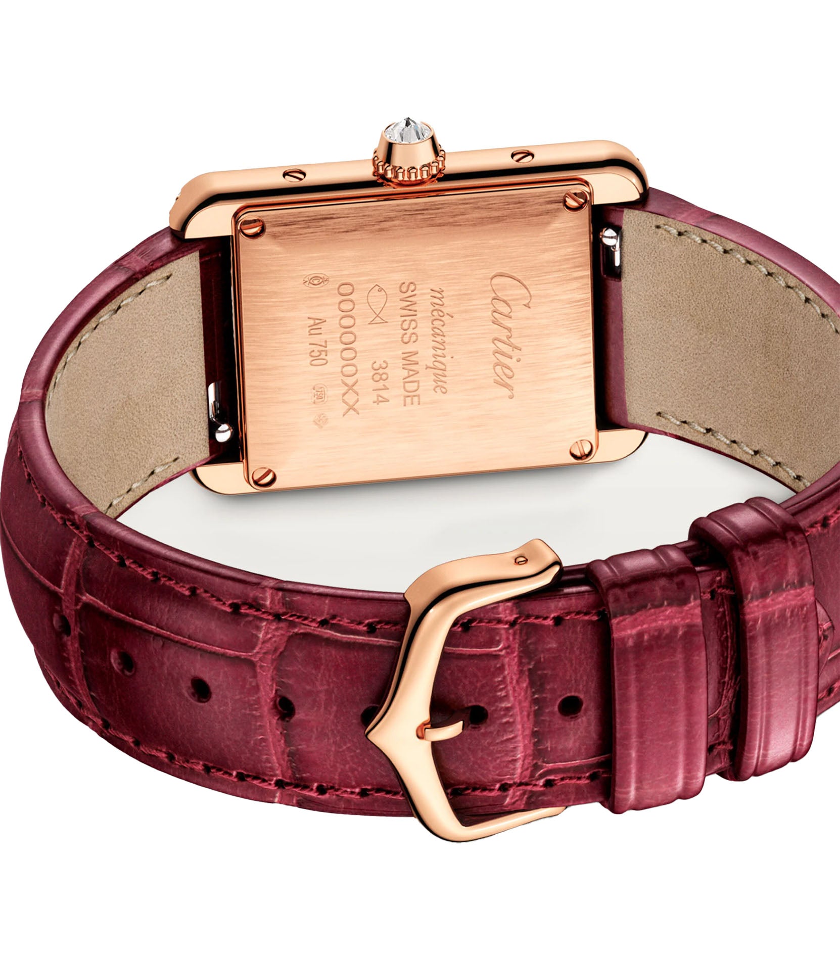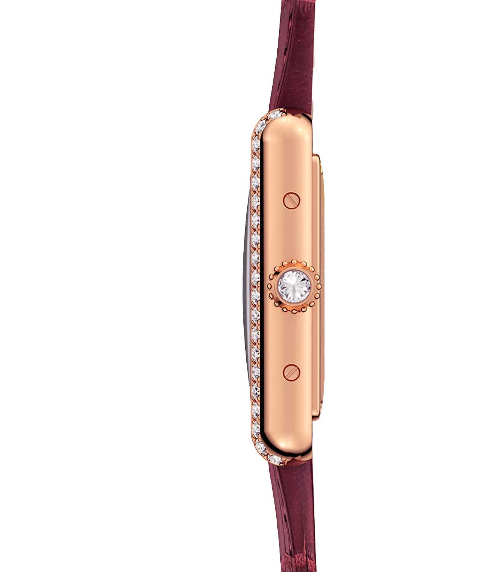 The case is made of 18k rose gold, mostly of a mirror finish with the exception of the horizontals at 12 and 6 o'clock which display a satin finish. The case is set with diamonds totaling approximately 0.47 carats (41 brilliant-cut diamonds). Also set with a diamond is the 18k rose gold crown. It is paired with a wine red leather strap that is accompanied by an 18k rose gold tang buckle.