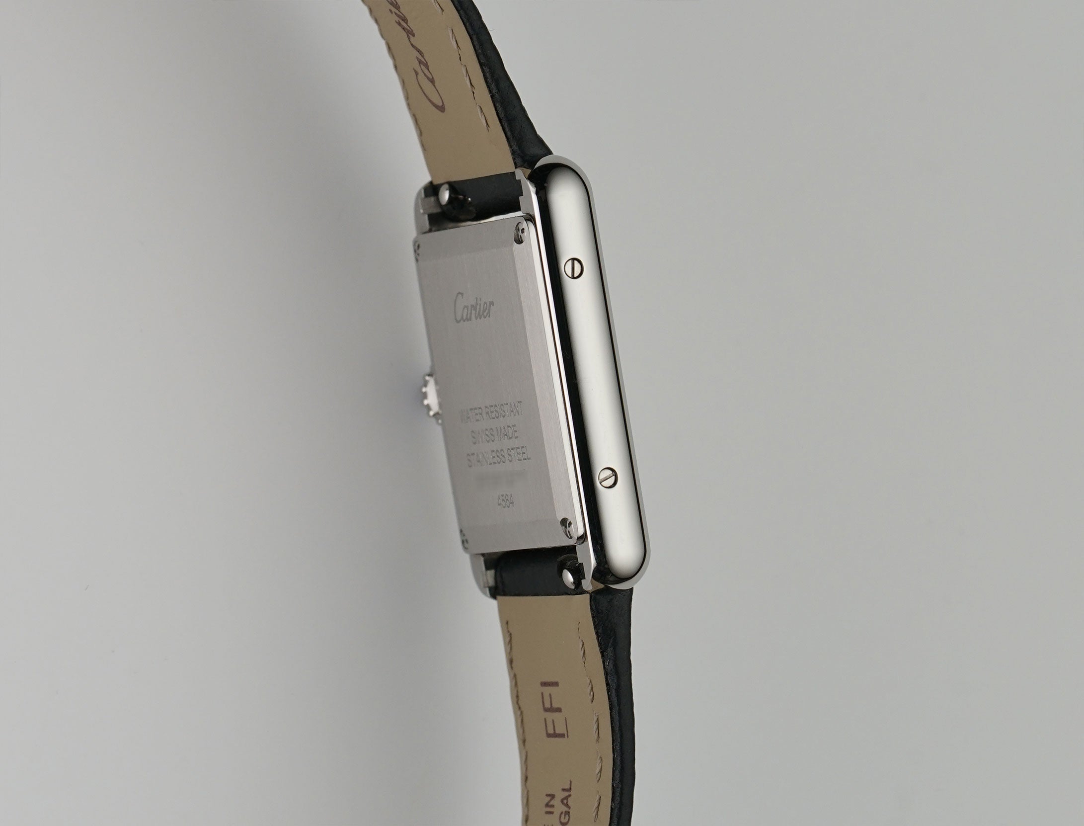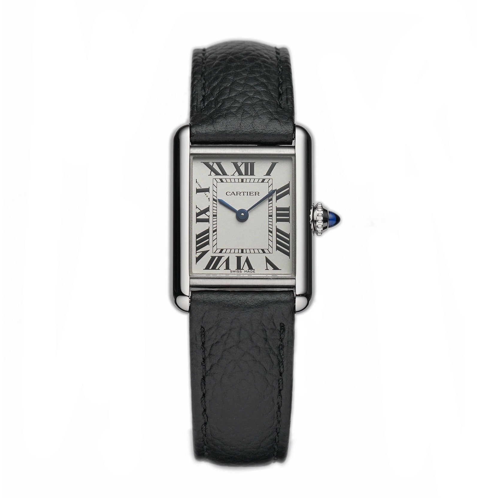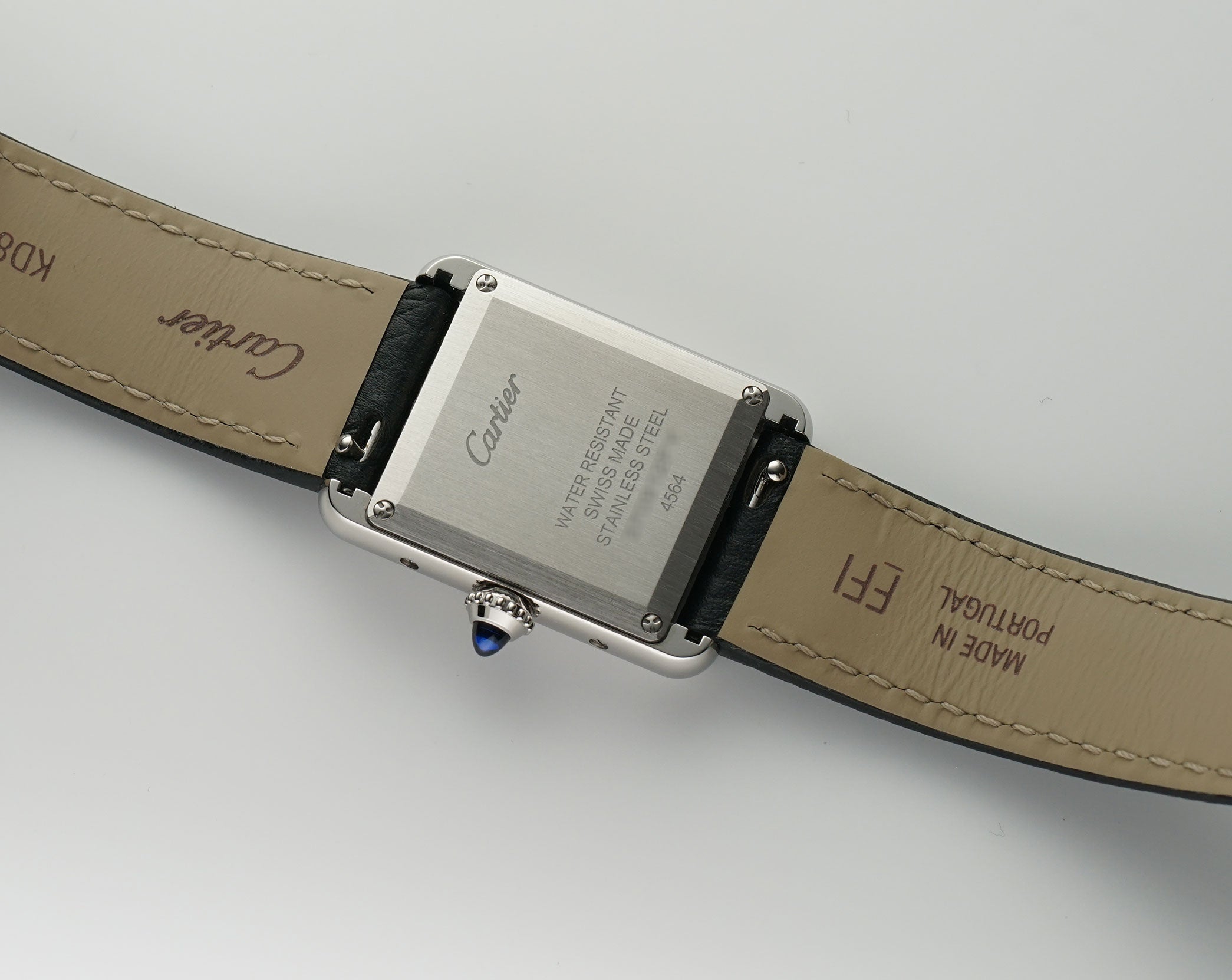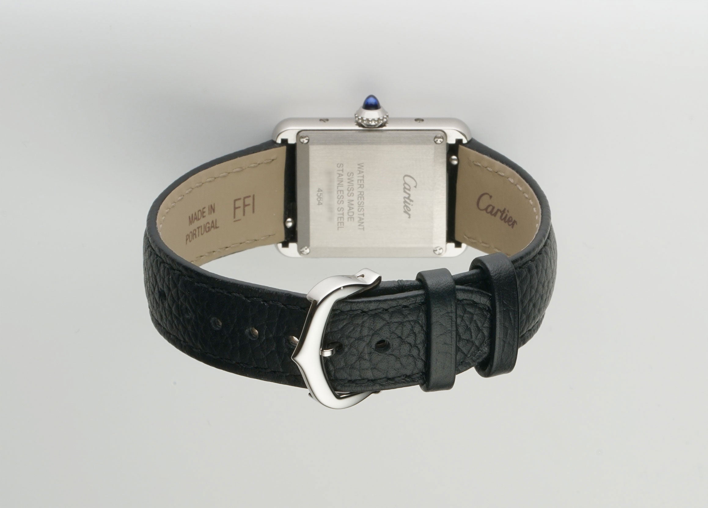 The case is made of a mirror finish stainless steel including the crown with the blue synthetic cabochon spinel. It is paired with a black leather strap with a stainless steel tang buckle.