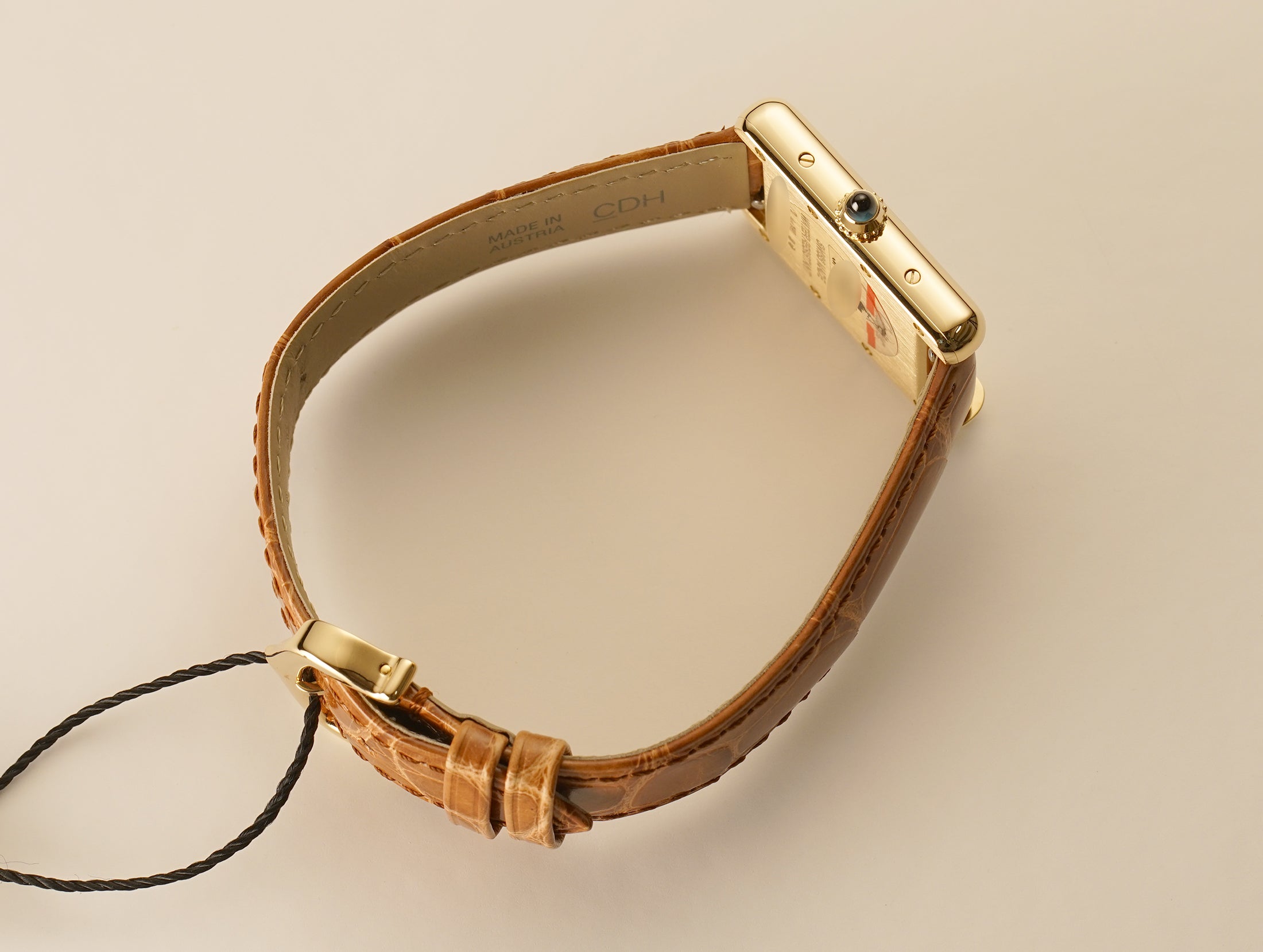 The case is made of a 18k yellow gold with the sides and crown being of a mirror-like finish and the case back as well as top/bottom of bezel being of satin finish. It is paired with a brown leather strap that is equipped with an 18k yellow gold tang buckle.
