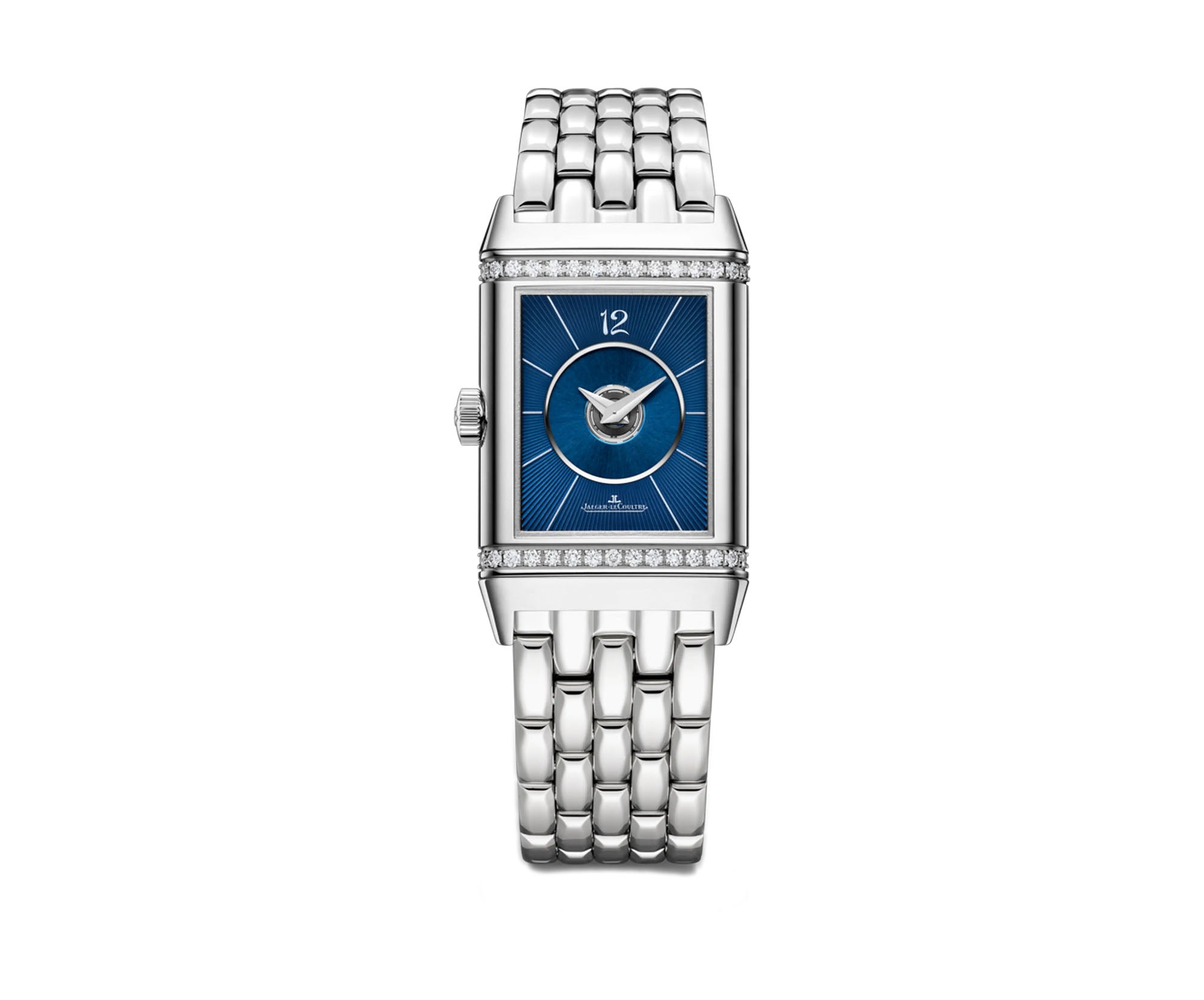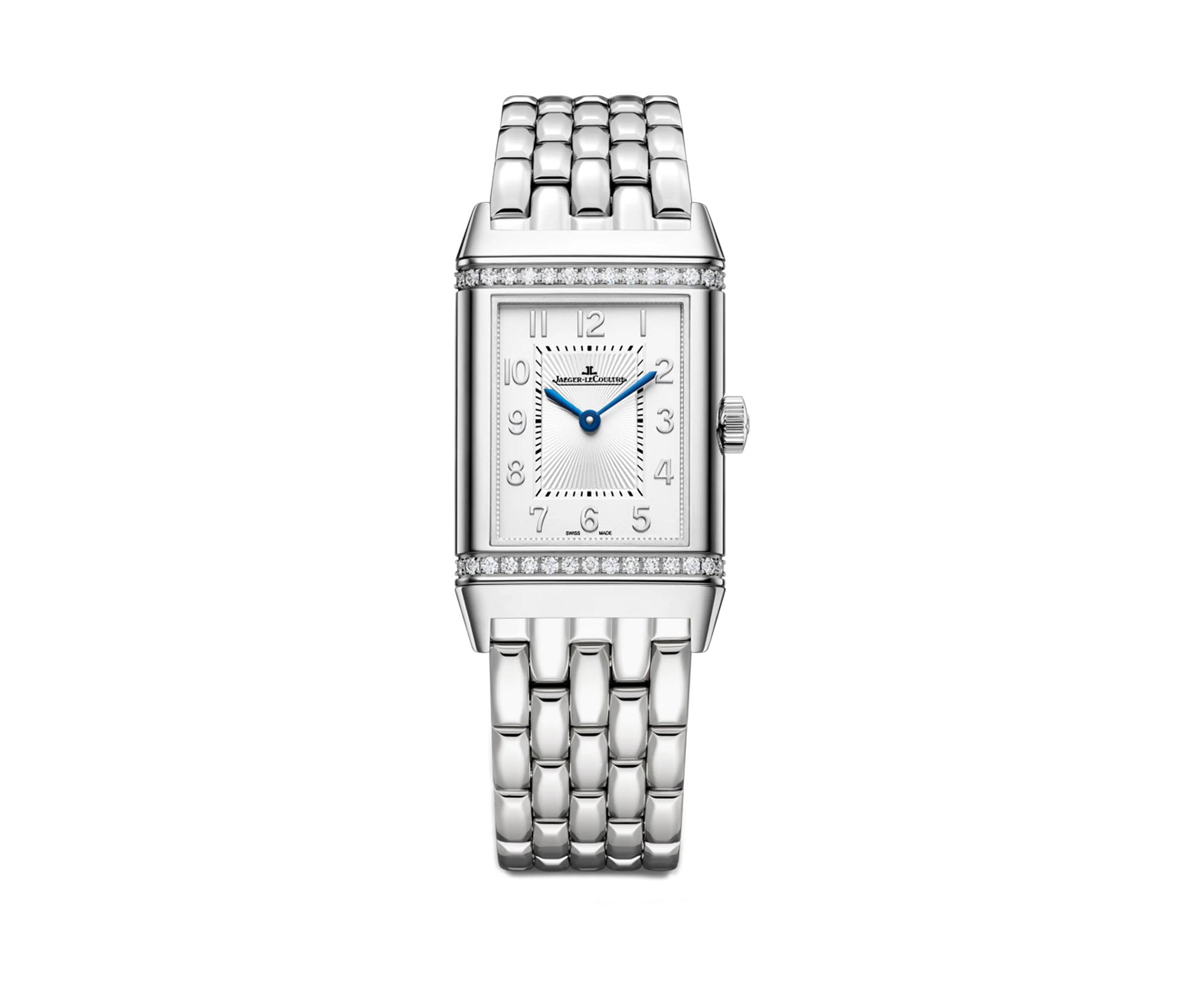 The case is made of a mirror finish stainless steel including the crown with set diamonds above and below the dial on both the main and reverse side. Paired with the watch is a mirror finish stainless steel case.