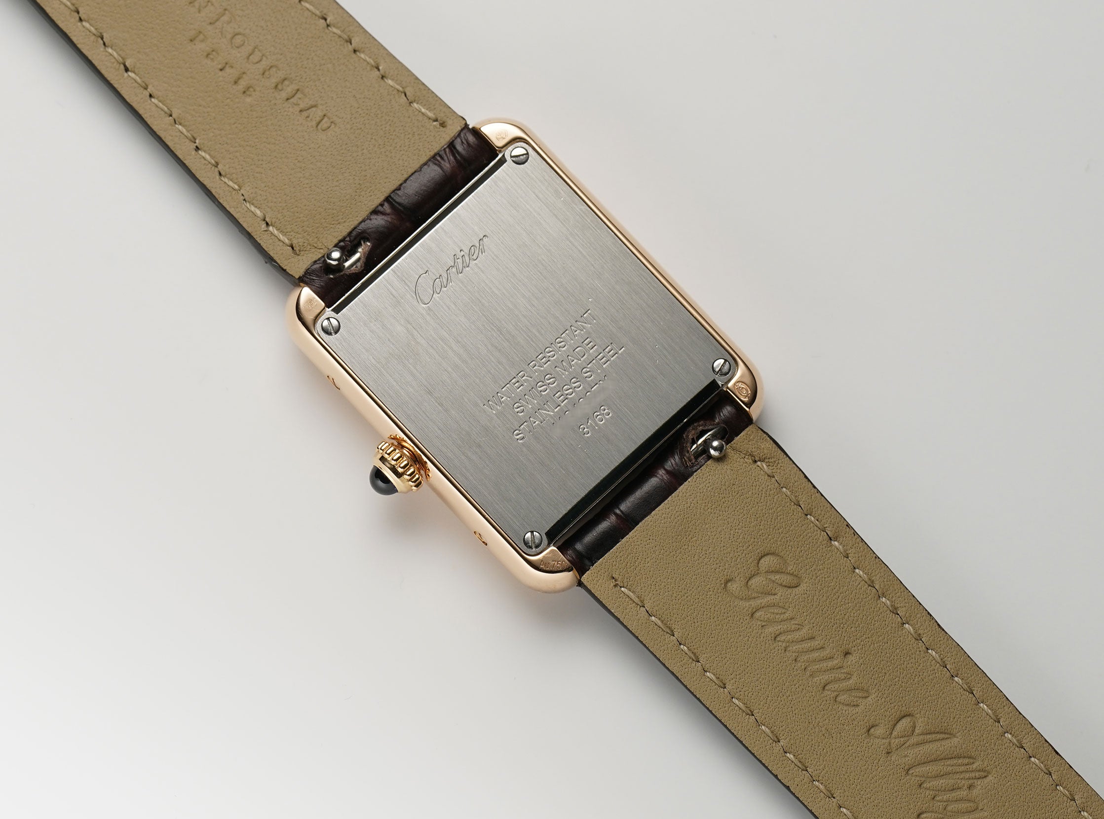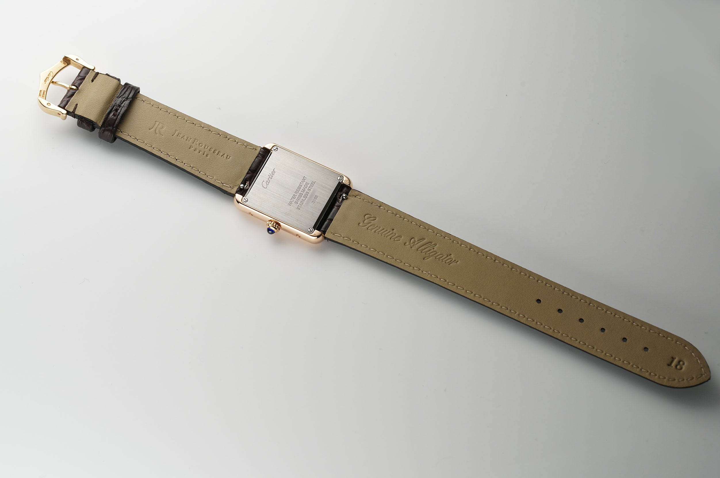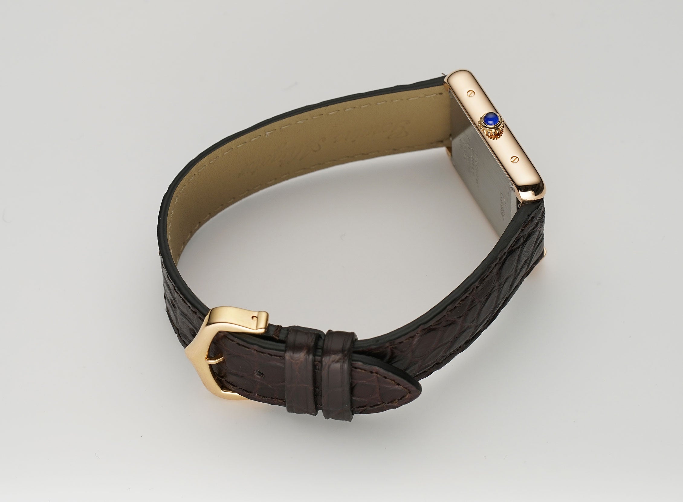 The case is made mostly of a mirror finished 18k rose gold as is the fluted crown which features a blue a synthetic blue spinel. The case back however, is of satin-finished stainless steel. The watch is currently mounted on an unworn John Rousseau brown leather strap which is in unworn condition and that is paired with a Cartier 18k rose gold tang buckle.