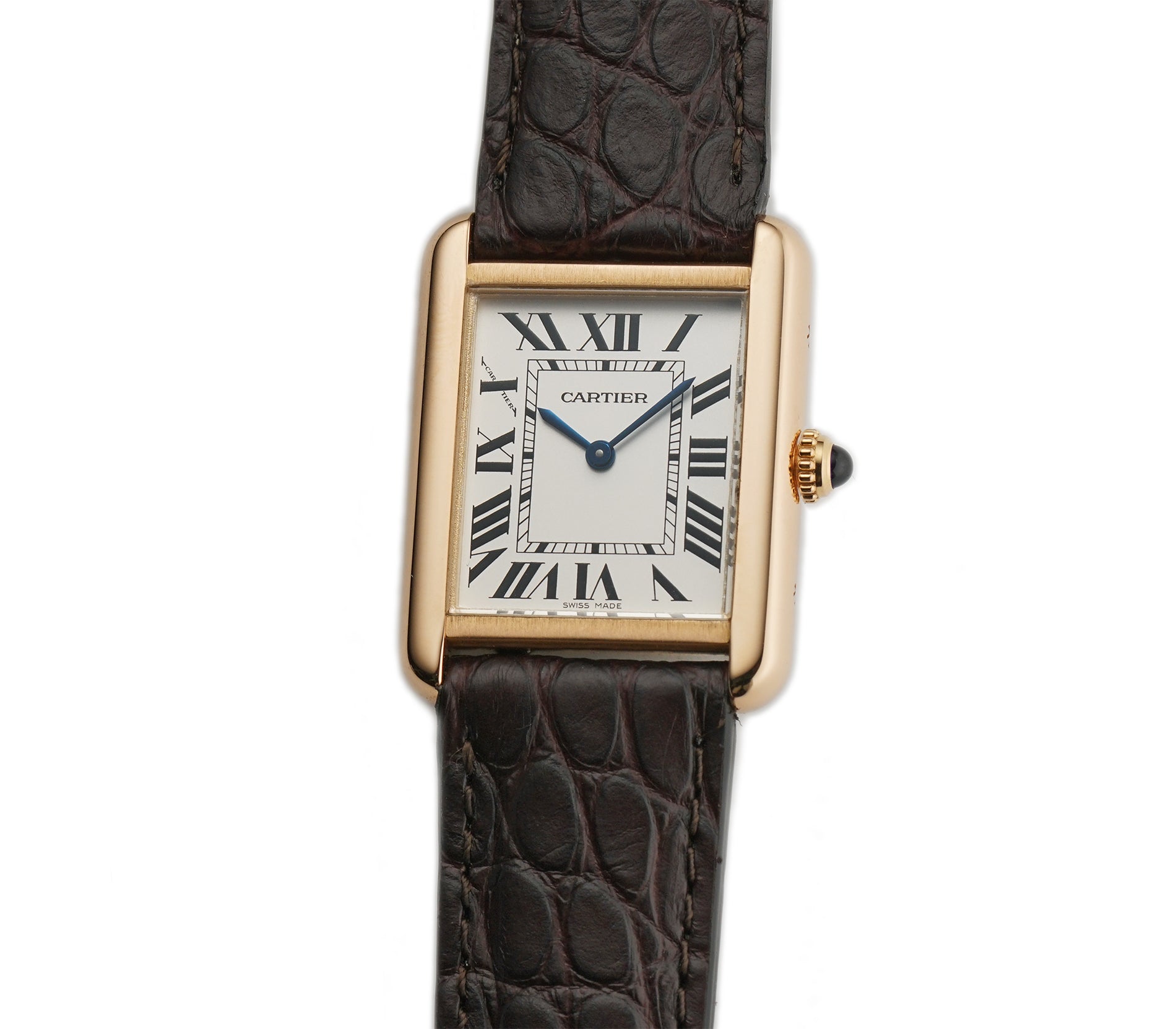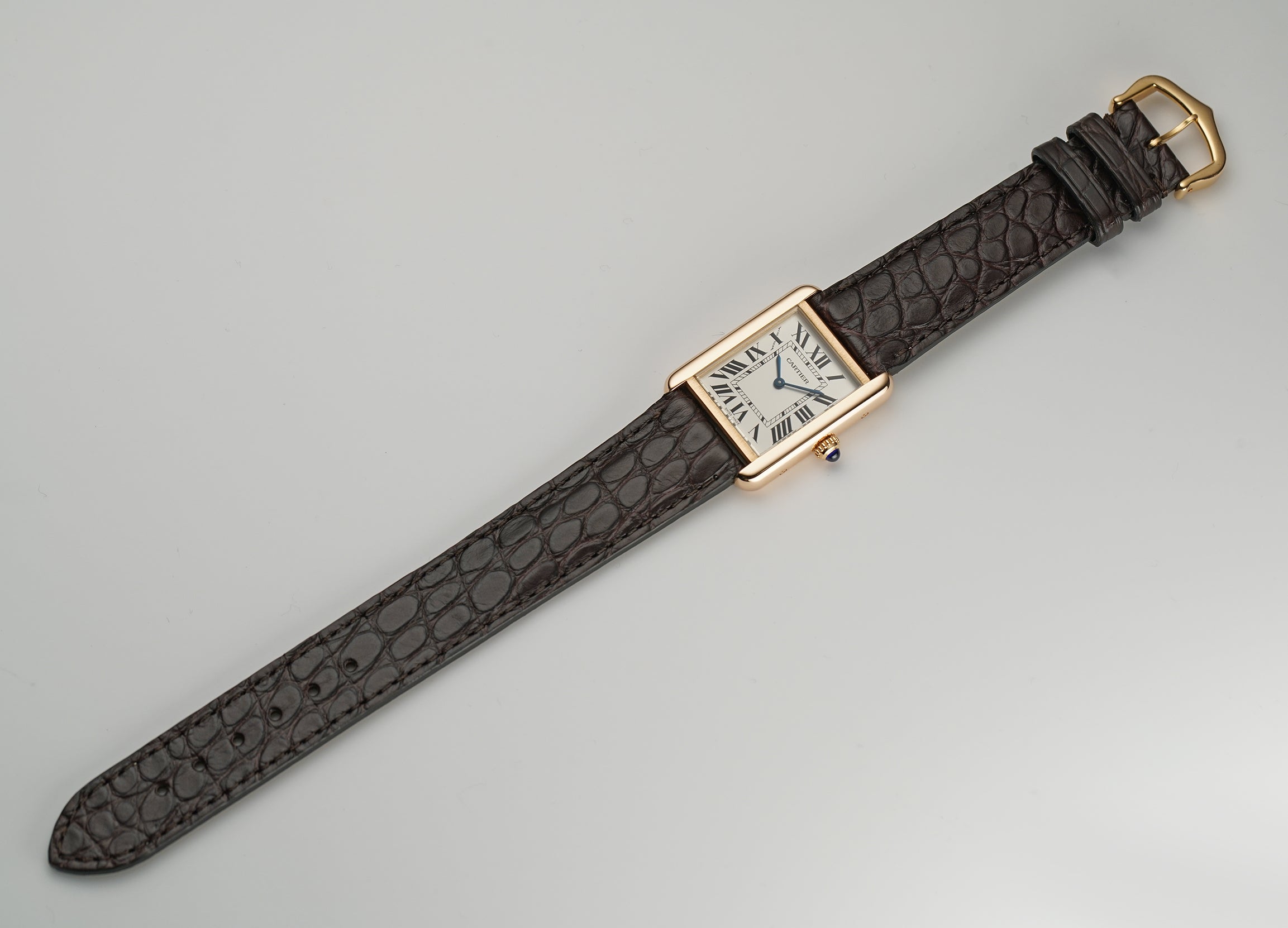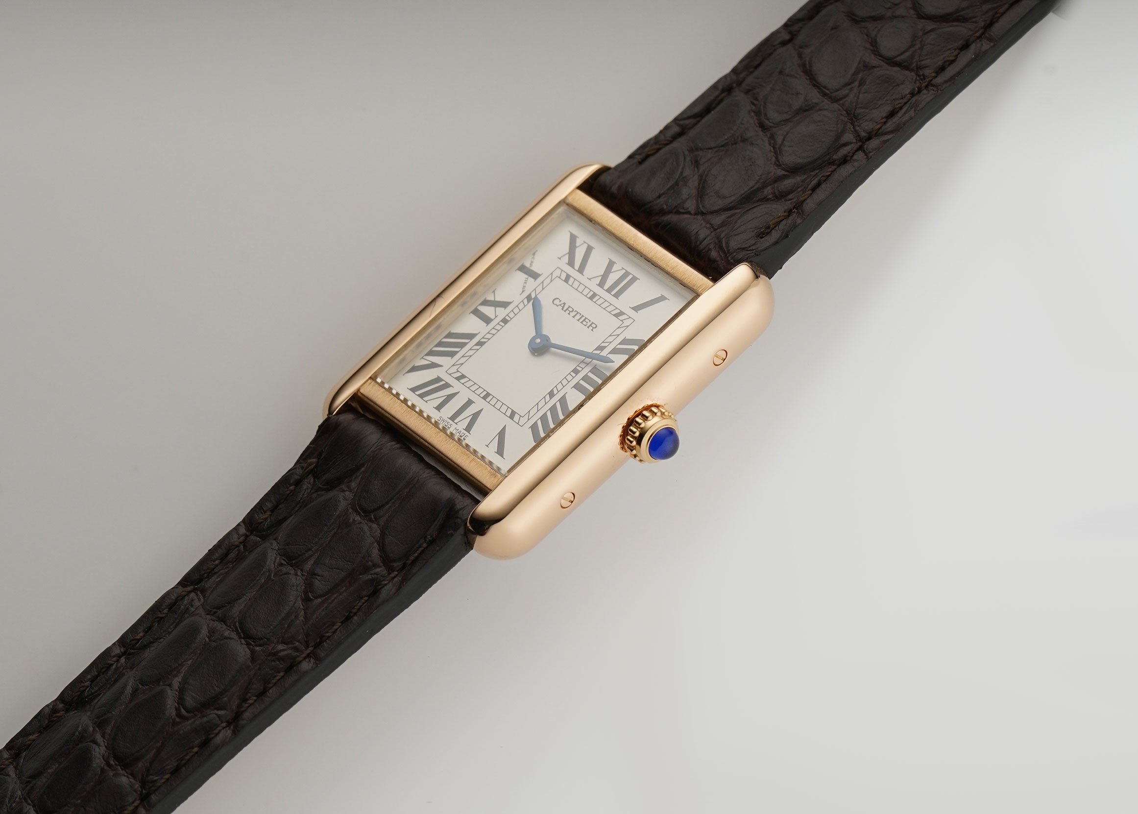 The case is made mostly of a mirror finished 18k rose gold as is the fluted crown which features a blue a synthetic blue spinel. The case back however, is of satin-finished stainless steel. The watch is currently mounted on an unworn John Rousseau brown leather strap which is in unworn condition and that is paired with a Cartier 18k rose gold tang buckle.