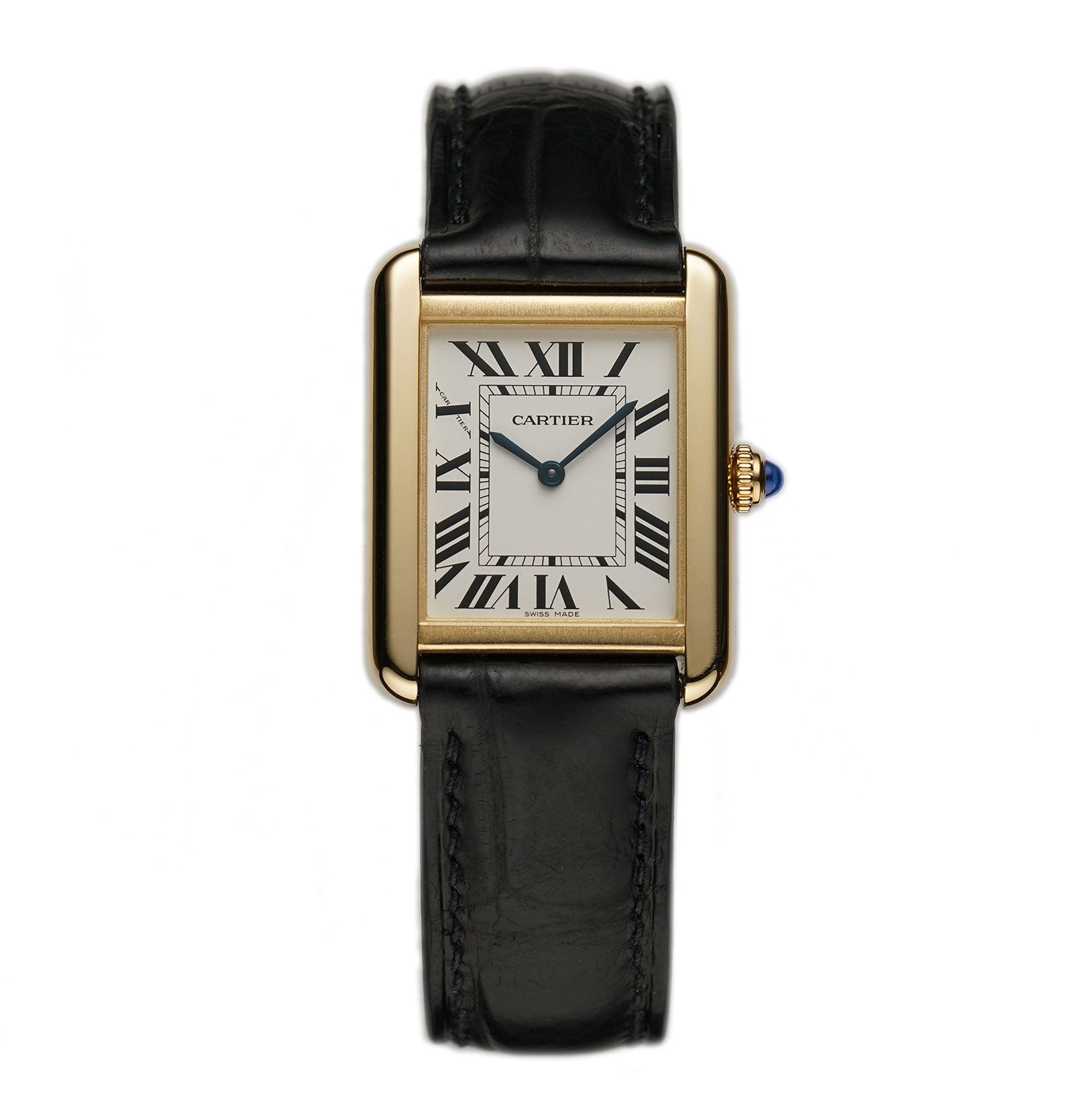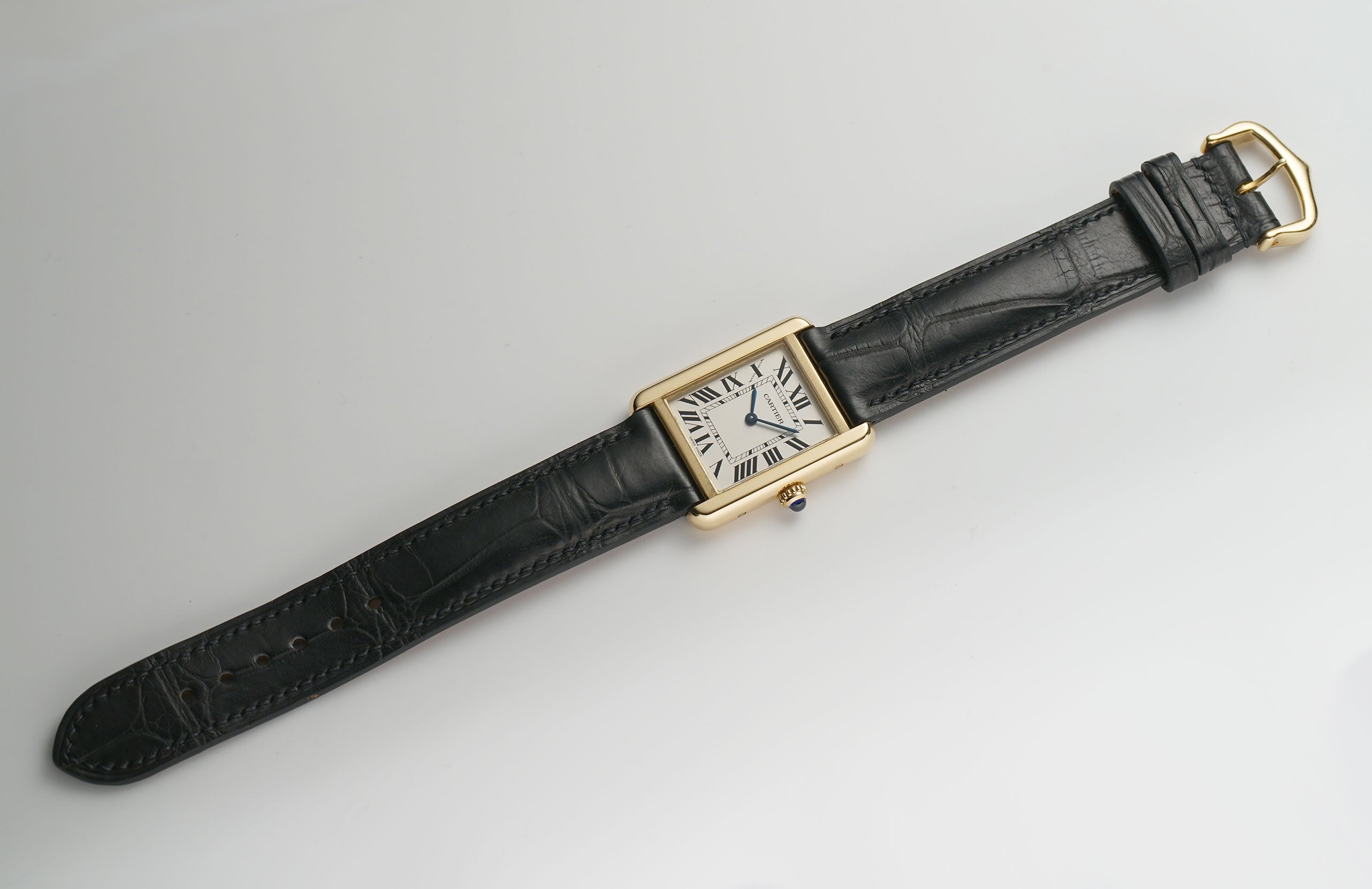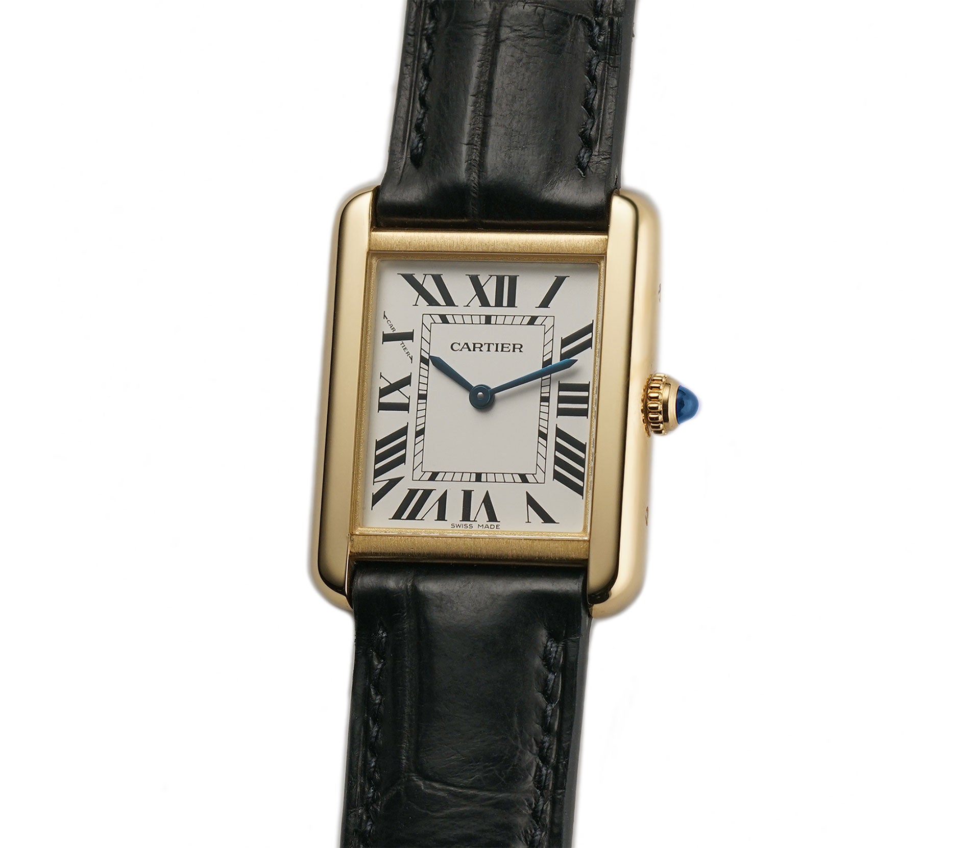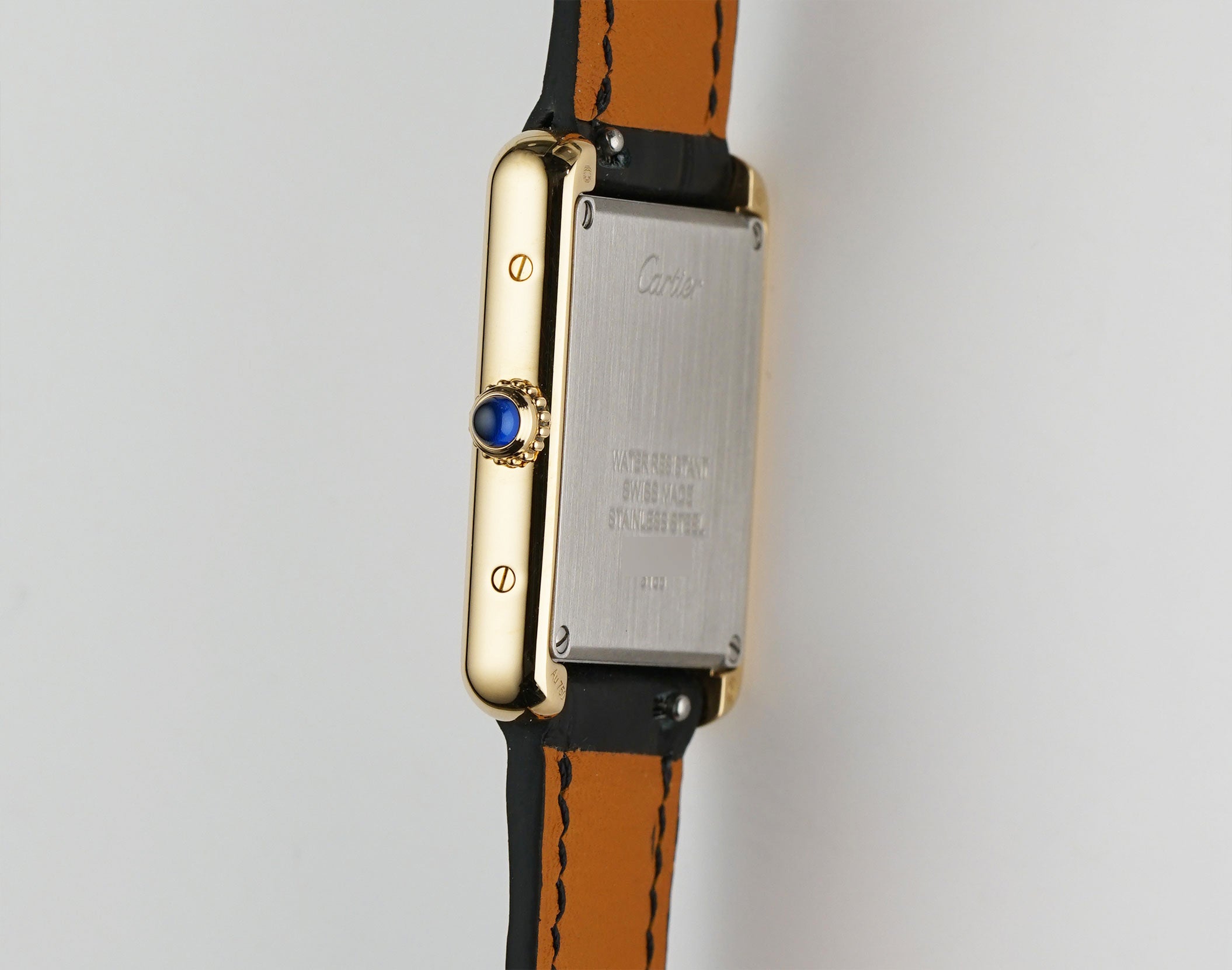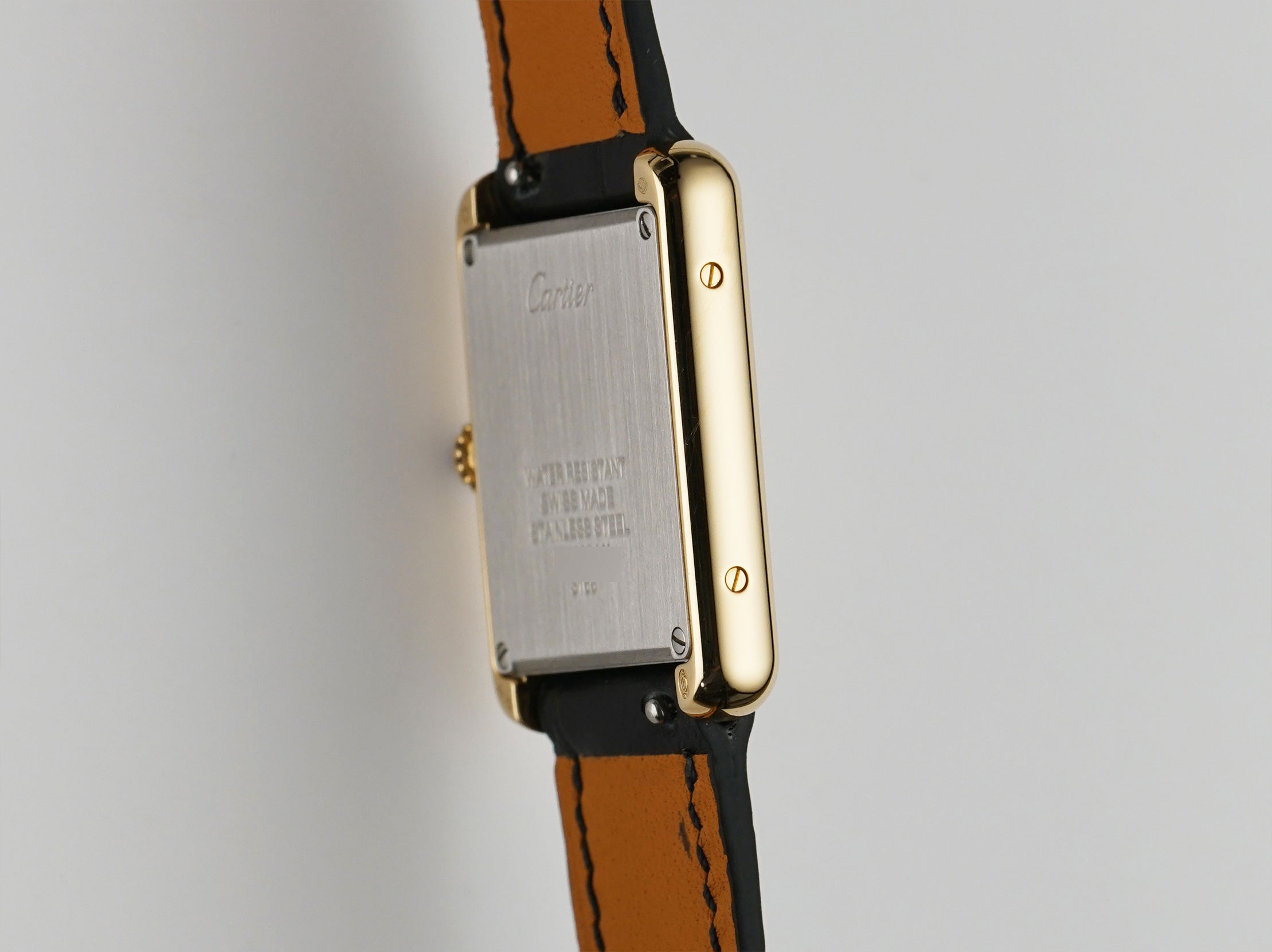 The case is made of 18k yellow gold, while the case back is of stainless steel. Both mirror and satin finishes are used to create a contrasting look. The watch is paired with a black leather non-Cartier strap (unworn condition) and that is accompanied by an 18k yellow gold Cartier tang buckle.