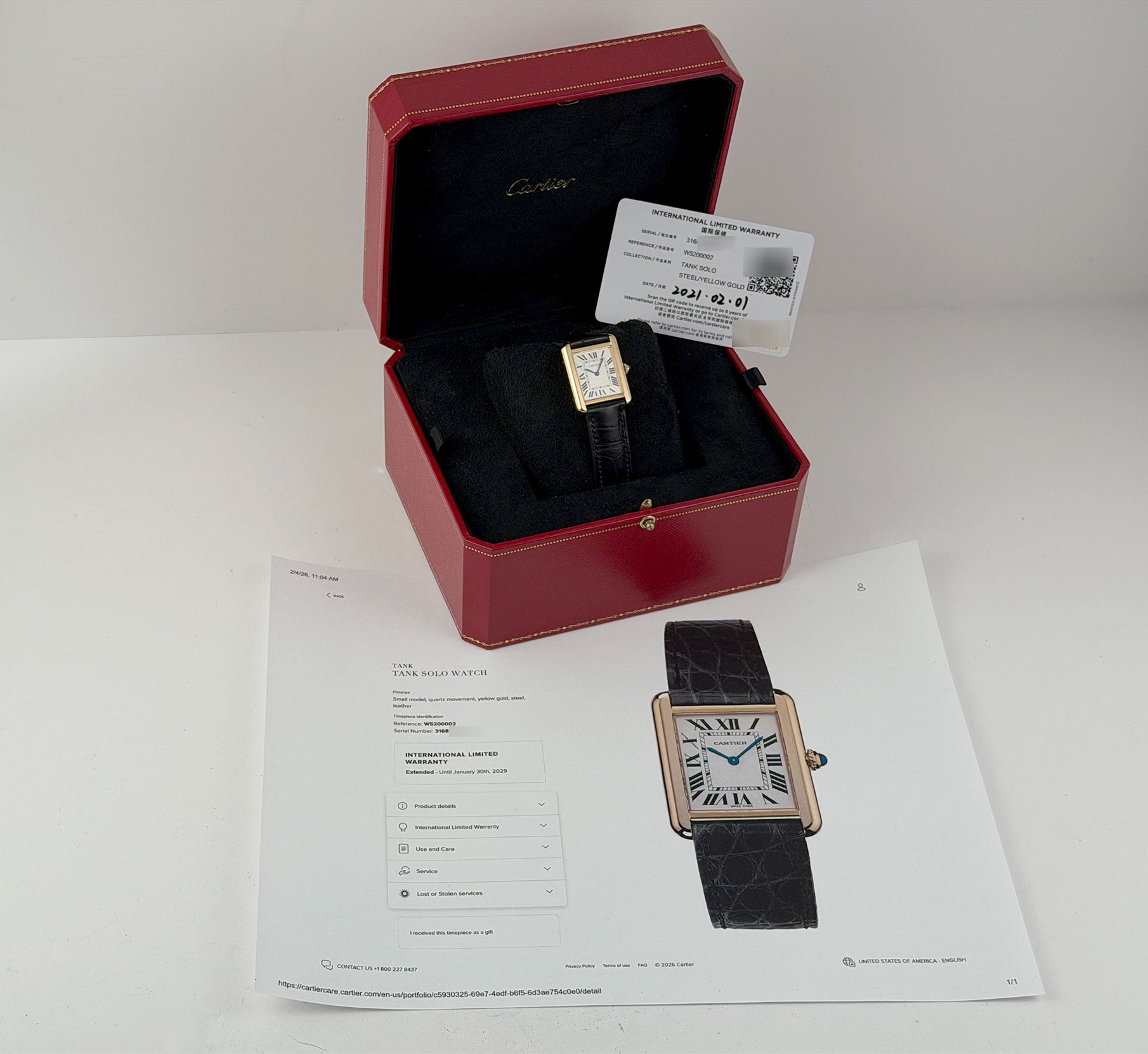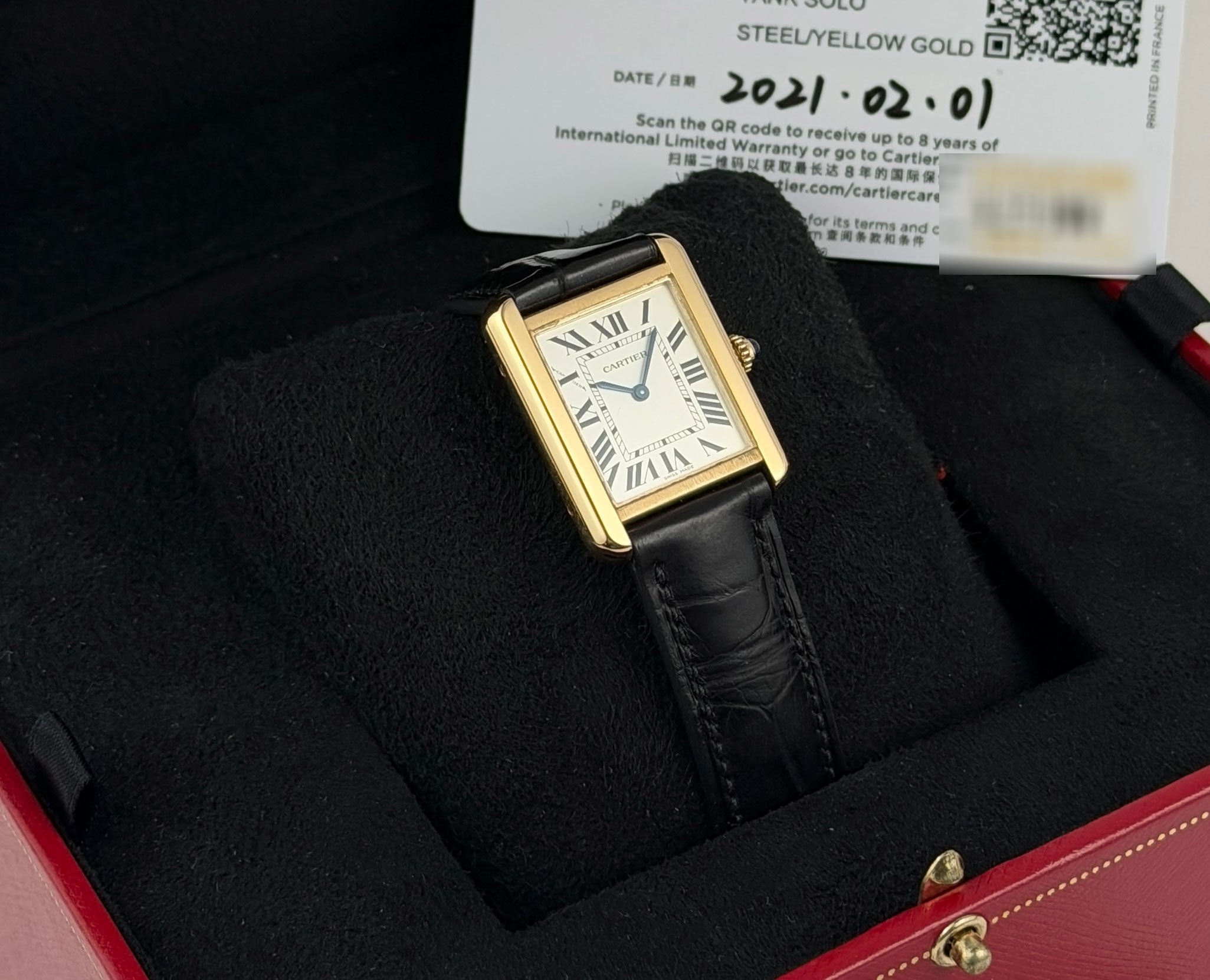Additionally, the watch is covered under a factory Cartier warranty until 2029.