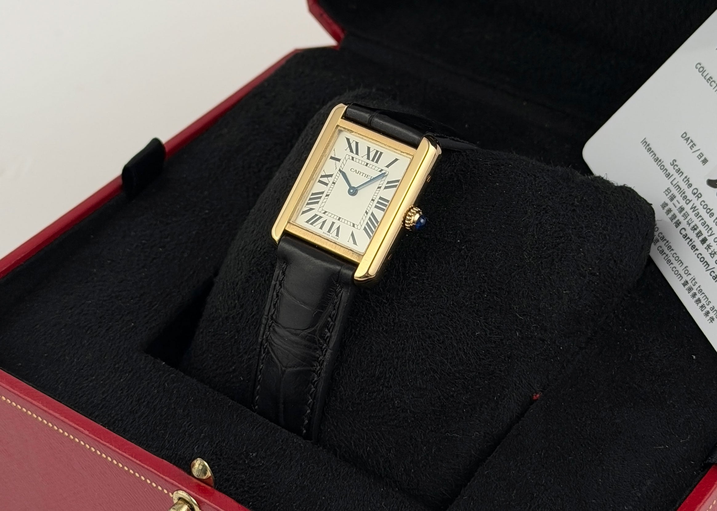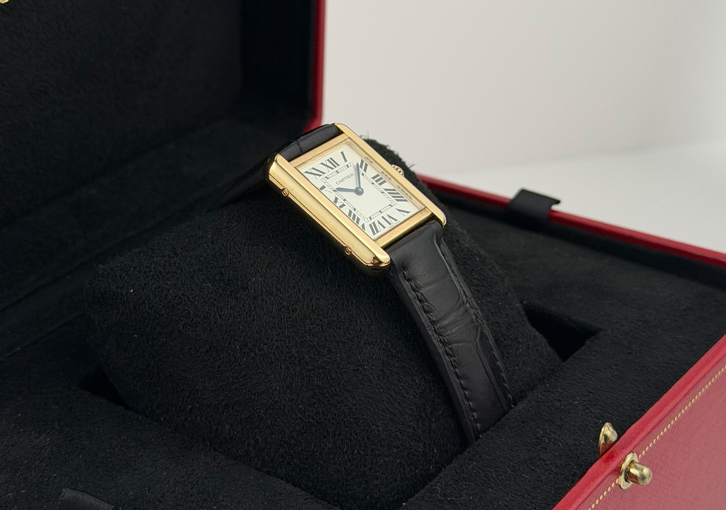 The condition of this 3168 24mm Tank Solo is in excellent condition for a previously owned watch. The case does have areas of mirror-like finish which are prone to hairlines (marks visible when with high resolution cameras or if angled at certain lighting). Pictures are part of the description so please refer to the pictures in determining the condition, pictures are of the exact watch being offered.