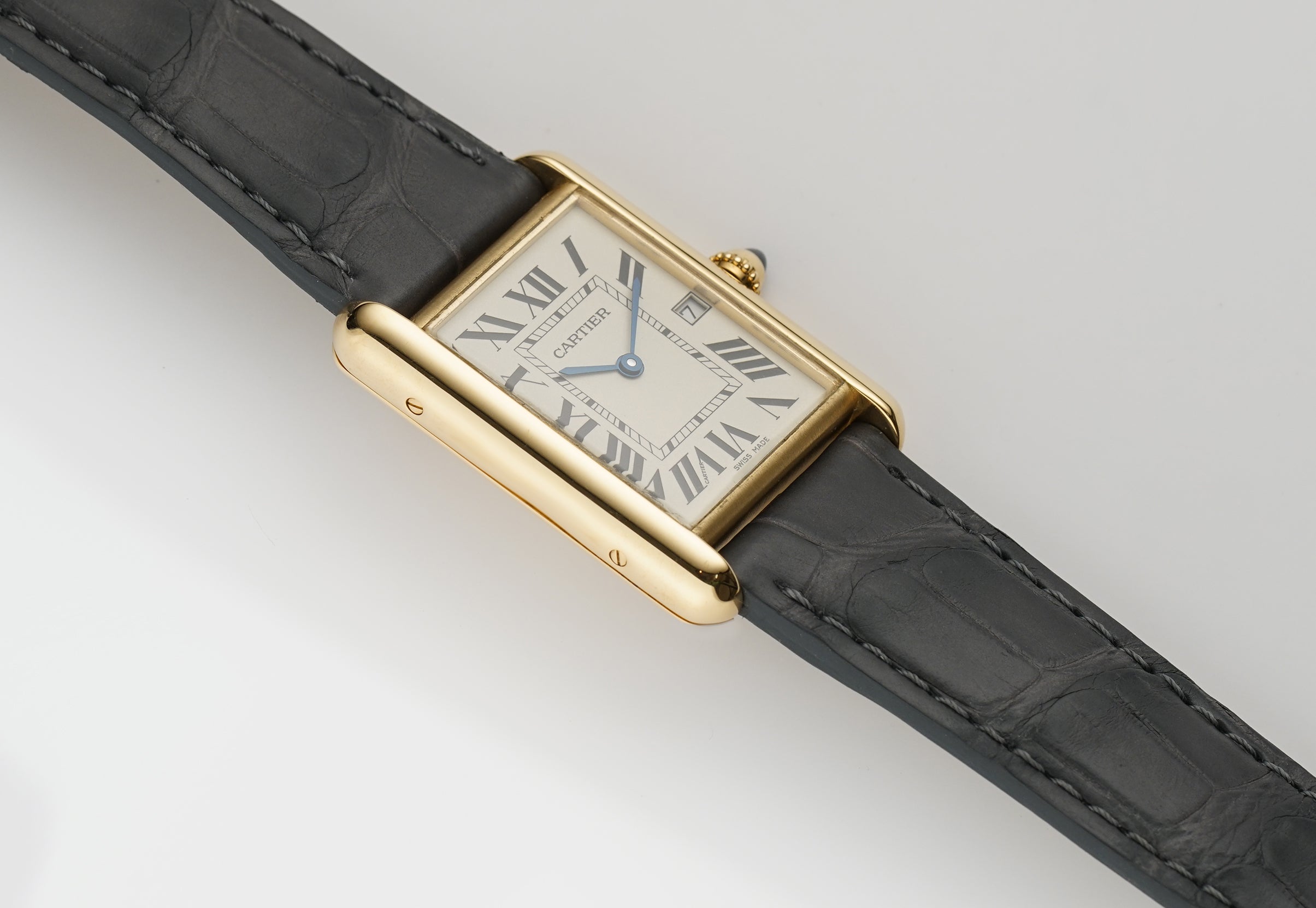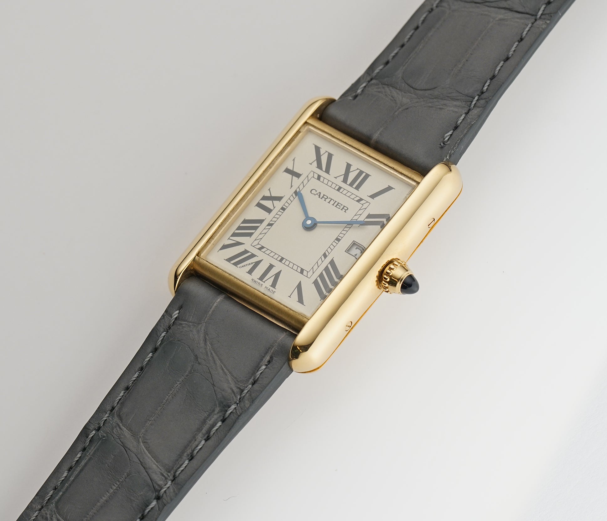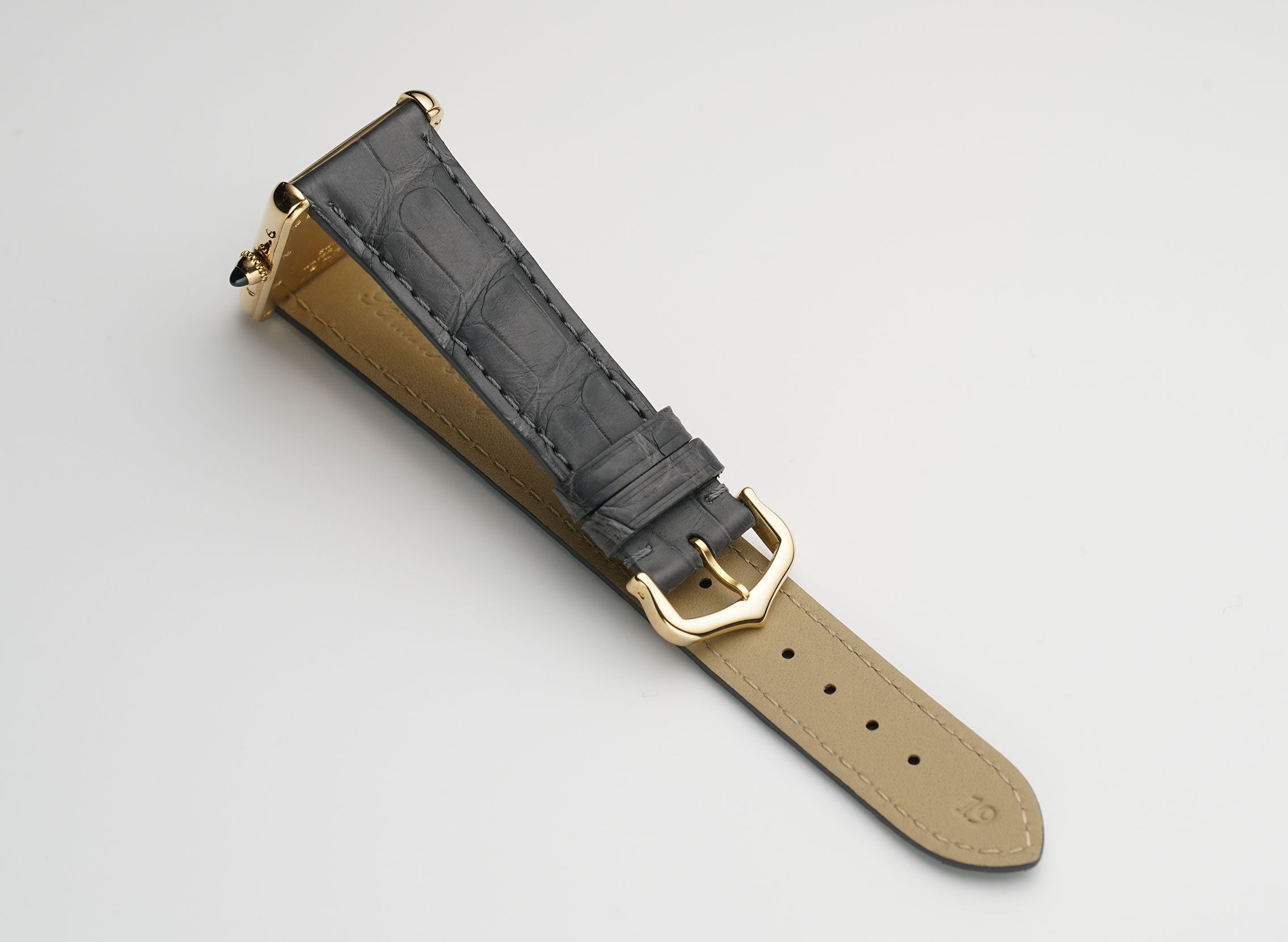 The case is of 18k yellow gold, displaying a contrasting look with both mirror and satin finishes. The watch is currently paired with an unworn grey leather John Rousseau (high quality Paris-made) strap that is accompanied by an 18k yellow gold Cartier tank buckle.
