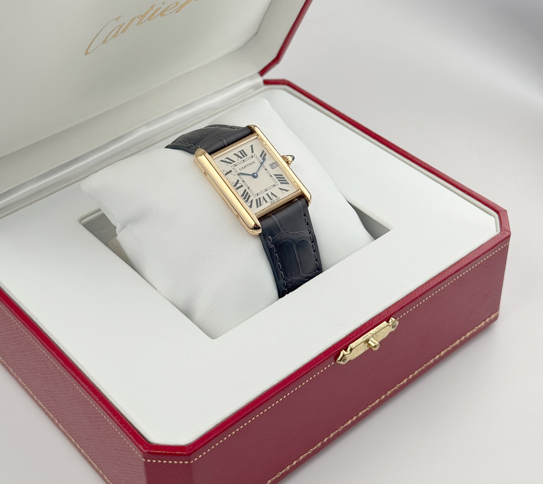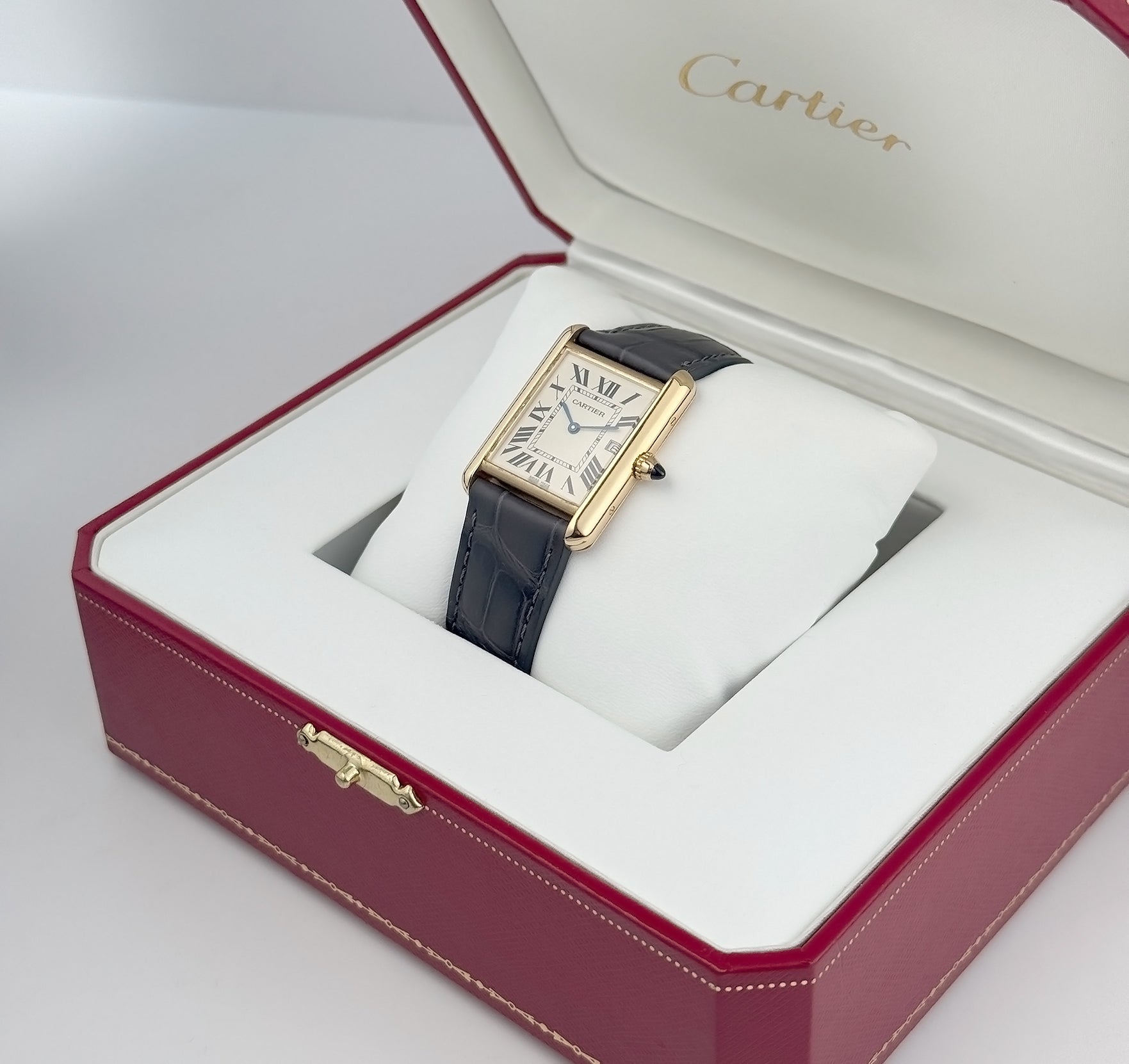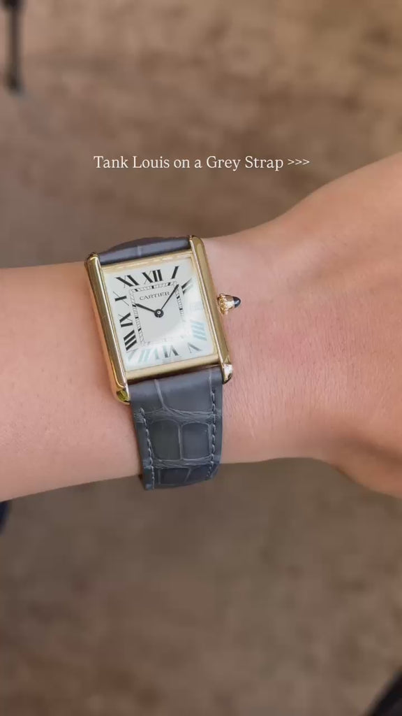 The case is of 18k yellow gold, displaying a contrasting look with both mirror and satin finishes. The watch is currently paired with an unworn grey leather John Rousseau (high quality Paris-made) strap that is accompanied by an 18k yellow gold Cartier tank buckle.