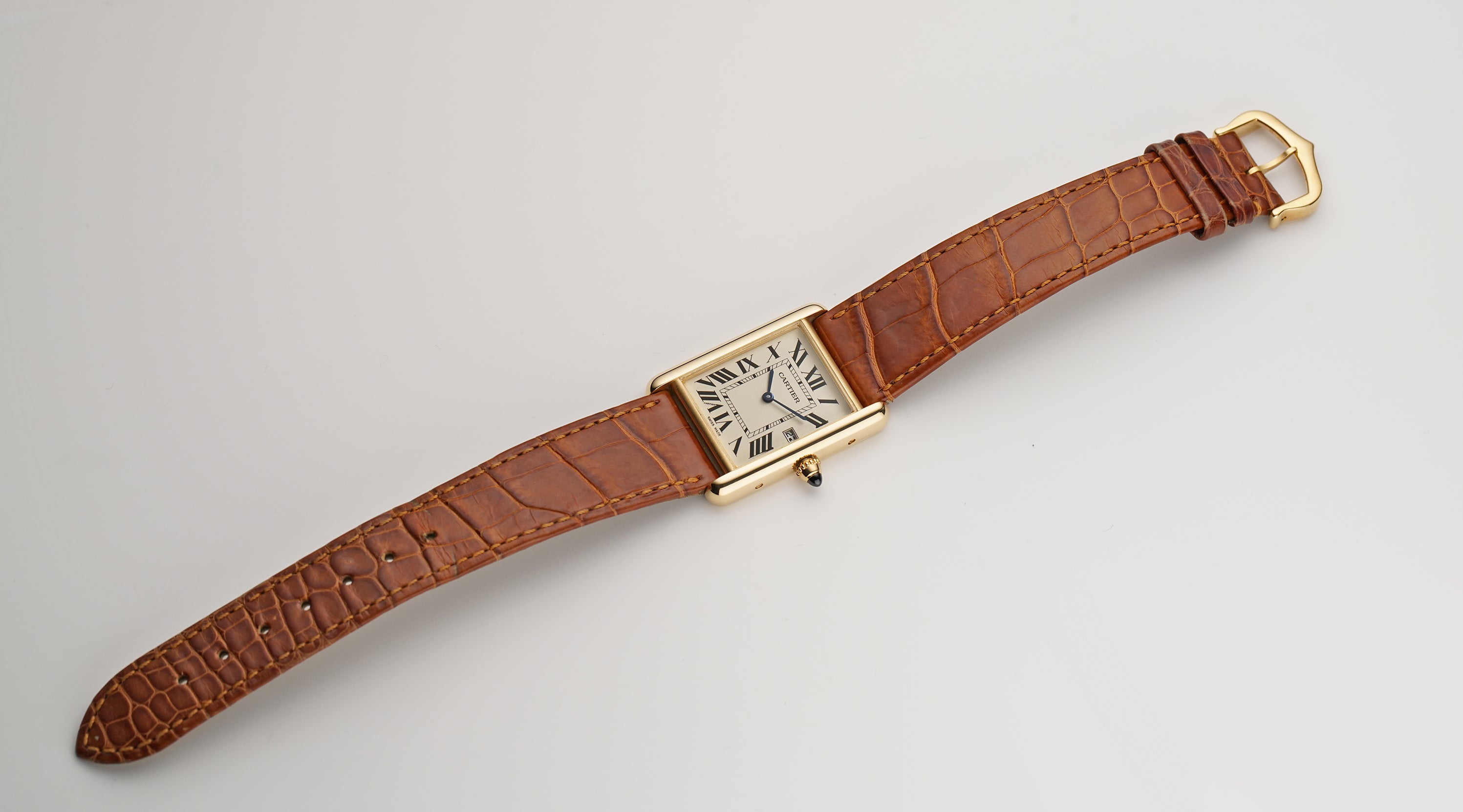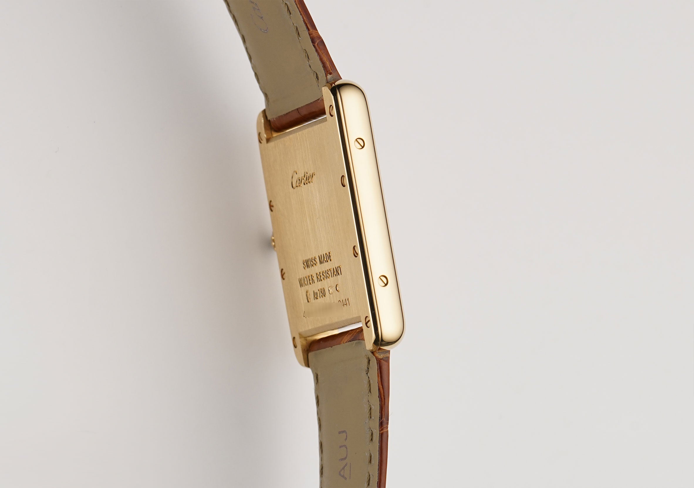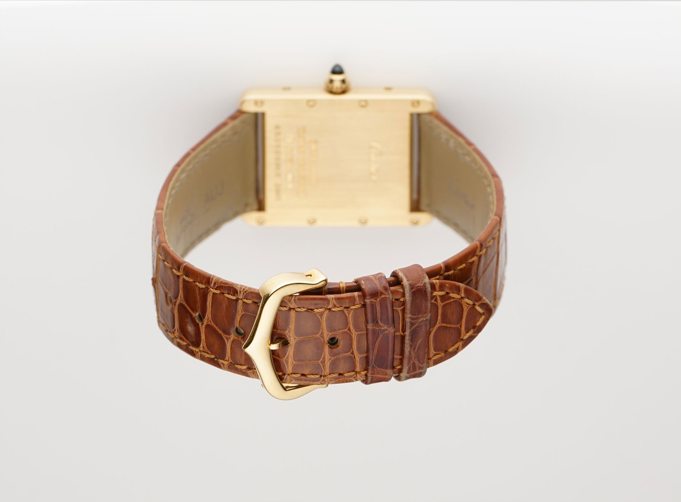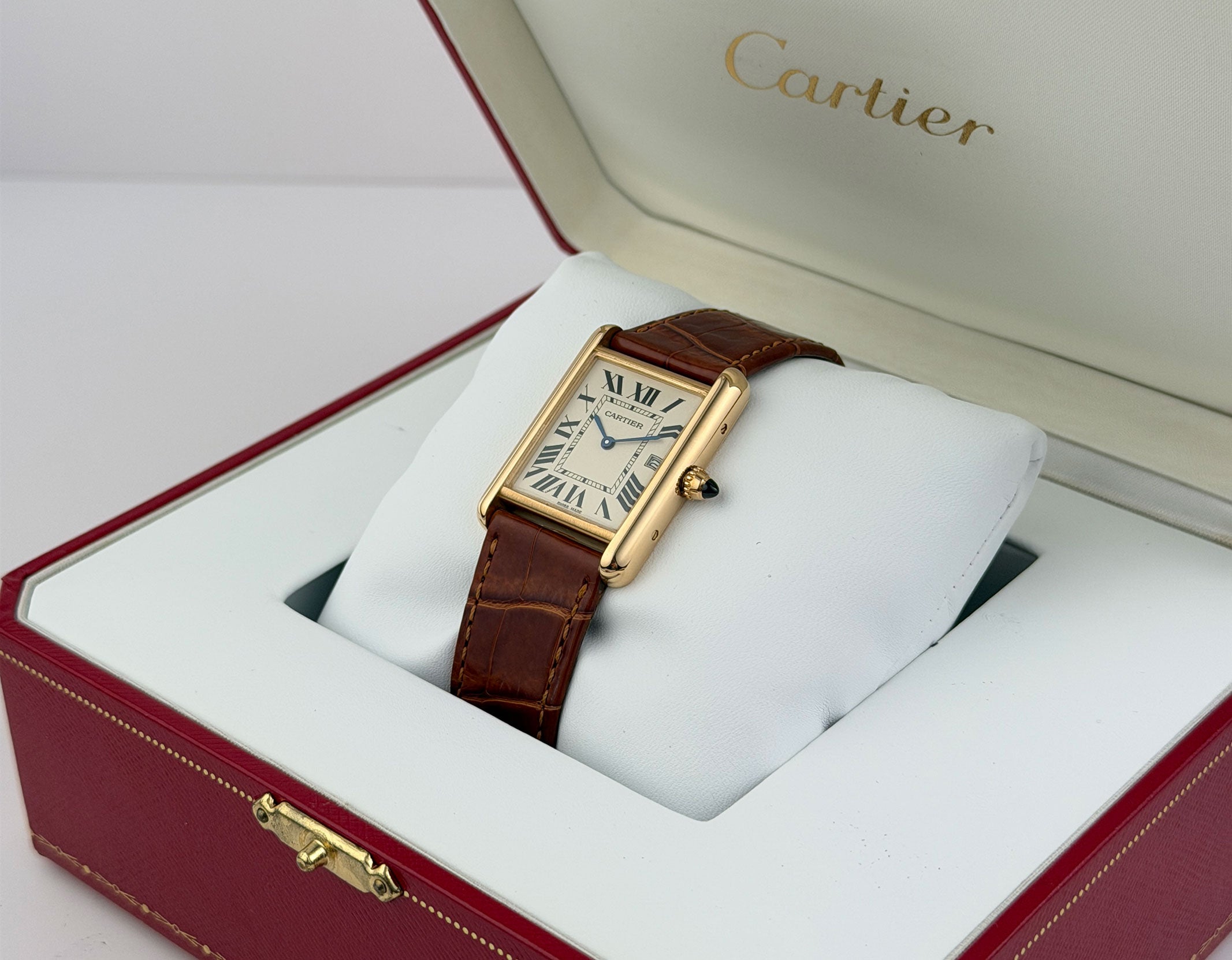 The case is of 18k yellow gold, displaying a contrasting look with both mirror and satin finishes. The watch is currently paired with a brown leather Cartier strap (approximately 80% condition) and that is accompanied by an 18k yellow gold Cartier tank buckle.