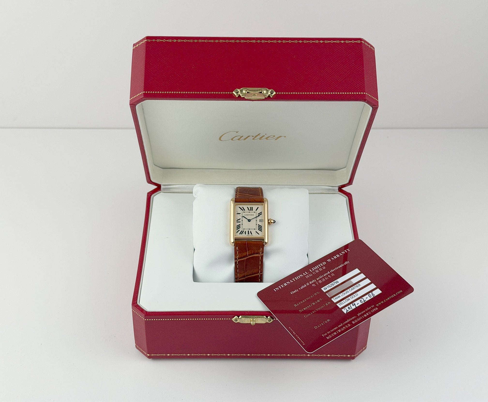 Included with the watch is a Cartier box and papers (dated 2019).