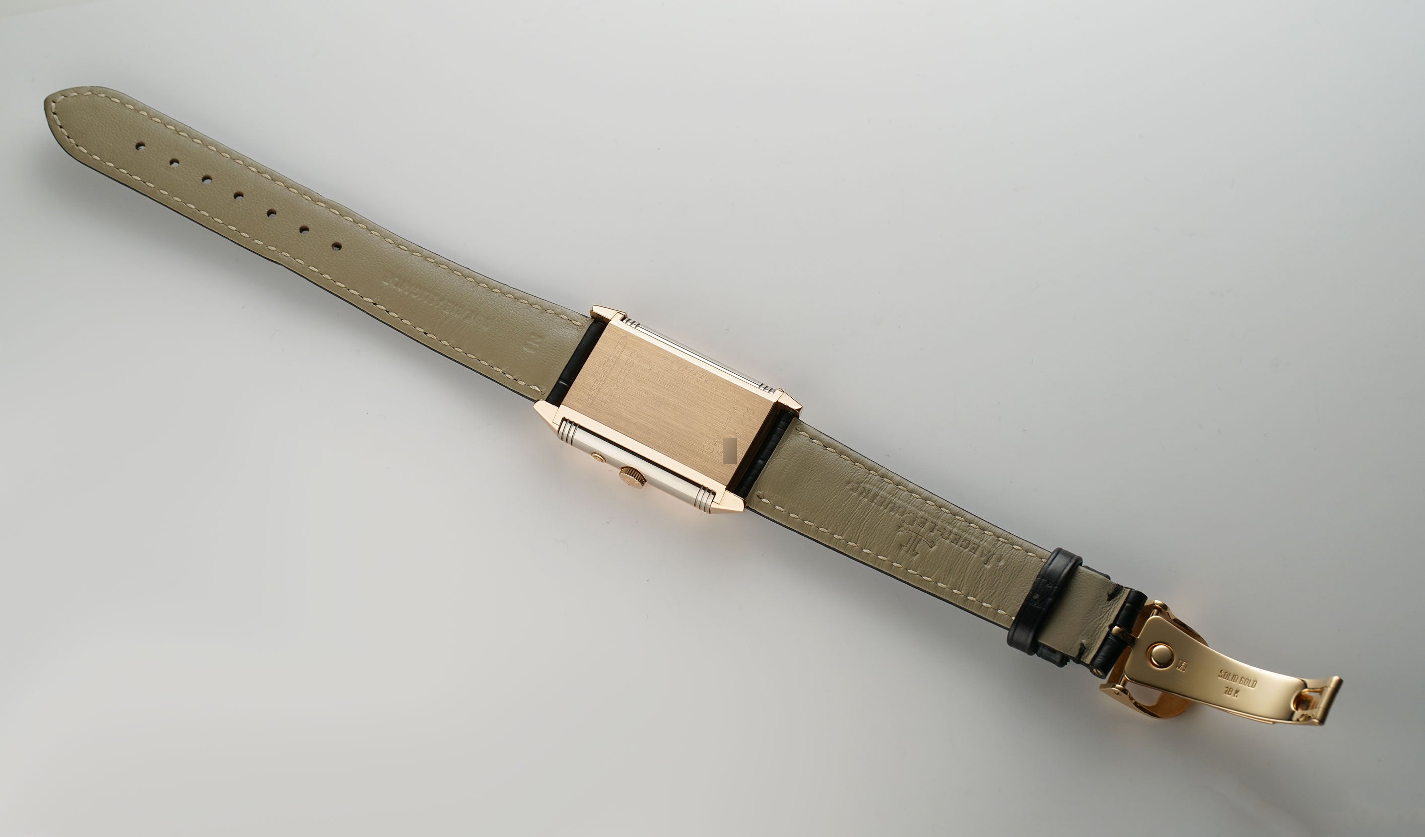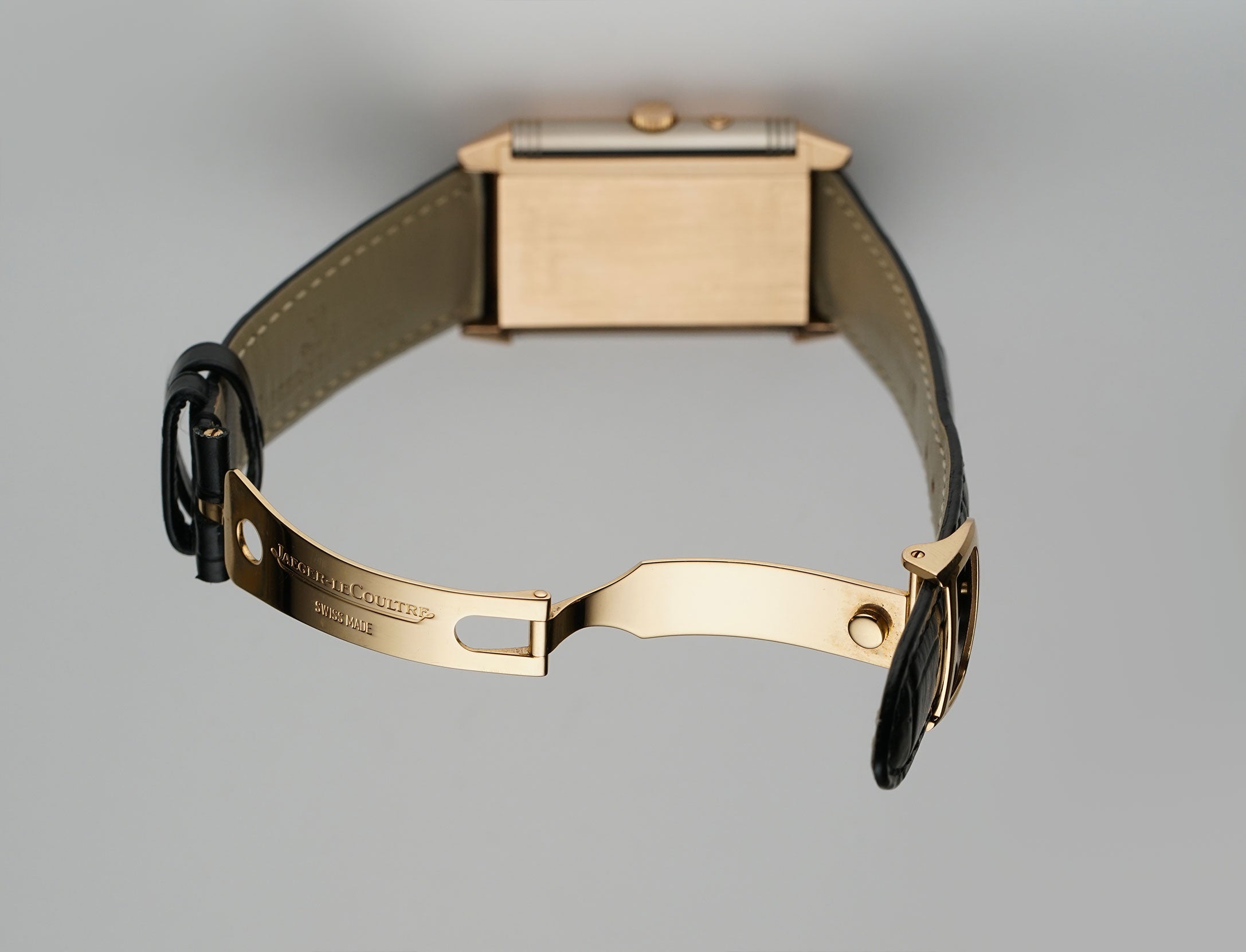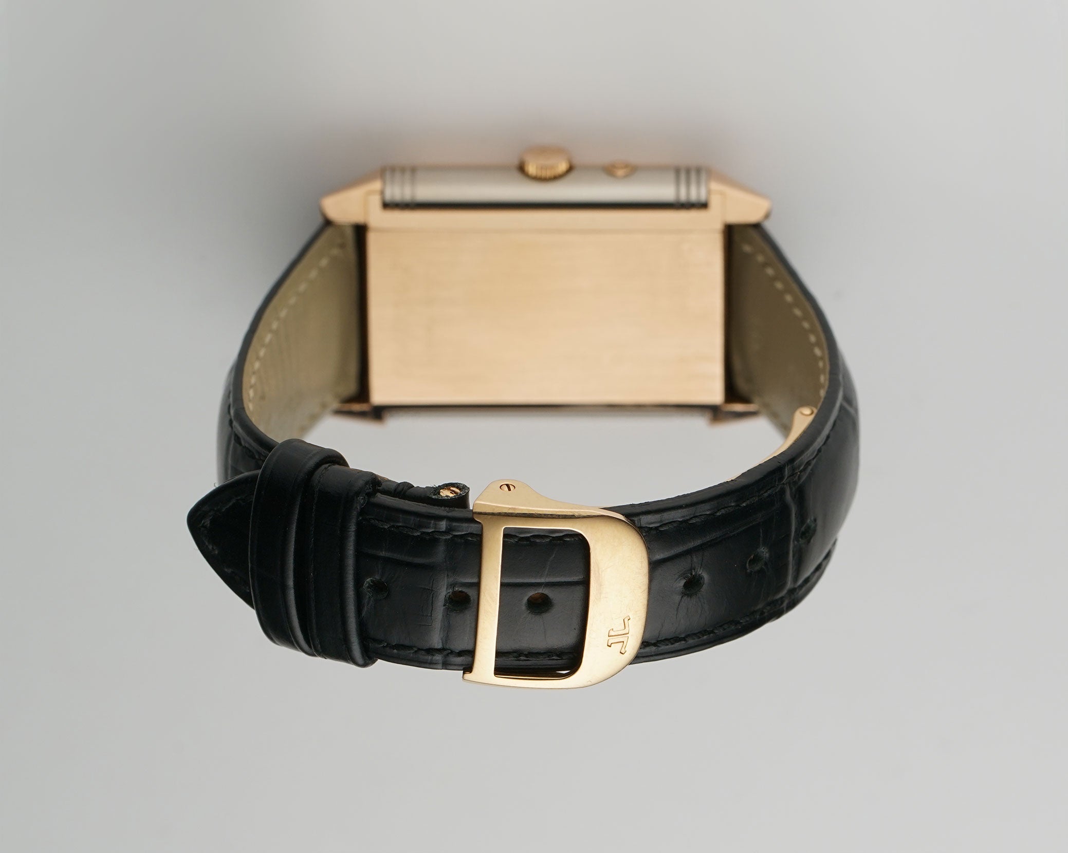 When looking at the timepiece with the main face, it is 18k rose gold with a mirror-like finish. Once you reverse the face, it displays an 18k white gold inner carriage with a mirror-like finish and 18k rose gold lugs turning it into a two tone watch. It is currently mounted on a JLC black leather strap that is unworn and that is paired with a JLC 18k rose gold deployment buckle.