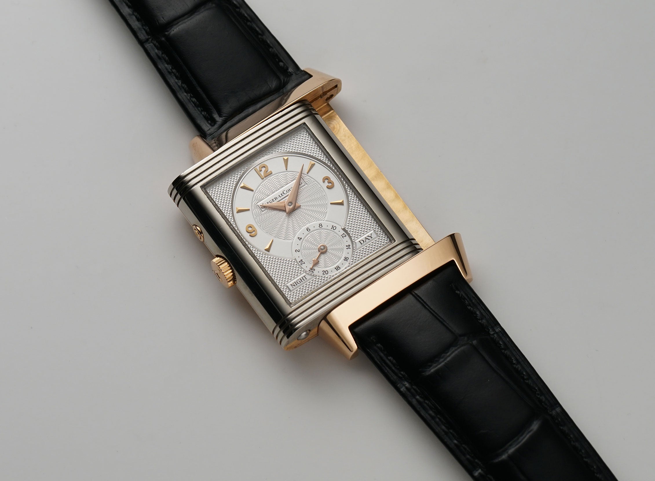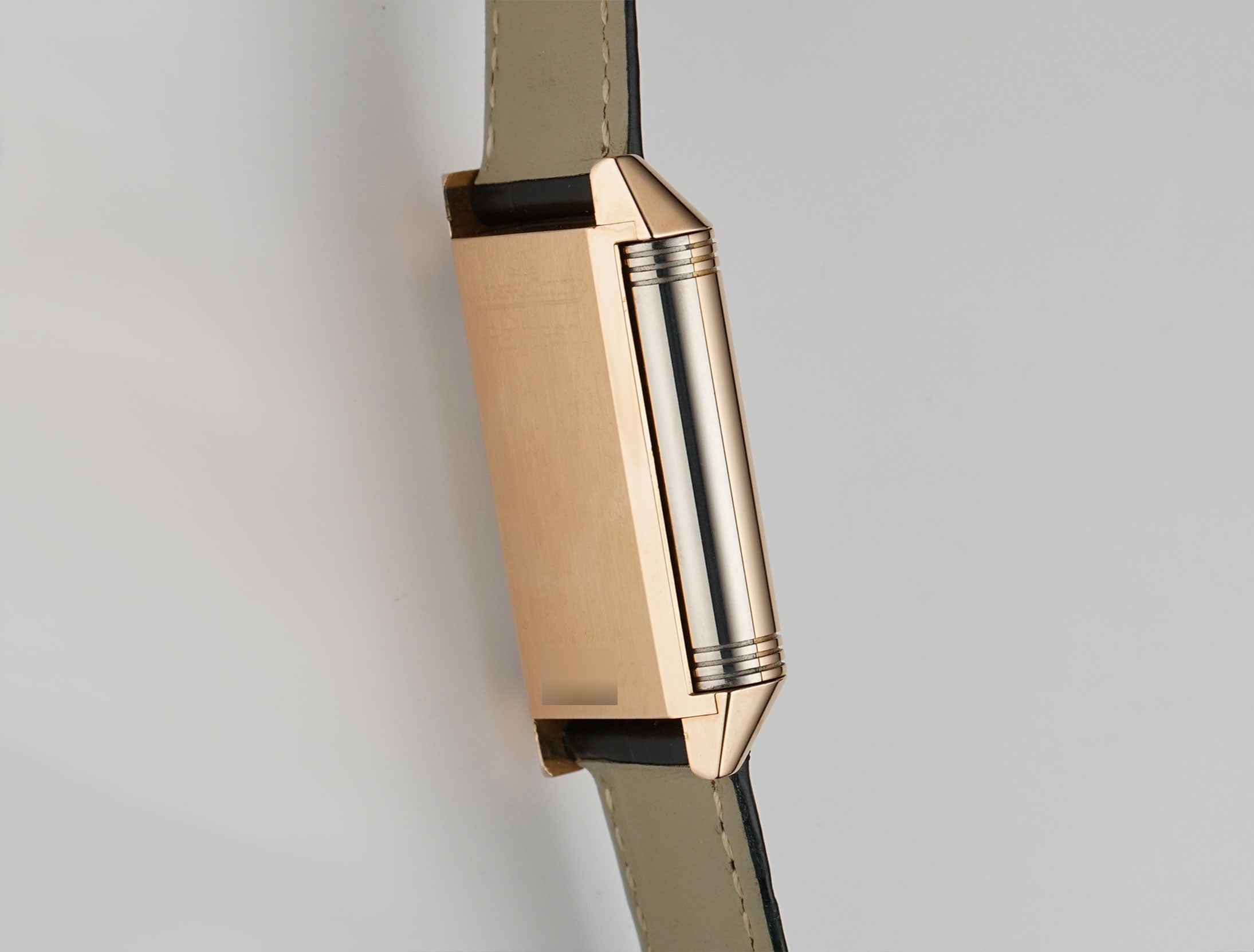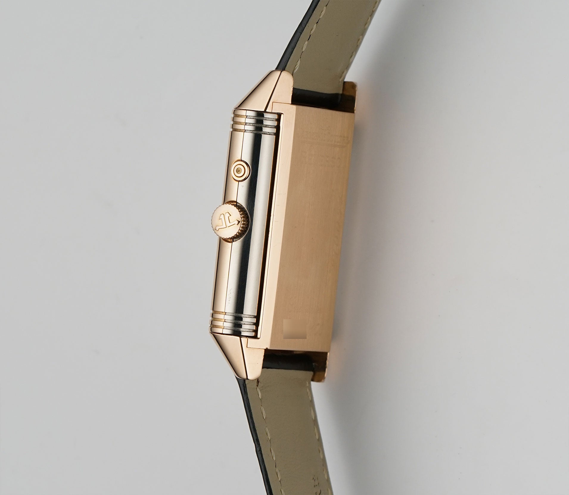 When looking at the timepiece with the main face, it is 18k rose gold with a mirror-like finish. Once you reverse the face, it displays an 18k white gold inner carriage with a mirror-like finish and 18k rose gold lugs turning it into a two tone watch. It is currently mounted on a JLC black leather strap that is unworn and that is paired with a JLC 18k rose gold deployment buckle.