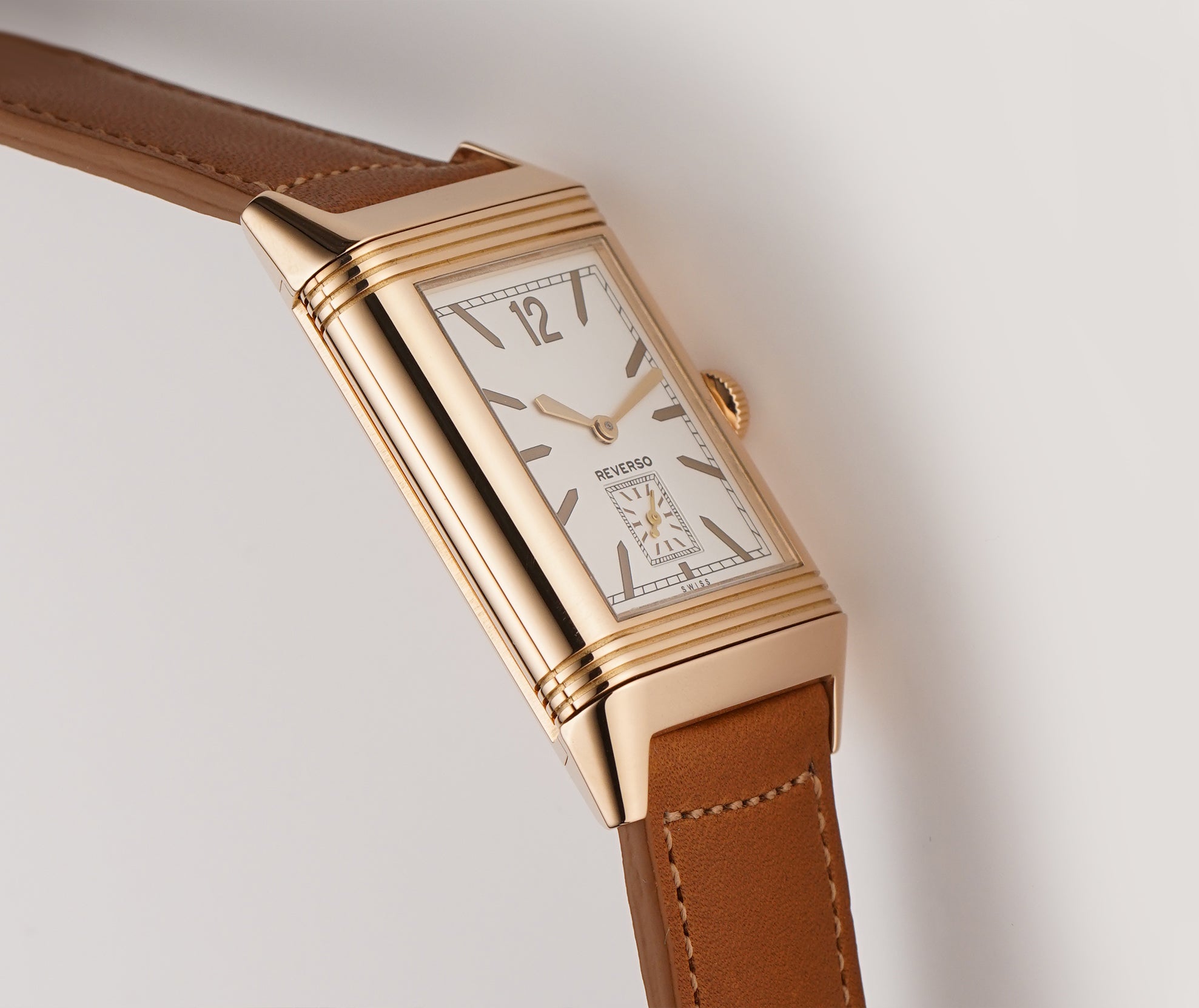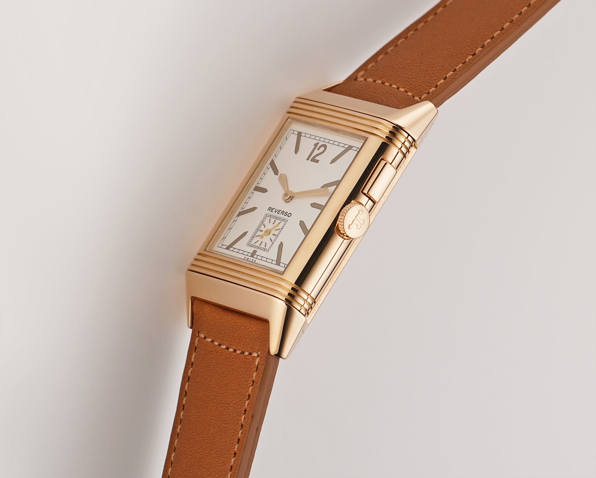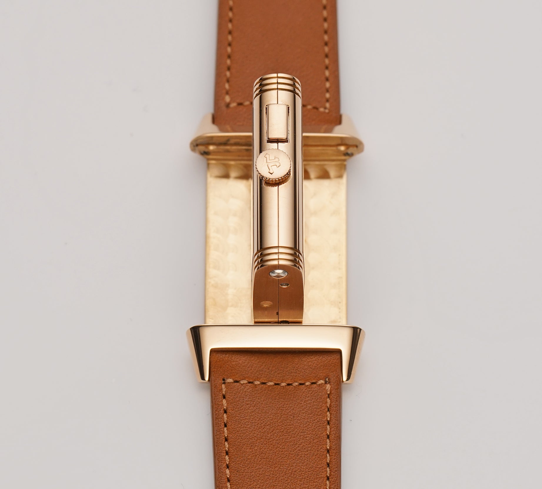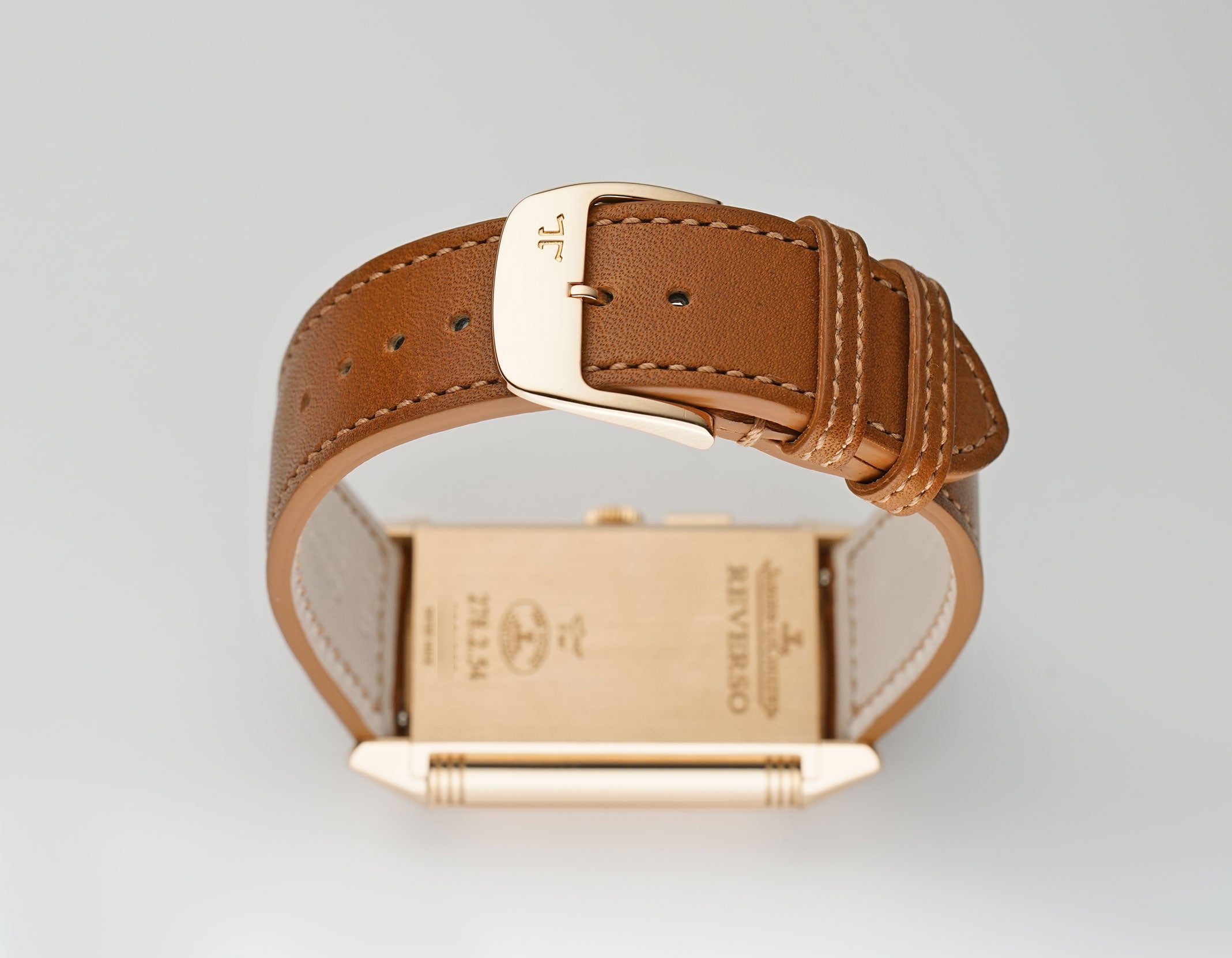The case is made of 18k rose gold with a mirror-finished inner case, a perlage-finished inner carriage and a satin-finished case back. It is currently mounted on an unworn brown JLC leather strap and that is equipped with an 18k rose gold JLC tang buckle.