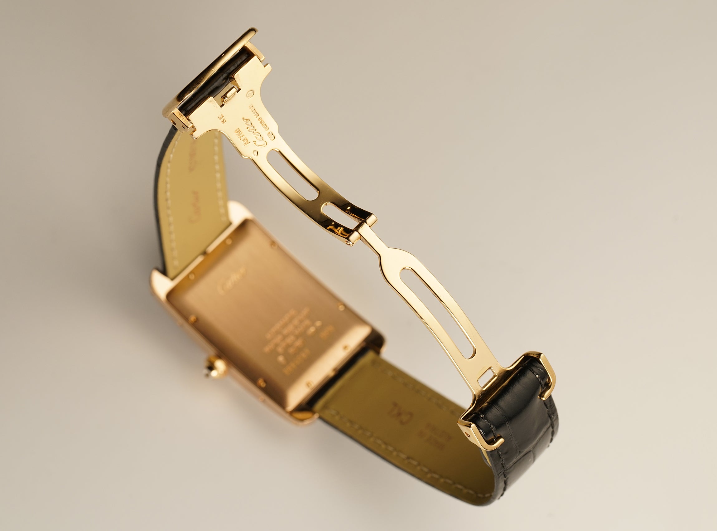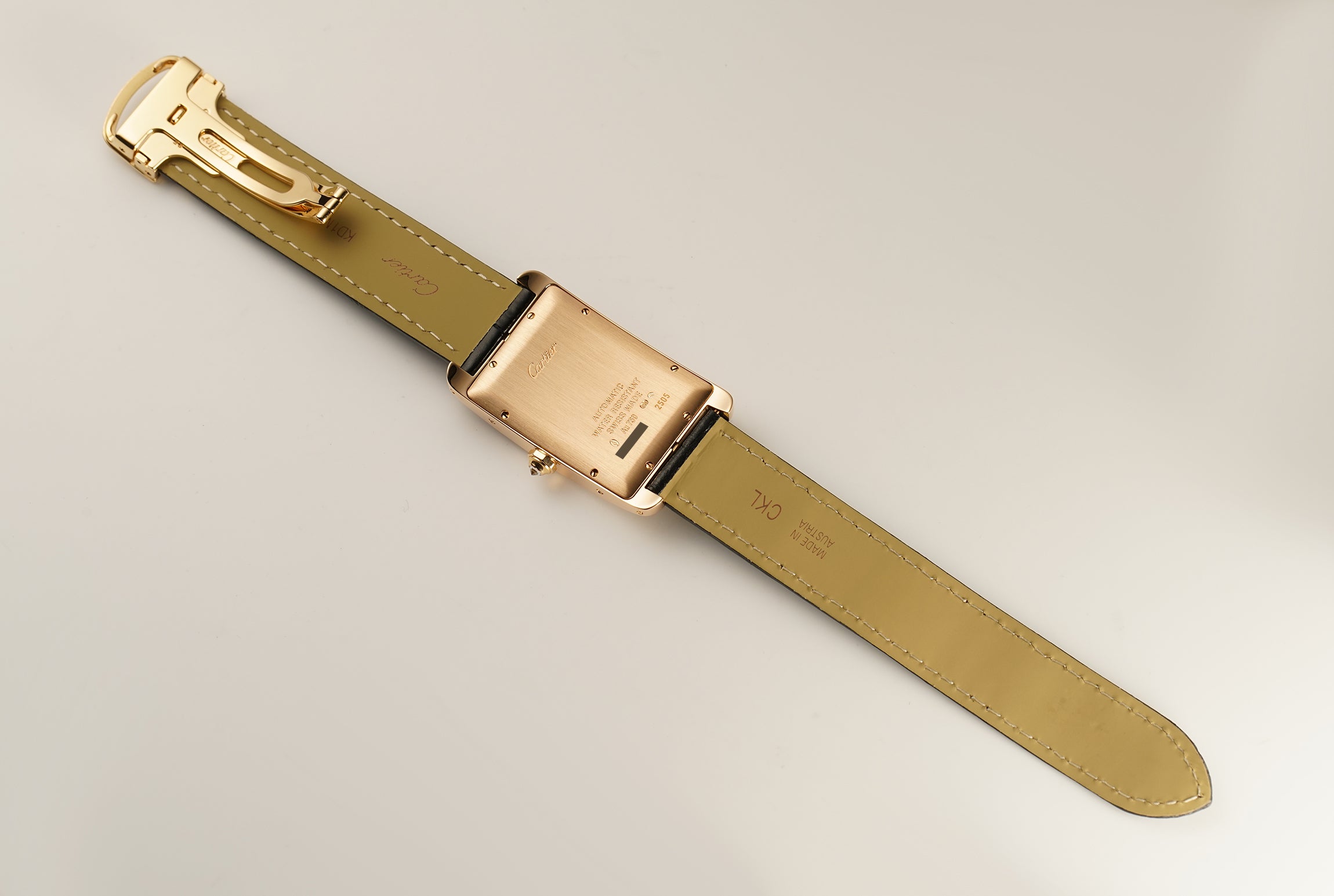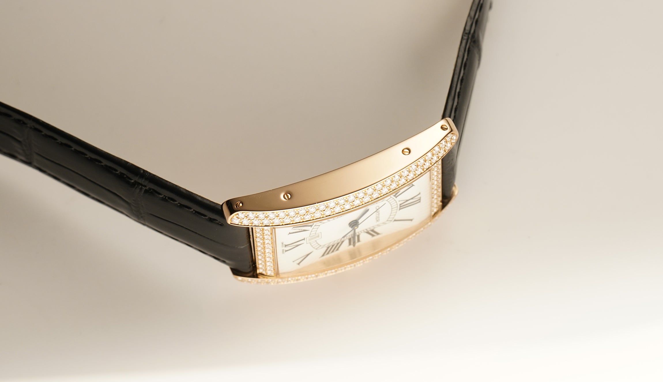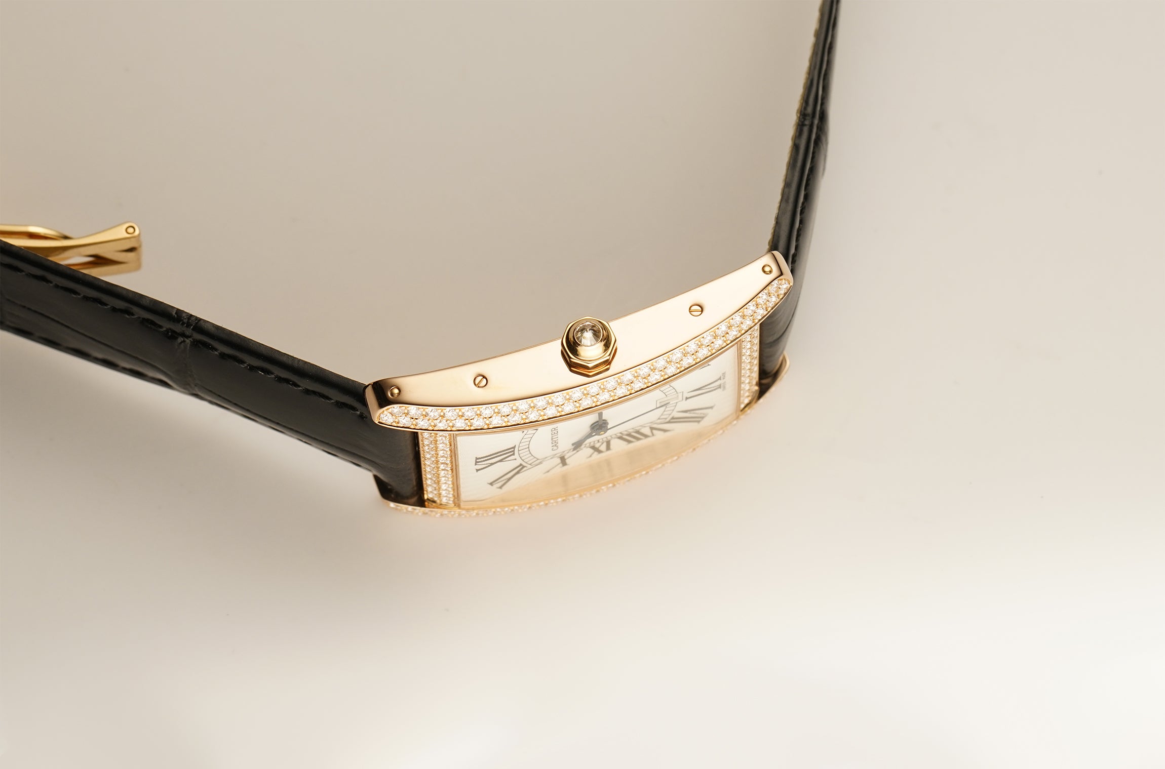 The case is made of 18k rose gold displaying a mirror finish on the sides and satin on the case back while the bezel and lugs are factory Cartier set with diamonds. Also factory Cartier set with a diamond is the 18k rose gold crown. It is currently mounted on a black leather Cartier strap (unworn condition) and that is paired with an 18k rose gold Cartier deployment buckle.