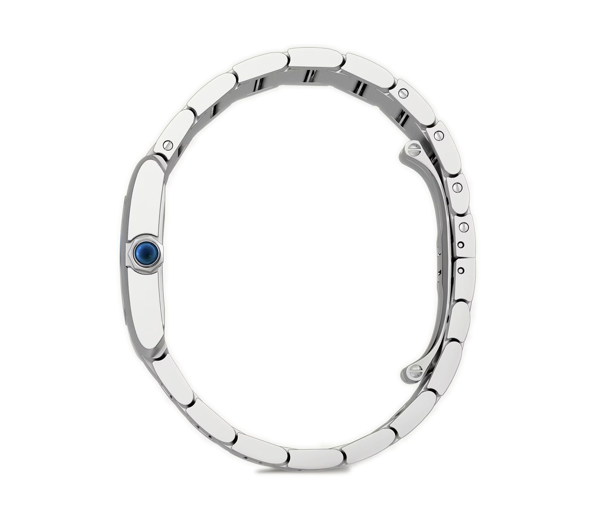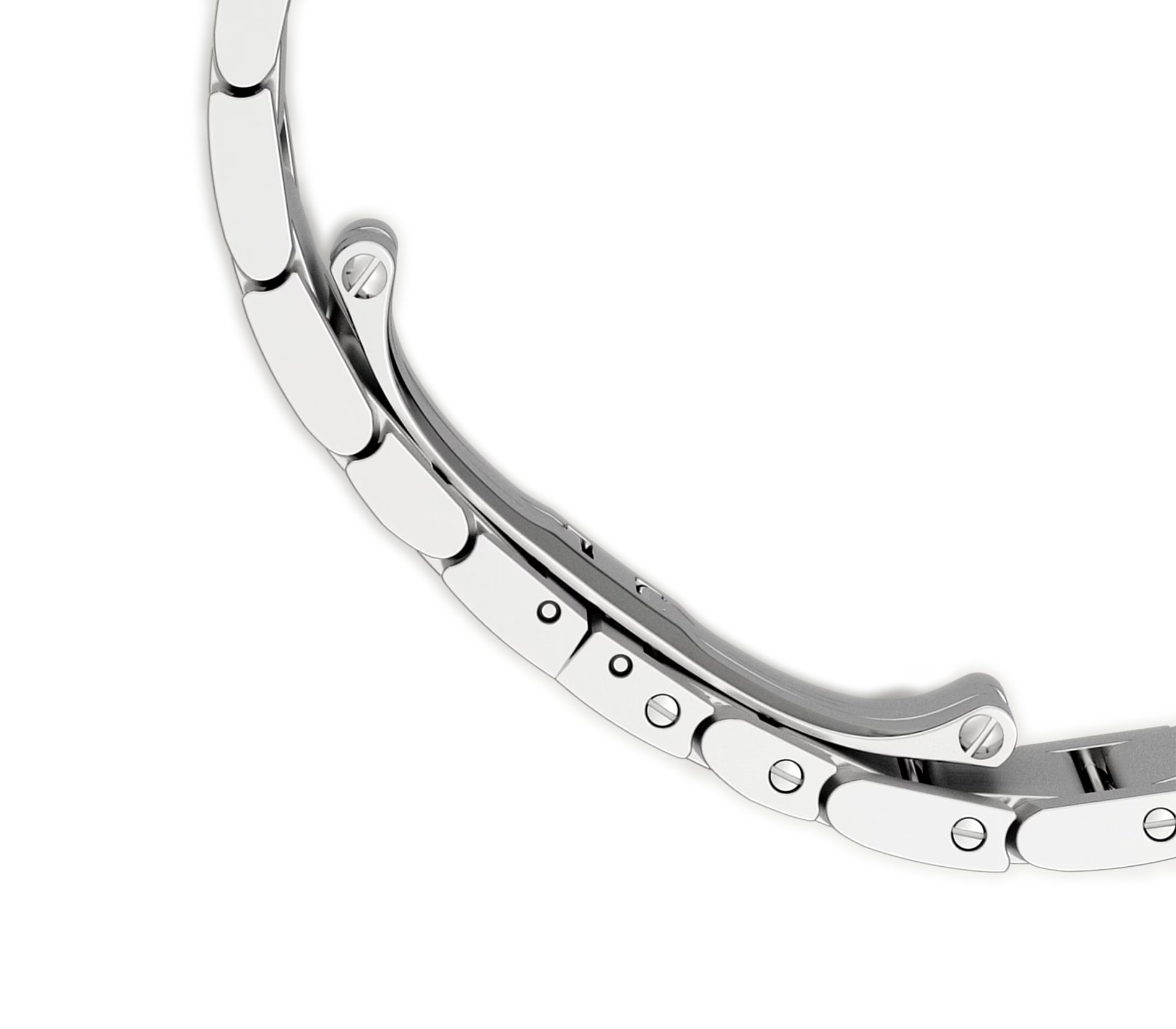 Case is made of a high polished finish stainless steel including the crown and sides of the case. The top of the lugs features a satin finished stainless steel. The watch is paired with a stainless steel case with high polished finish stainless steel and satin finished stainless steel links with a deployment buckle.