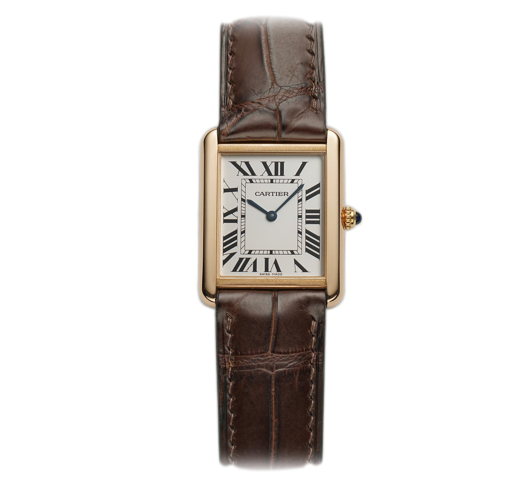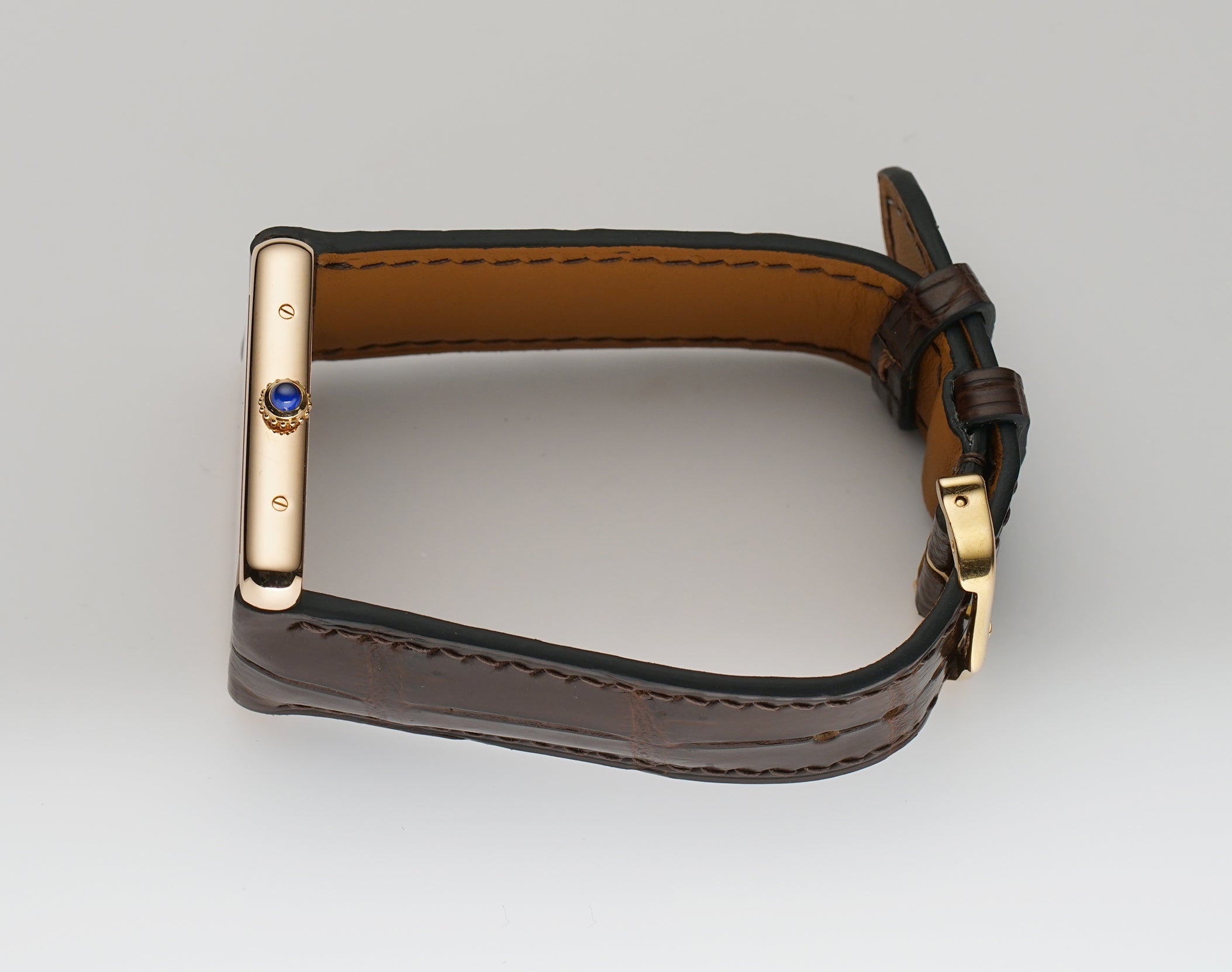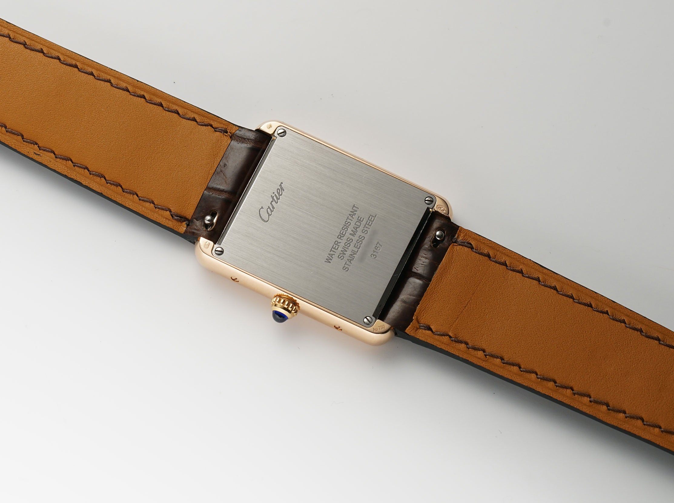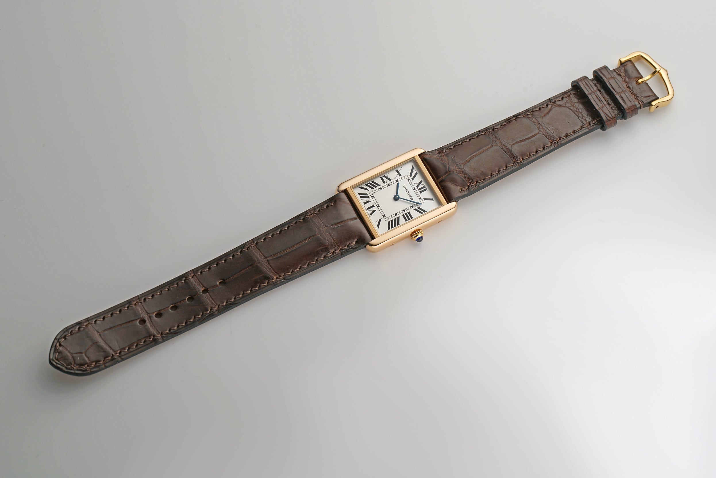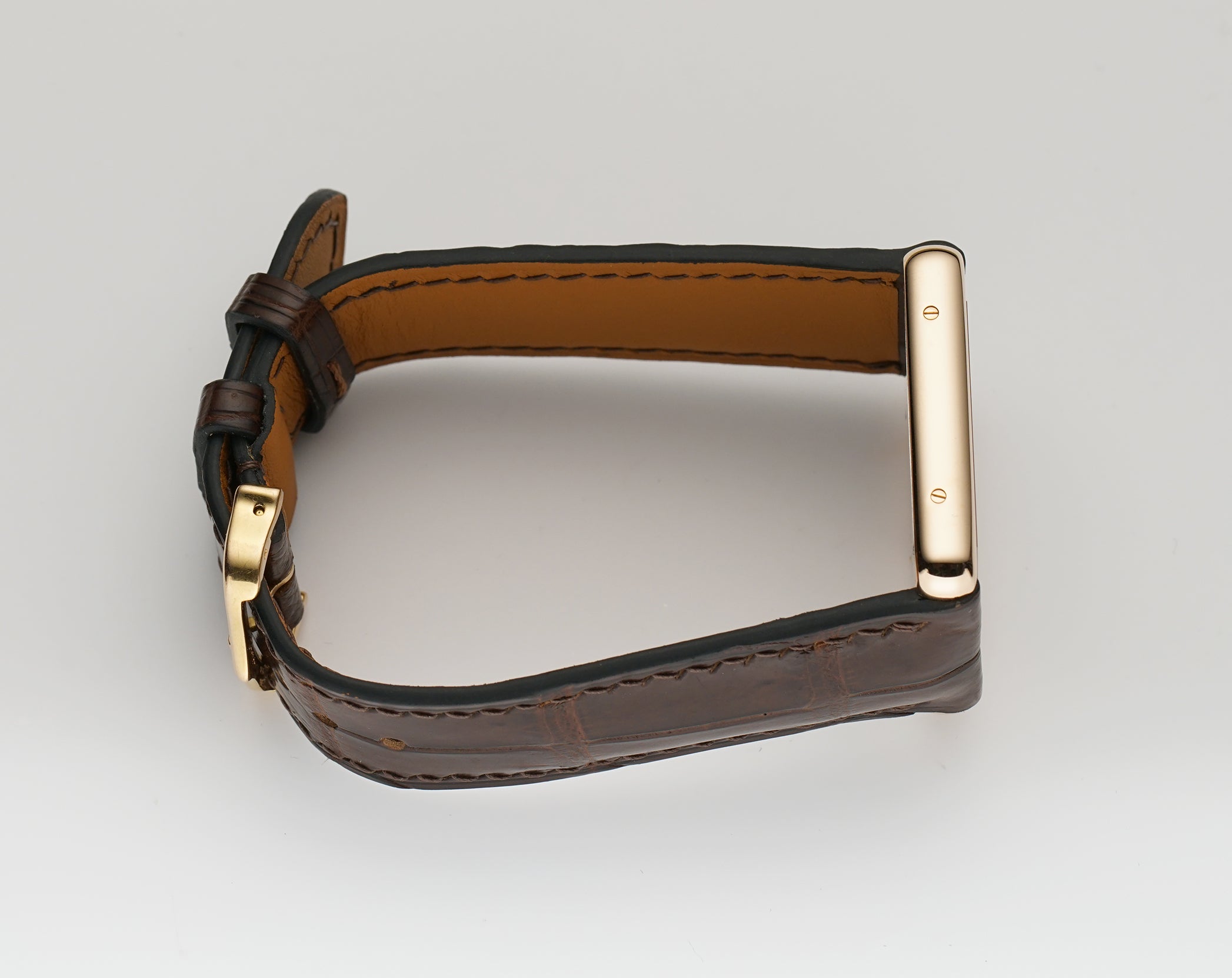 The case is made of 18k rose gold, mostly mirror-finished with hints of satin finish between the lugs. The case back is of stainless steel, featuring a satin finish. Mounted on the watch is an unworn non-Cartier brown leather strap and that is paired with a Cartier 18k rose gold tang buckle.