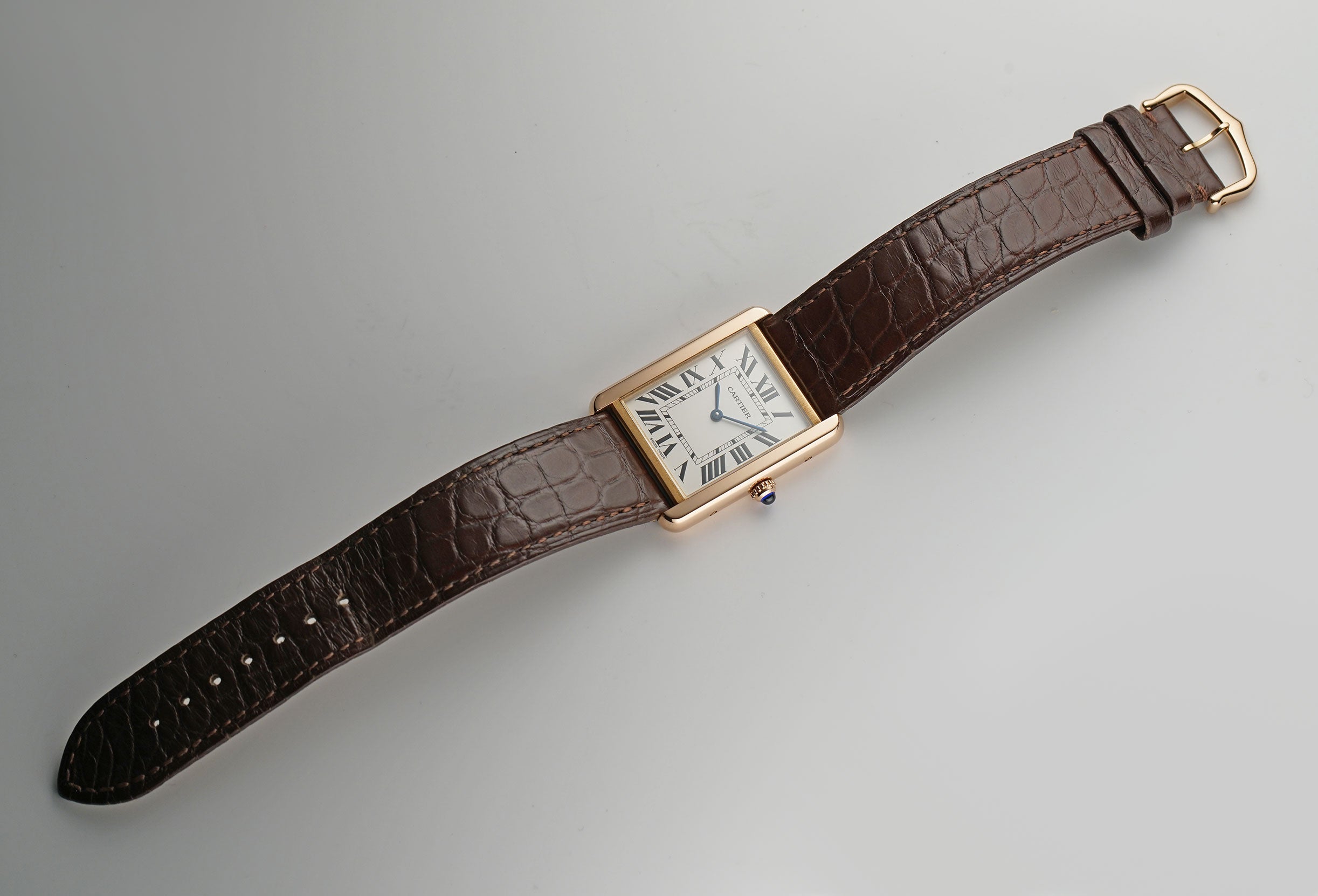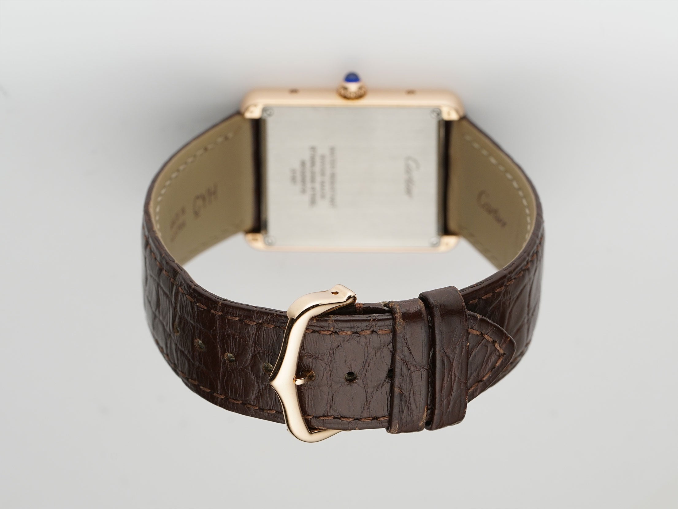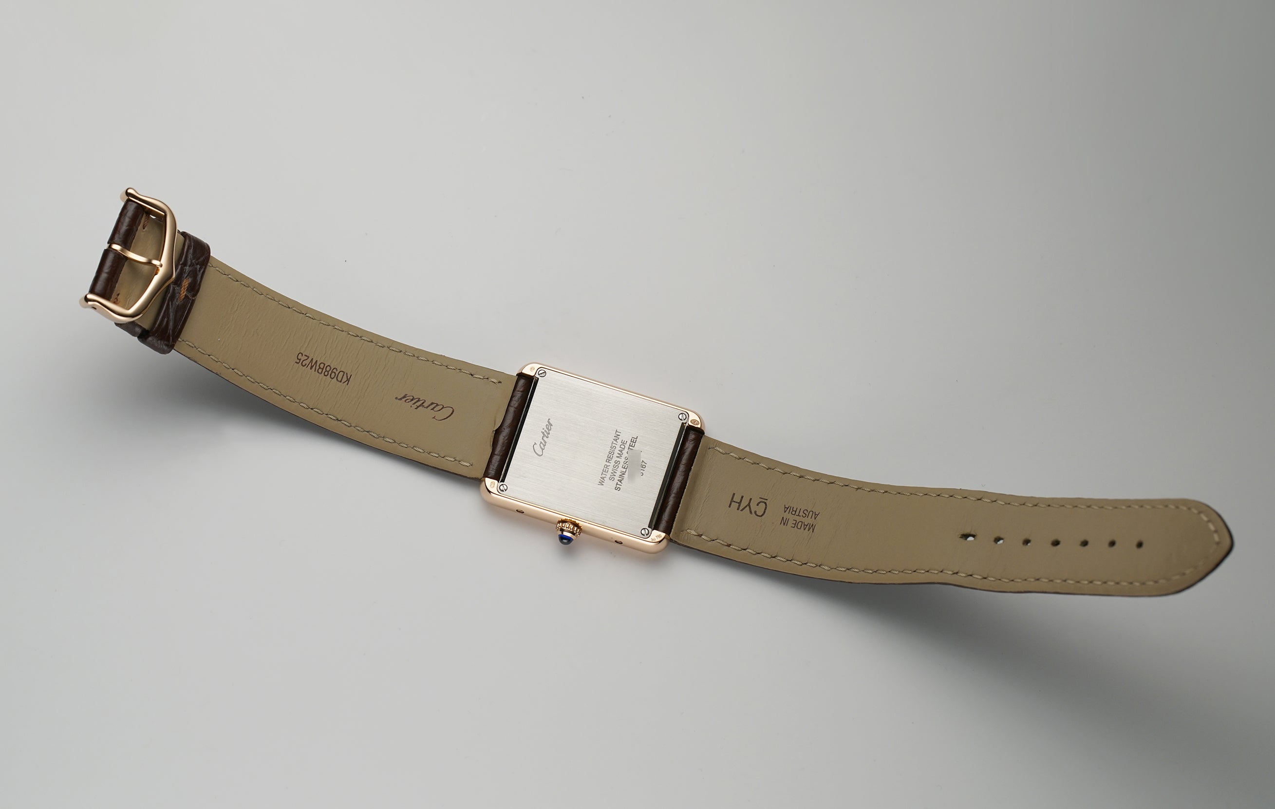 The case is made of 18k rose gold, mostly mirror-finished with hints of satin finish between the lugs. The case back is of stainless steel, featuring a satin finish. Mounted on the watch is a Cartier brown leather strap (approximately 95% condition) and that is paired with a Cartier 18k rose gold tang buckle.
