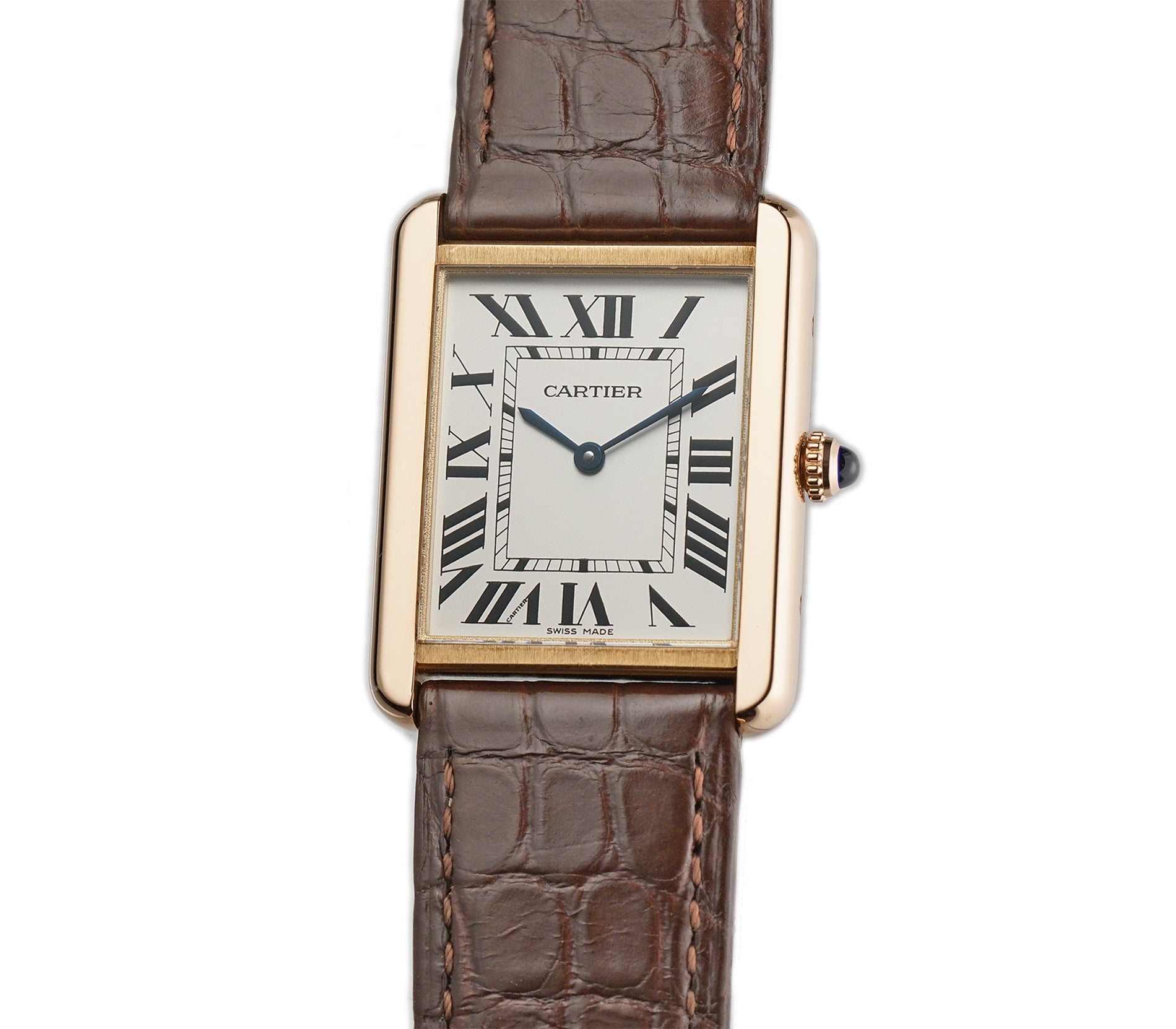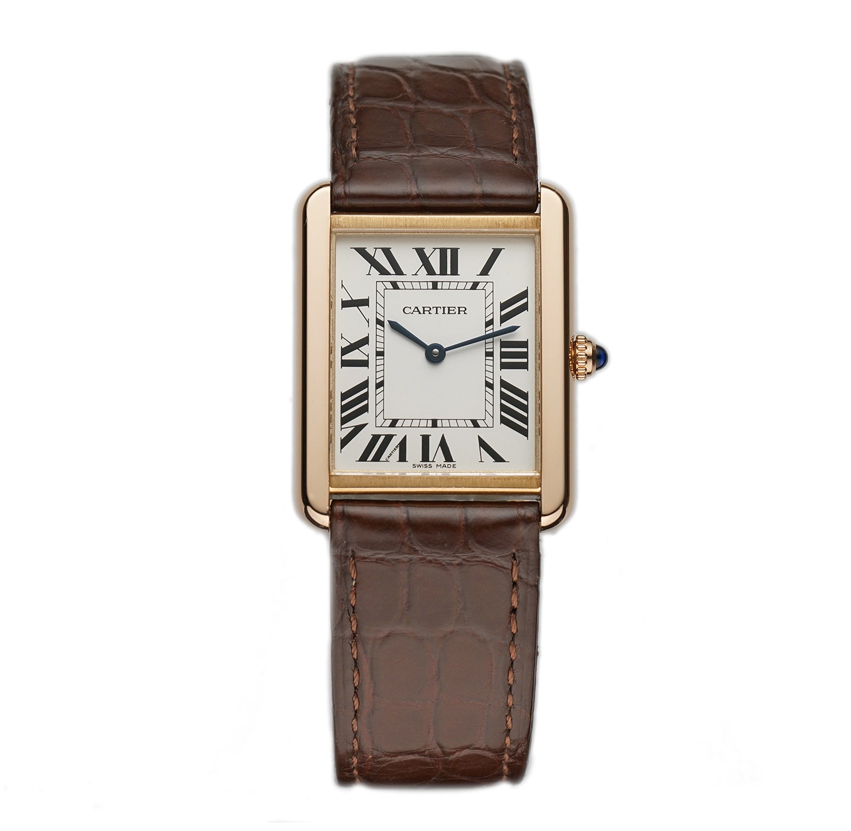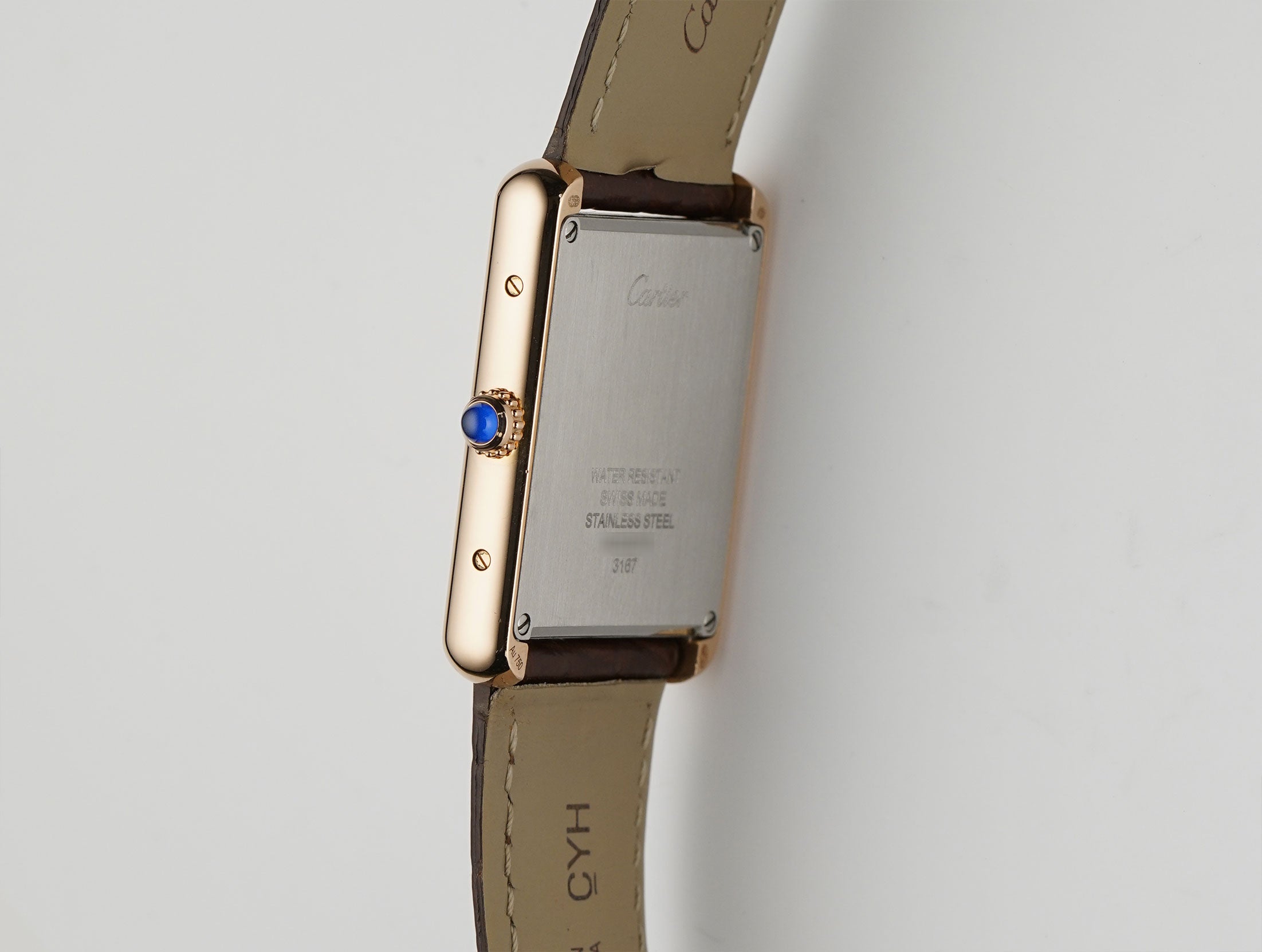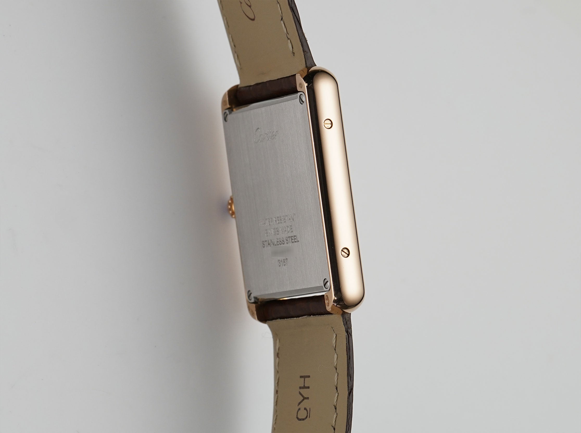 The case is made of 18k rose gold, mostly mirror-finished with hints of satin finish between the lugs. The case back is of stainless steel, featuring a satin finish. Mounted on the watch is a Cartier brown leather strap (approximately 95% condition) and that is paired with a Cartier 18k rose gold tang buckle.