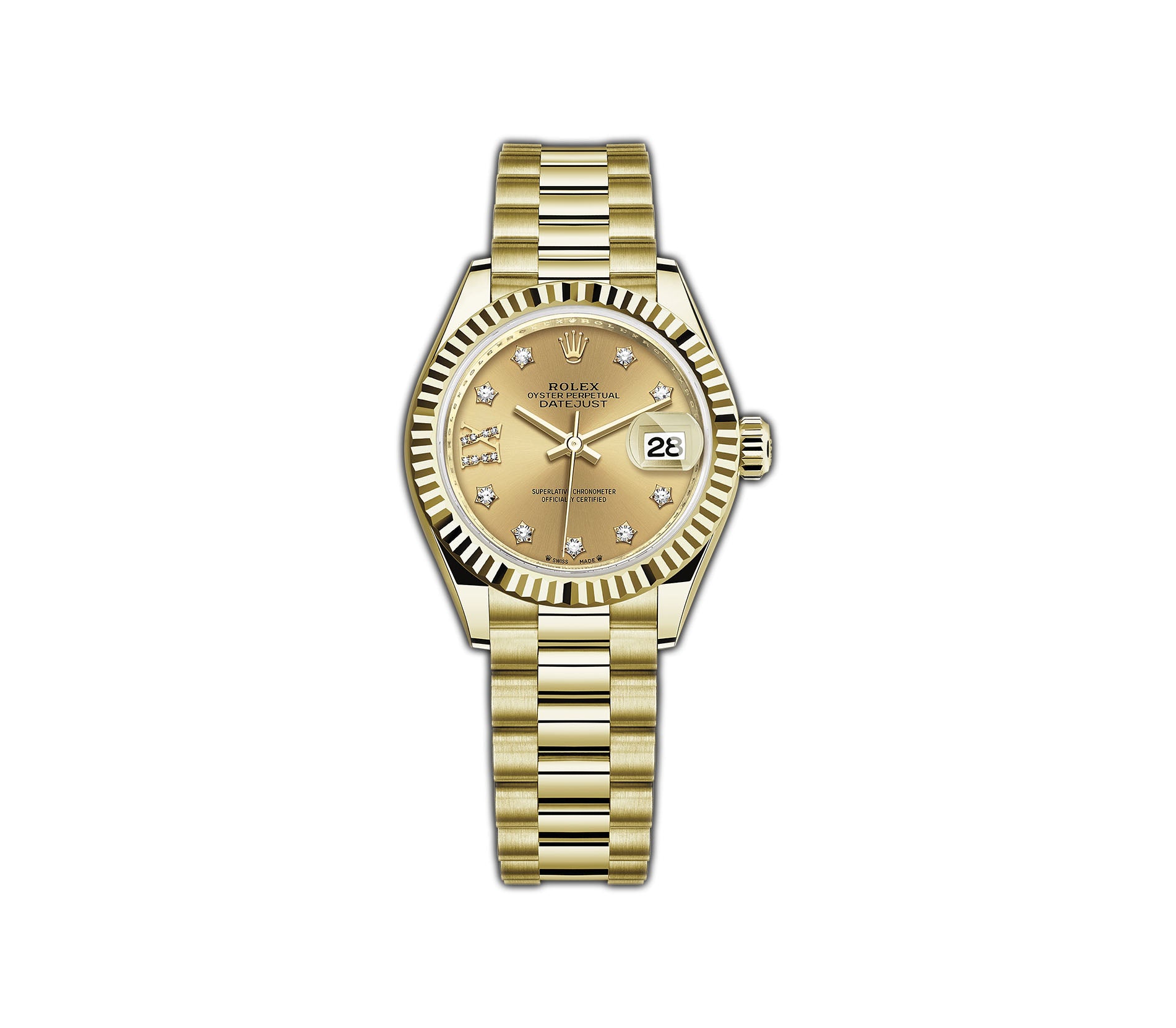 Case is made of high-polish finished 18k yellow gold and mounted atop the case is a high-polish finished fluted 18k yellow gold bezel. Screwed in to the case is an 18k yellow gold crown as well as an 18k yellow gold solid case back with mixed combination of high and satin polish finishes. The president bracelet is of the same material with high polished center links and brush-finished outer links.