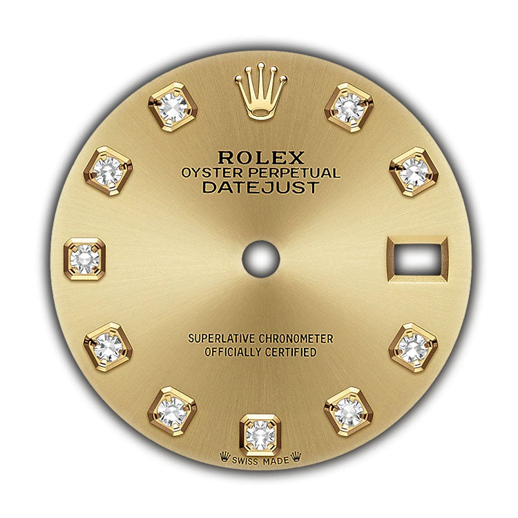 Functions are displayed on a champagne diamond dial with a date aperture at 3'o clock.