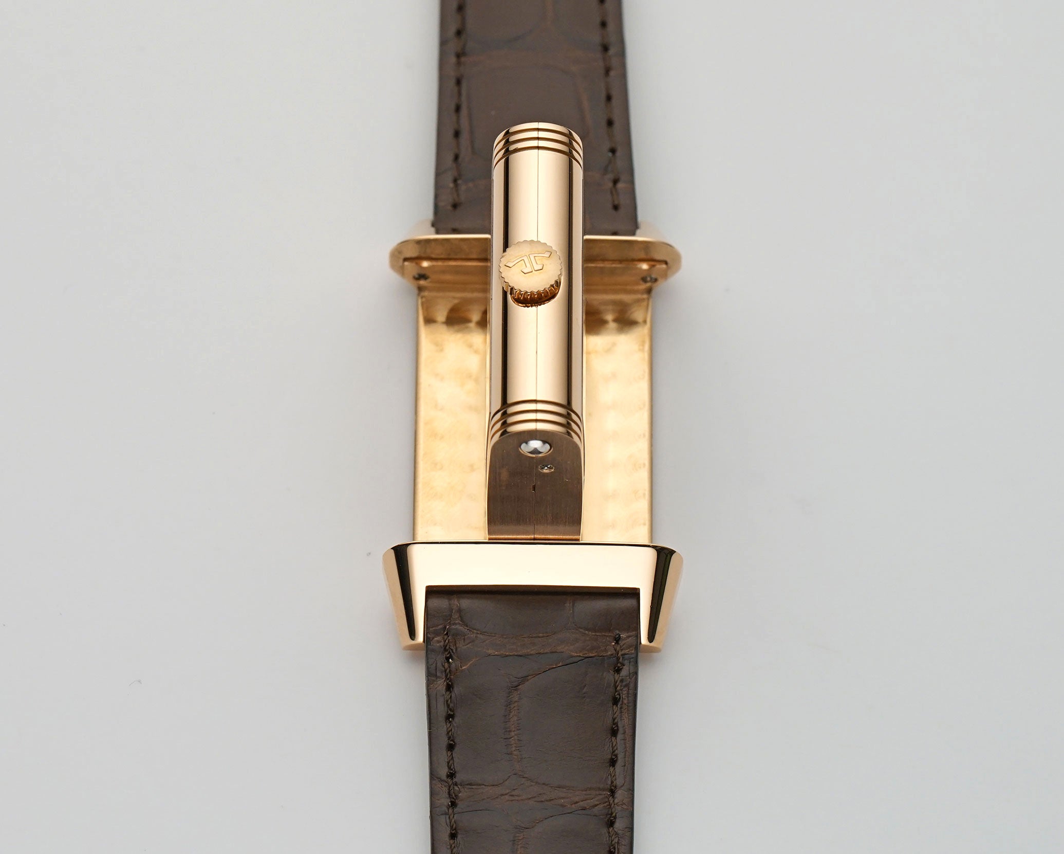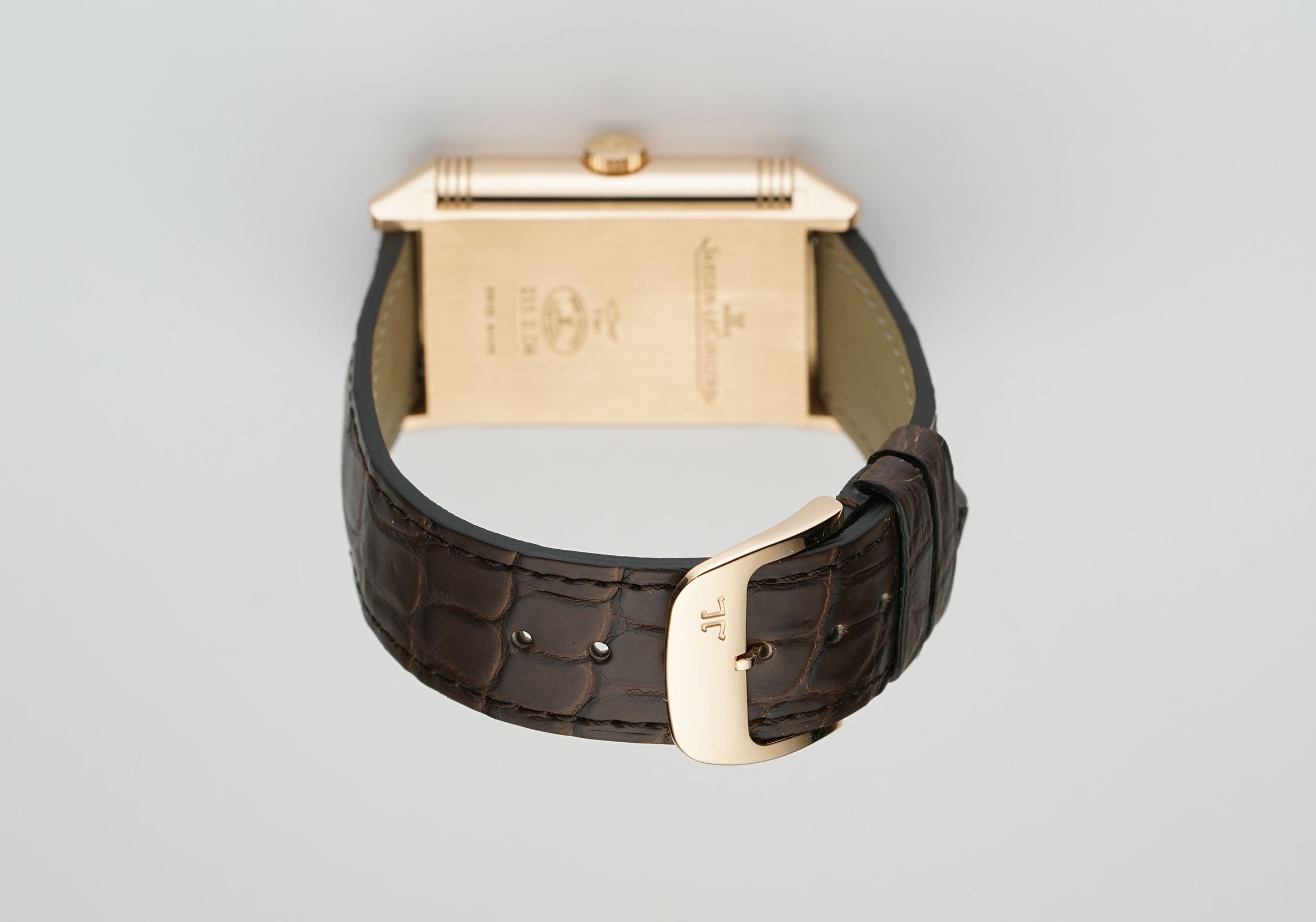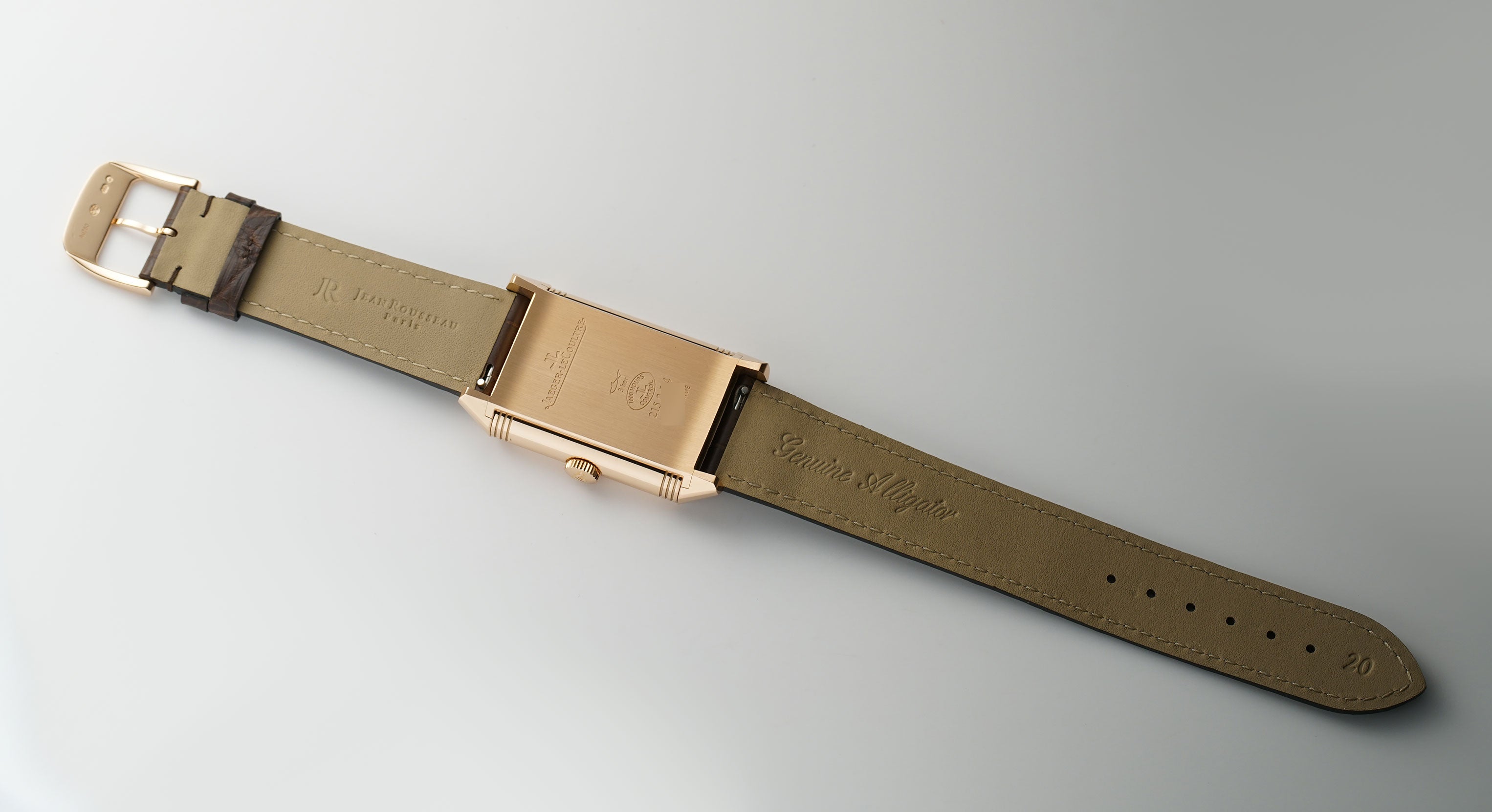 The case is made of 18k rose gold, mostly displaying a mirror finish with the exception of the case back that has a satin finish and the inner carriage that shows a spun finish. It is paired with an unworn John Rousseau (high-quality Paris-made) brown leather strap and 18k rose gold JLC tang buckle.