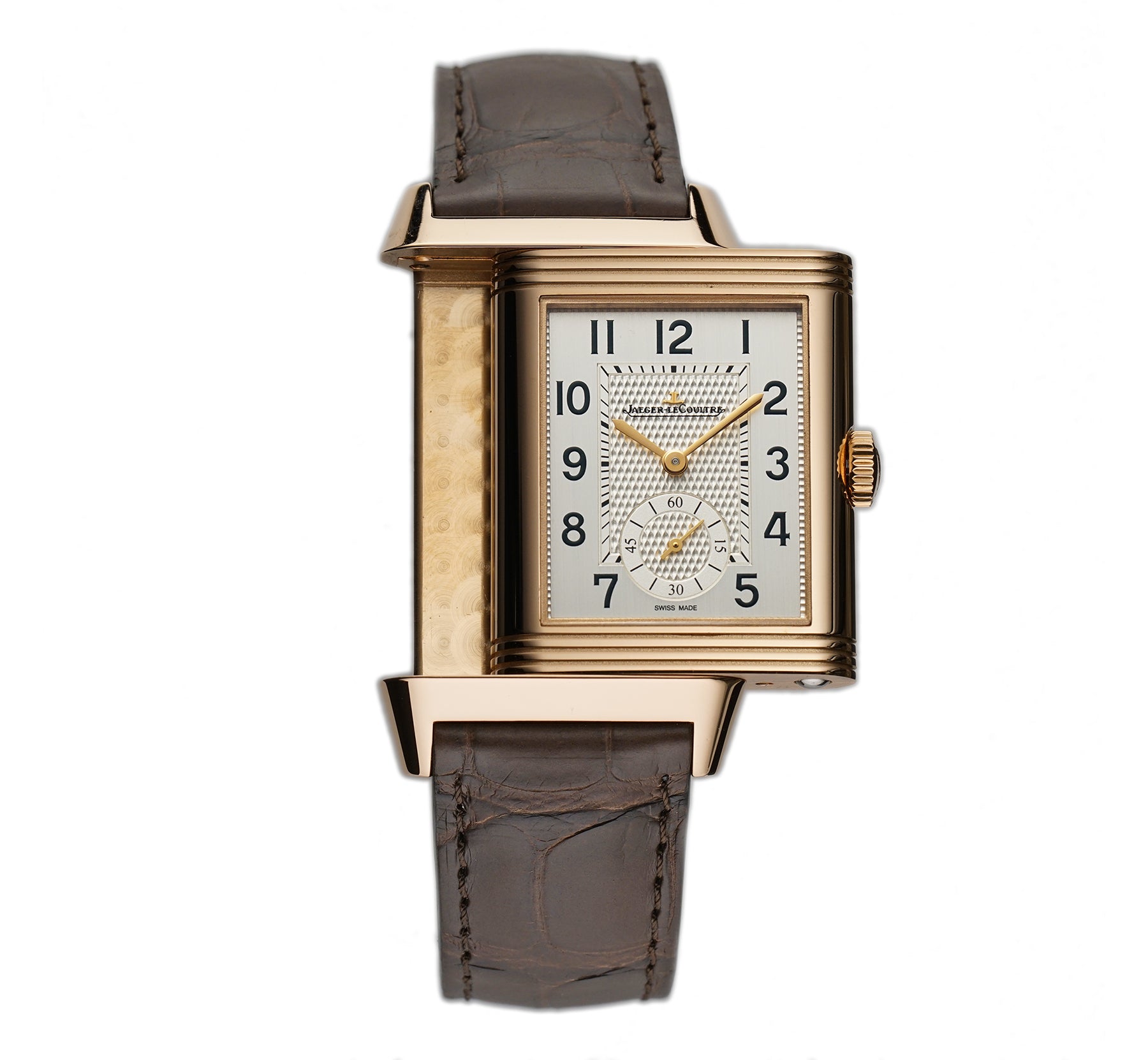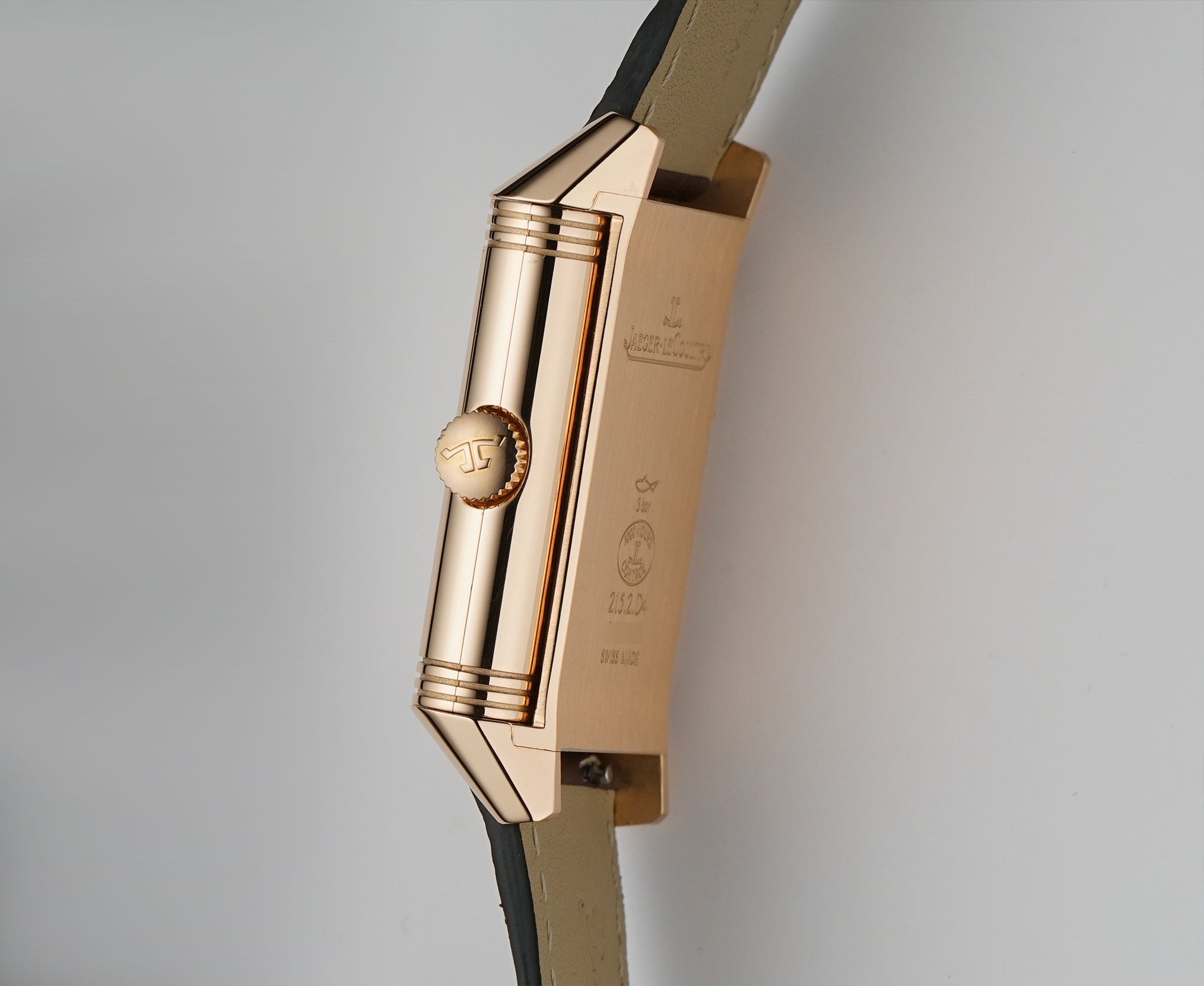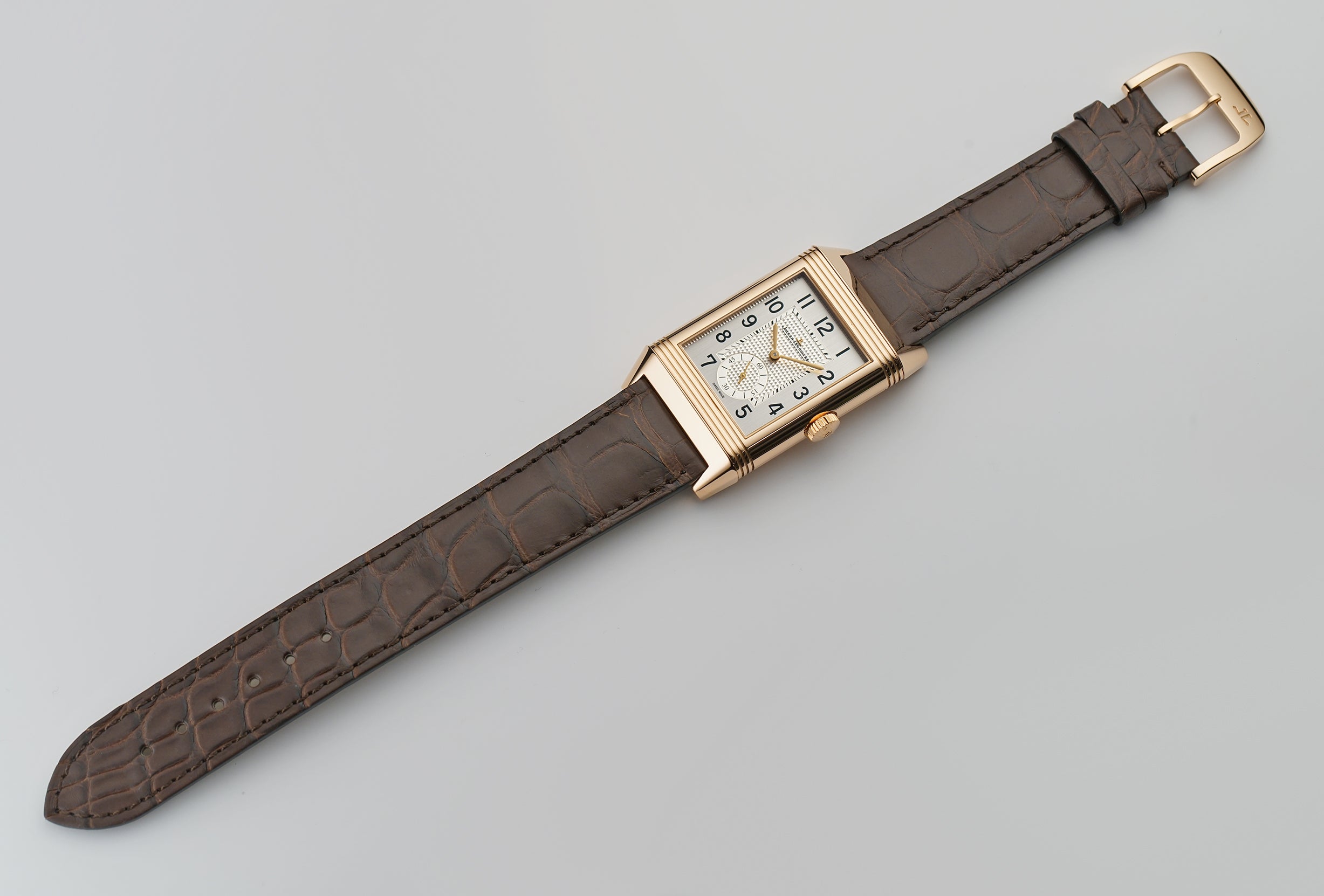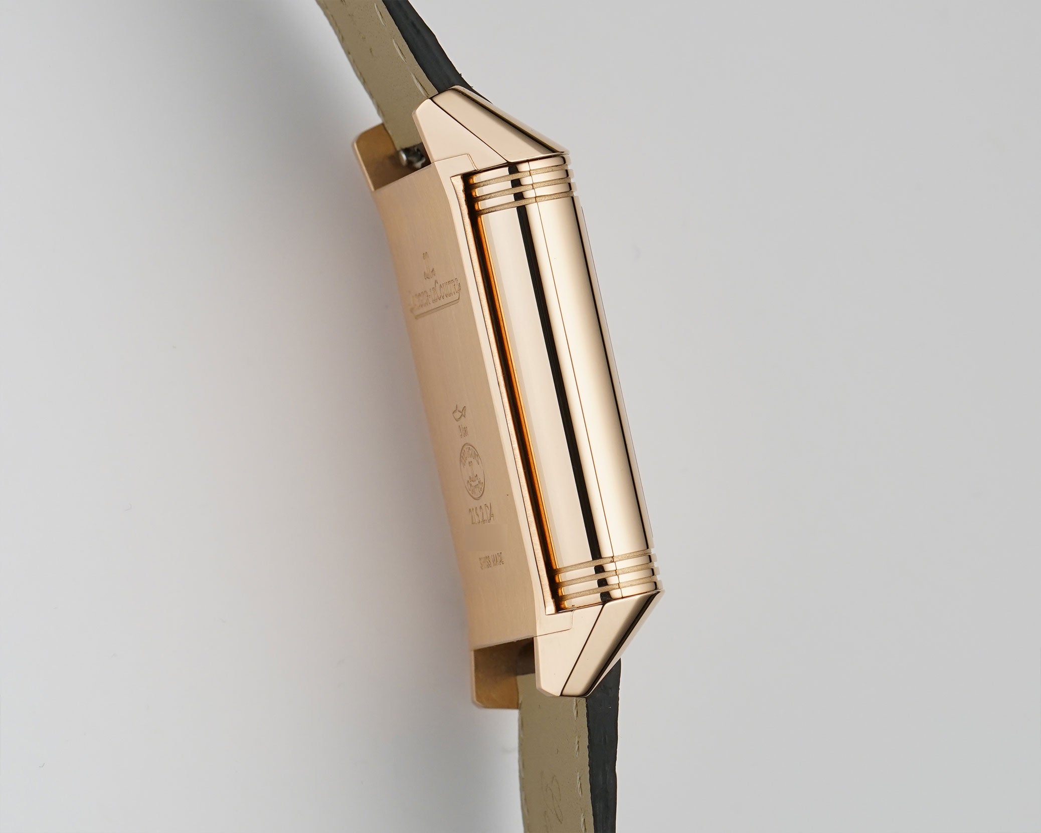 The case is made of 18k rose gold, mostly displaying a mirror finish with the exception of the case back that has a satin finish and the inner carriage that shows a spun finish. It is paired with an unworn John Rousseau (high-quality Paris-made) brown leather strap and 18k rose gold JLC tang buckle.