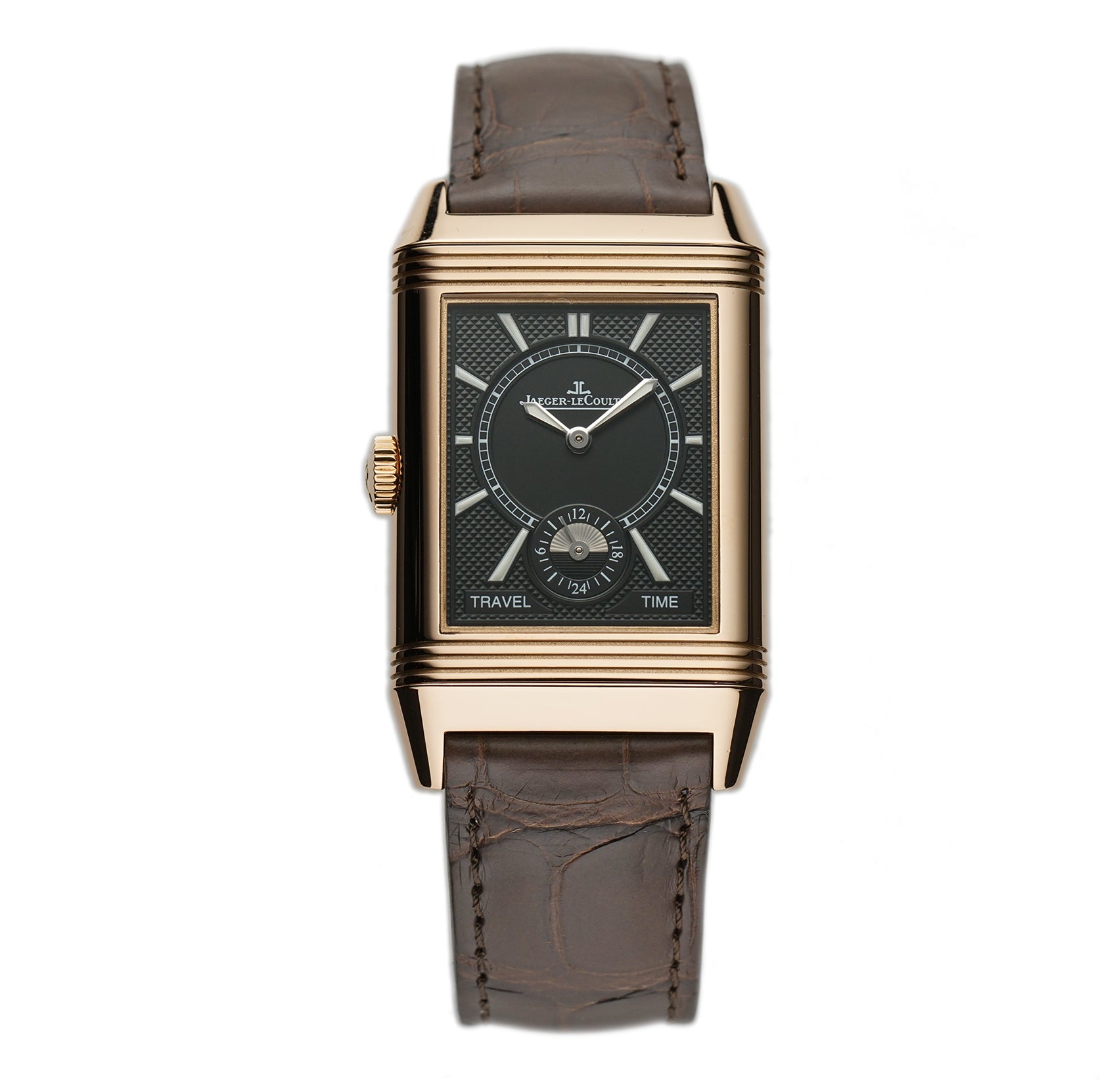 The main face features a silver dial with rose gold hands, black Arabic numeral hour markers as well as a small seconds sub-dial. The reverse face displays a black dial that has a second time zone function as well as a 24-hour sub-dial.