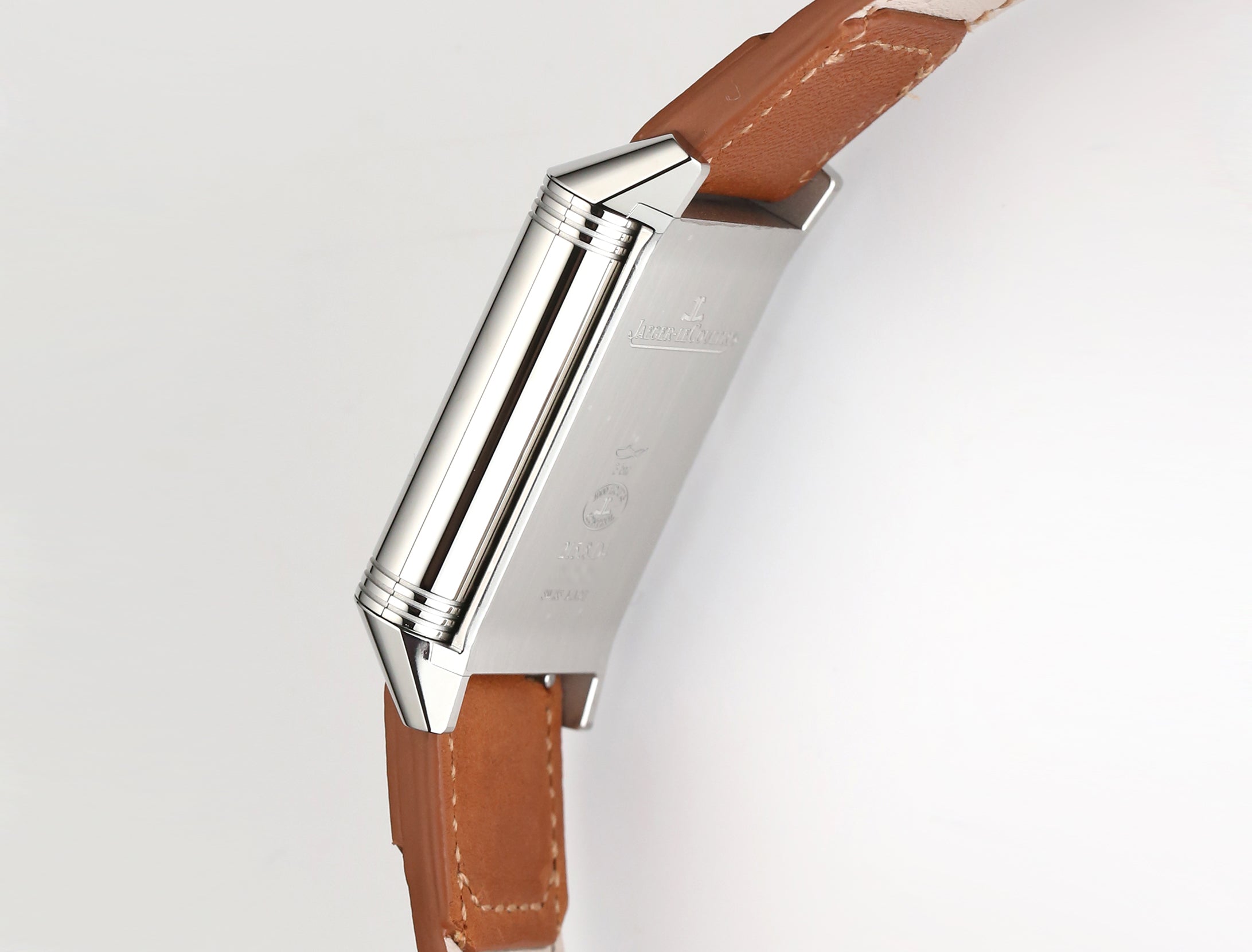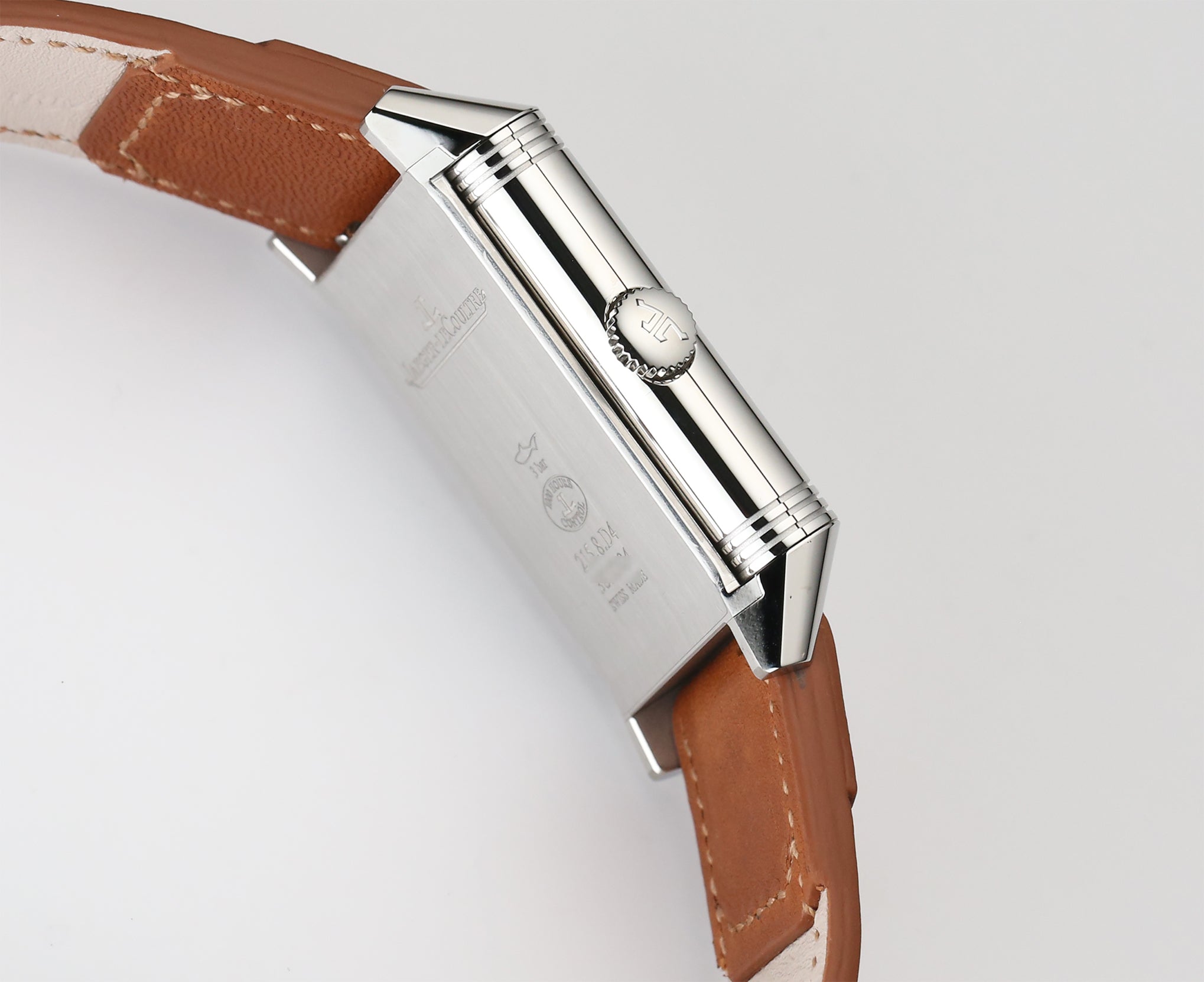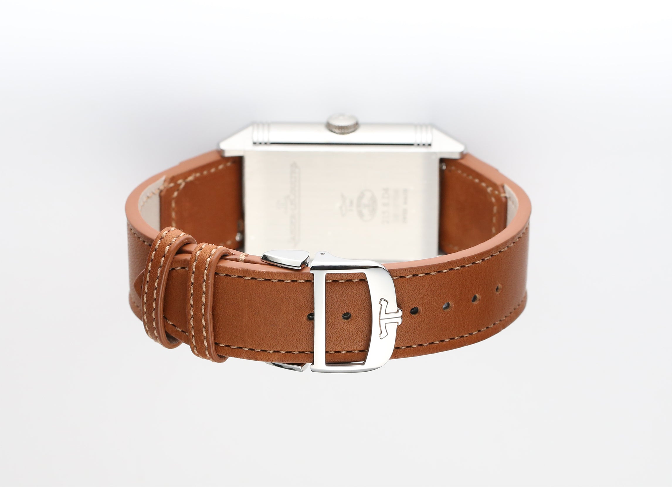 The case is made of stainless steel, most of which has a mirror finish with the exception of the case back that has a satin finish and the inner carriage which displays a spun finish. It is paired with a brown leather strap that is equipped with a double-folding deployment buckle.