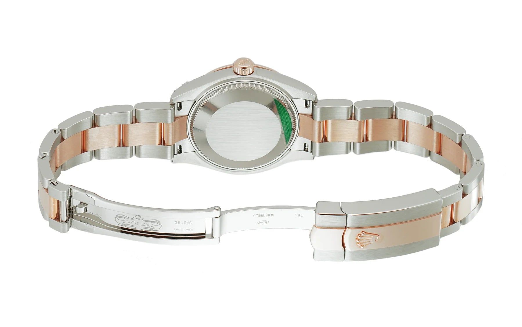 Case is made of high-polish finished stainless steel and it is equipped with a high-polish finished 18k everose gold fluted bezel. Screwed into the case is an 18k everose gold crown as well as a solid stainless steel case back. As for the bracelet it is of both stainless steel and 18k everose gold with brush-finished outer links and high-polish finished center links.