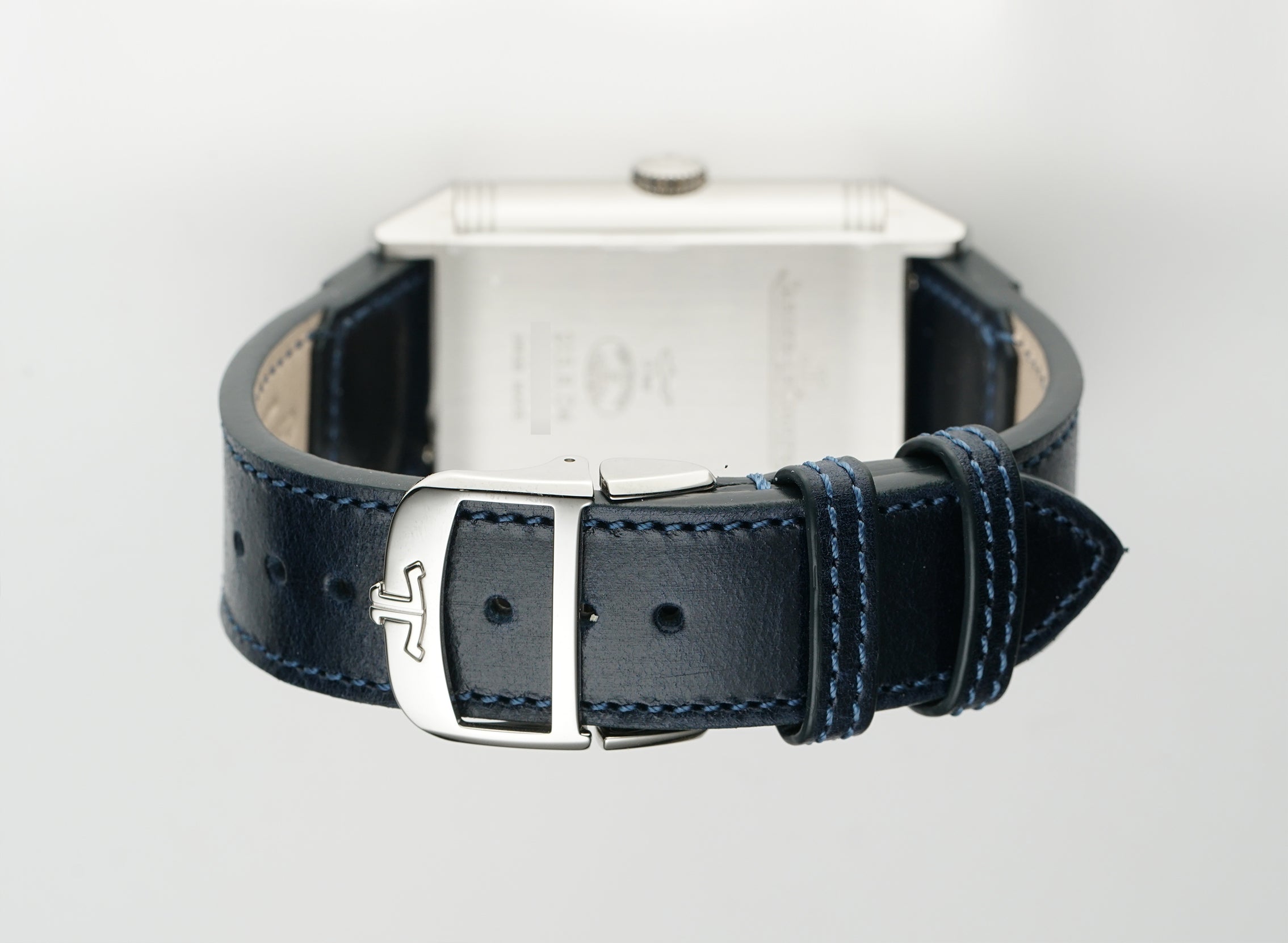 The case is made of a mirror finish stainless steel including the crown. This watch is paired with a blue leather strap with an stainless steel double folding buckle. Watch comes with a secondary blue strap in a combination of leather and canvas.