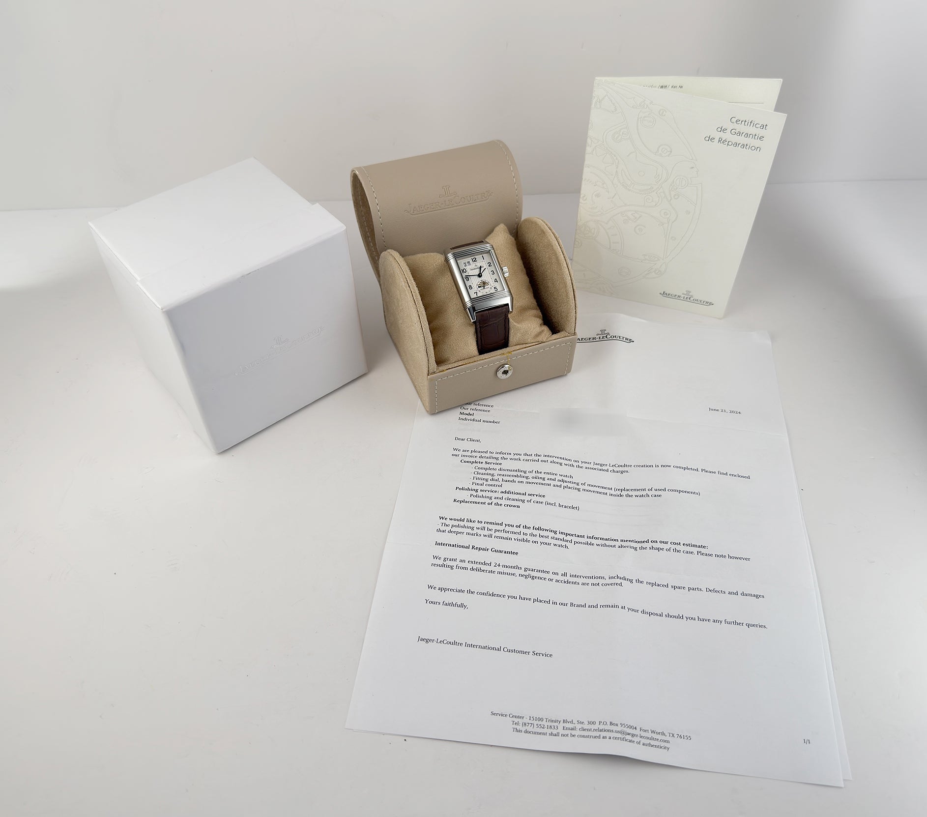 Included with the watch is a JLC travel box. (the original presentation box is not included,original warranty certificate (2007) as well as service papers from JLC (serviced in June of 2024). This implies a 2-year warranty through JLC from that date.