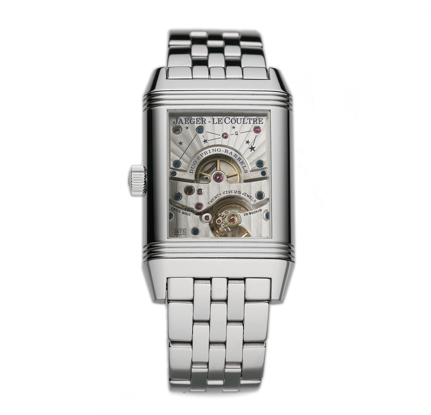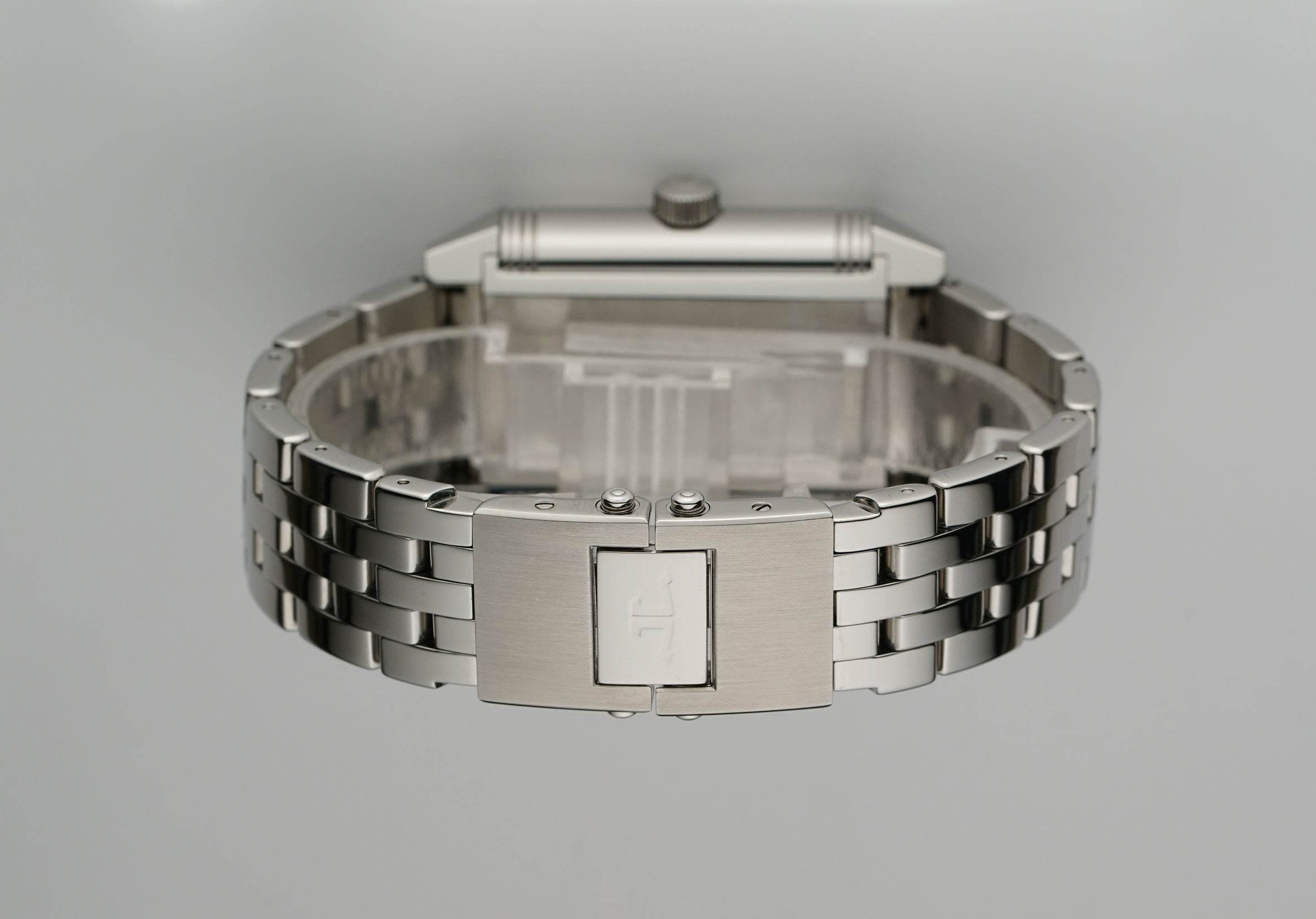 The case is made of stainless steel, mostly displaying a mirror finish with the exception of the case back which has a satin finish and the inner carriage which has a spun finish. It is paired with a JLC stainless steel bracelet (fits up to an approximate 7 inch wrist) and that is equipped with a JLC stainless steel double-folding deployment clasp.